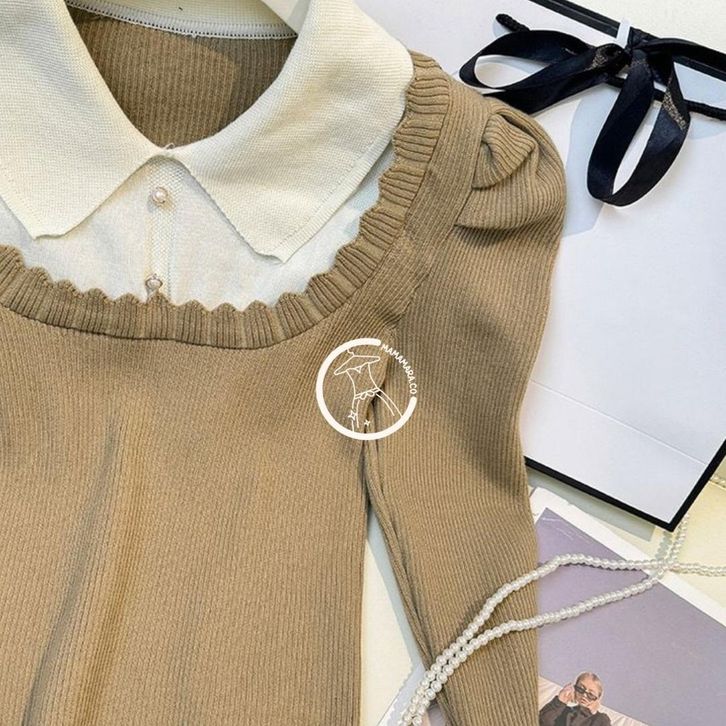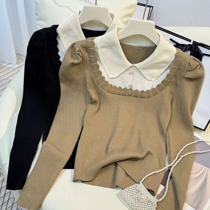 Baju Wanita Korea Style Mamamara Atasan Wanita Lace Kerah Rajut Knitwear Inner Fit Body Wol Santai