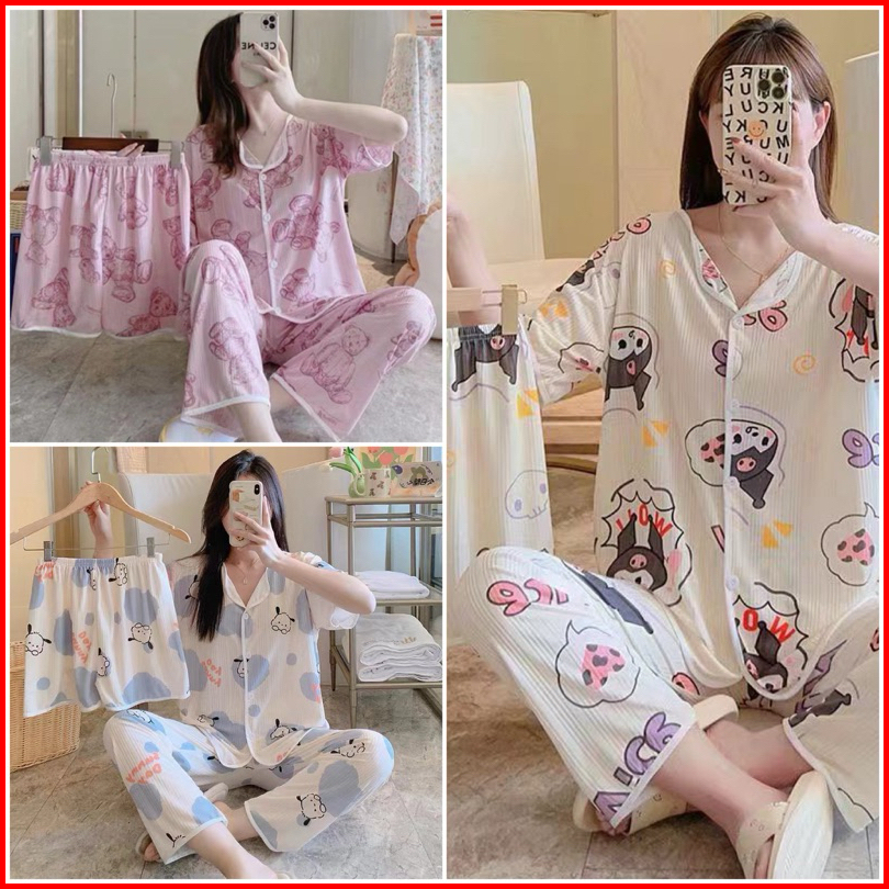 Setelan Baju Tidur Piyama Import Wanita Korea Lengan Pendek 3in1 Piyama Wanita