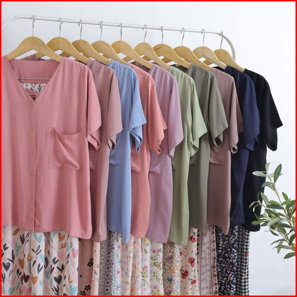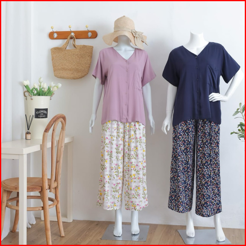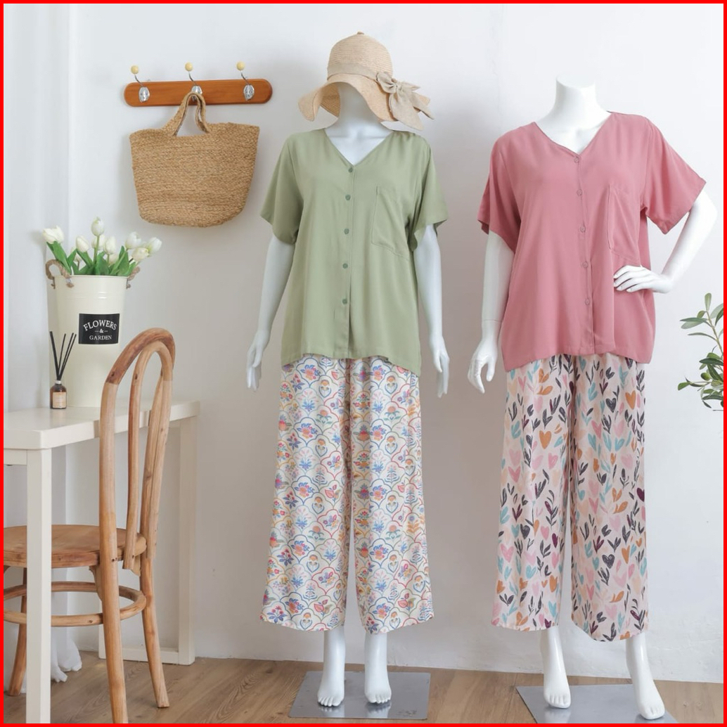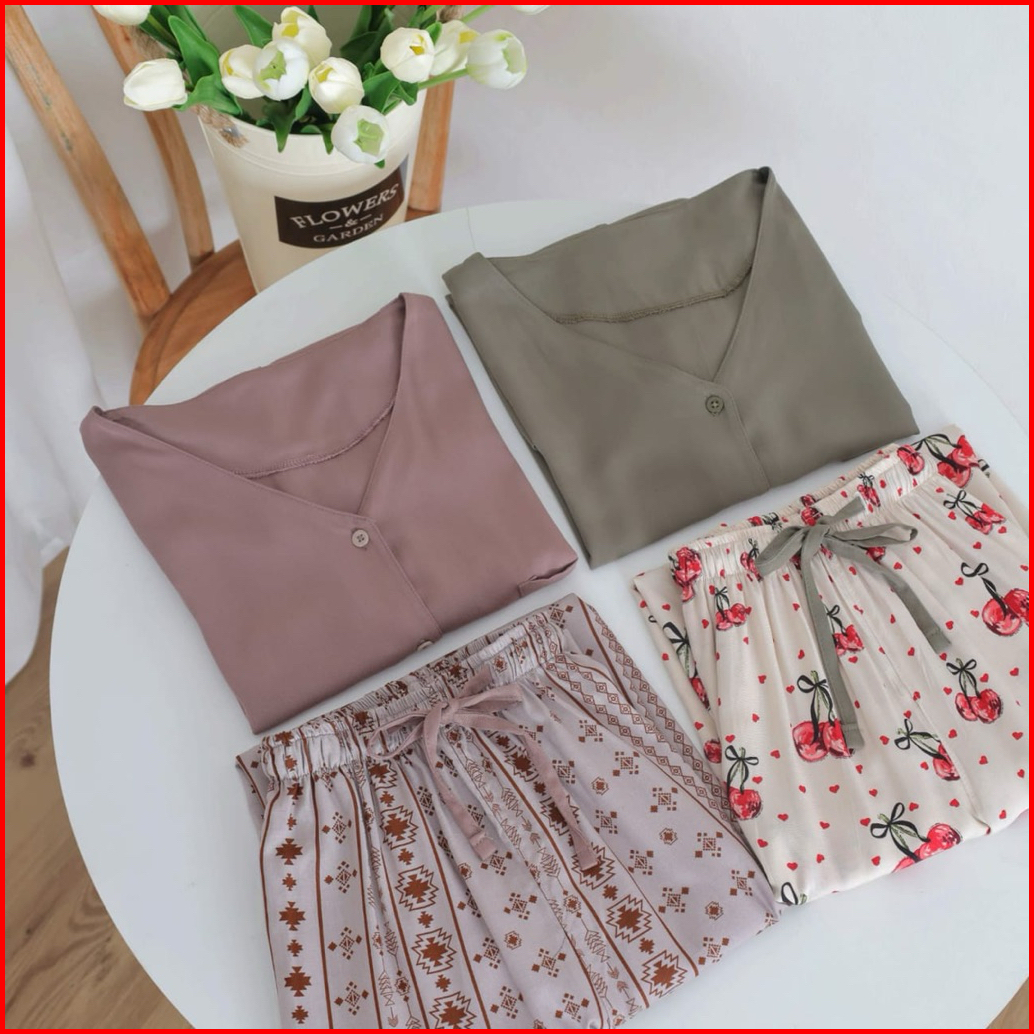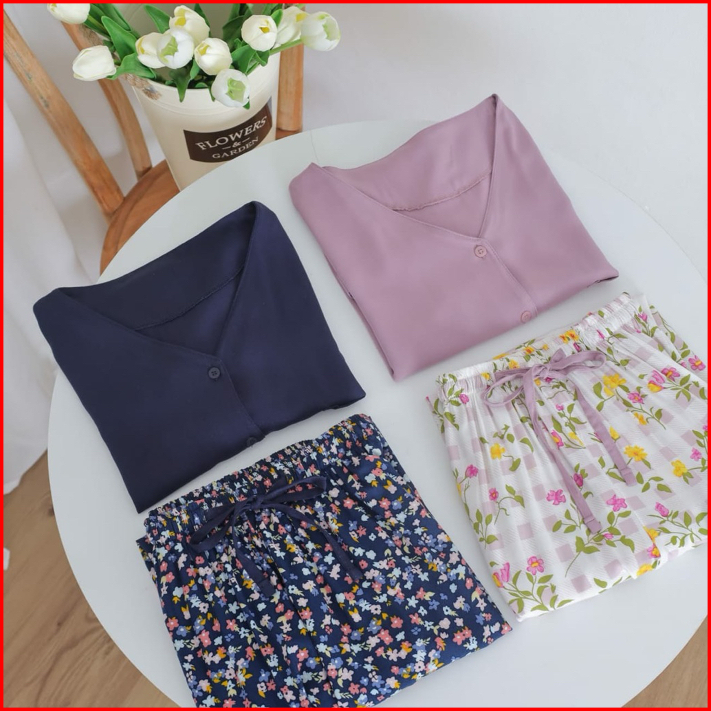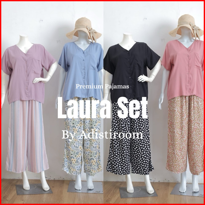 Laura Set Pajamas Rayon Adistiroom Piyama Tidur Wanita Piyama Kancing Busui Friendly Lengan Pendek Celana Panjang Piyama