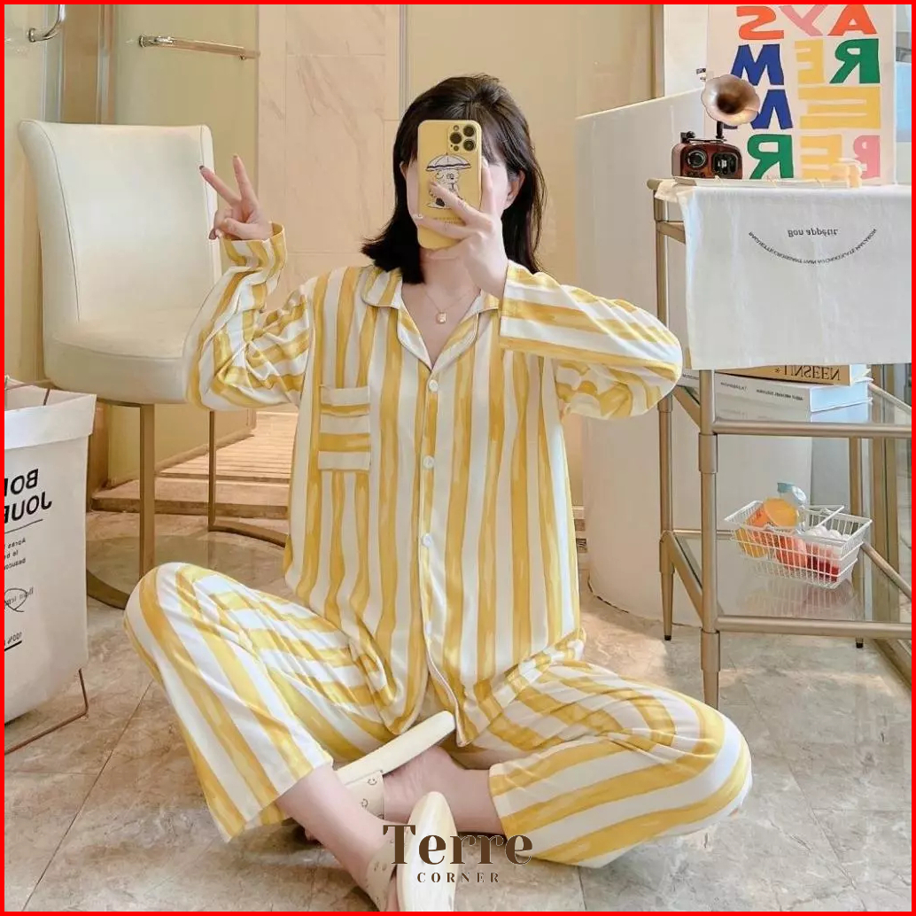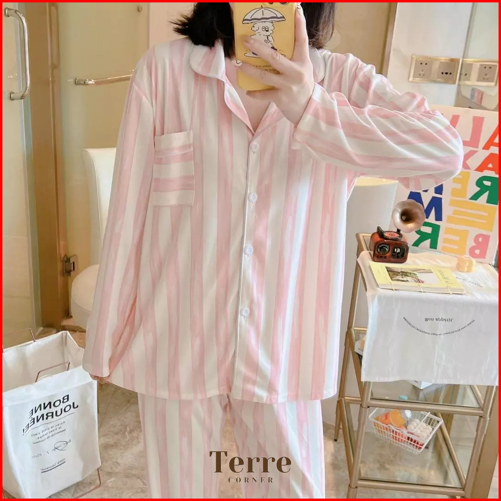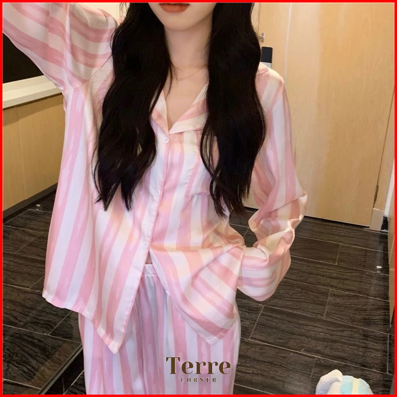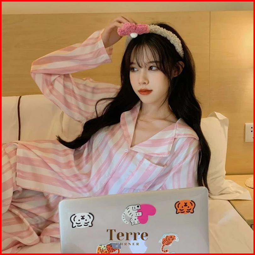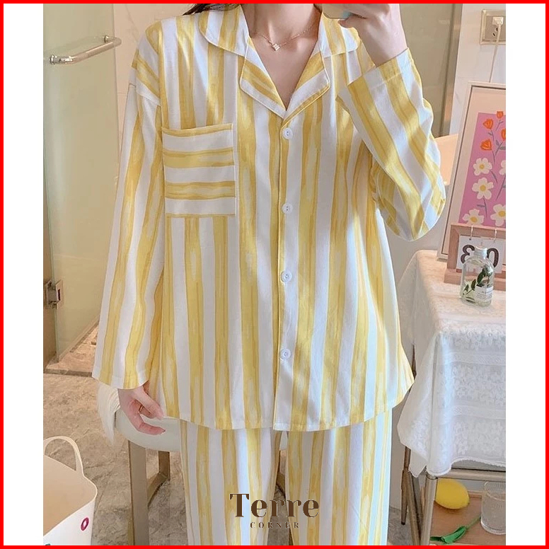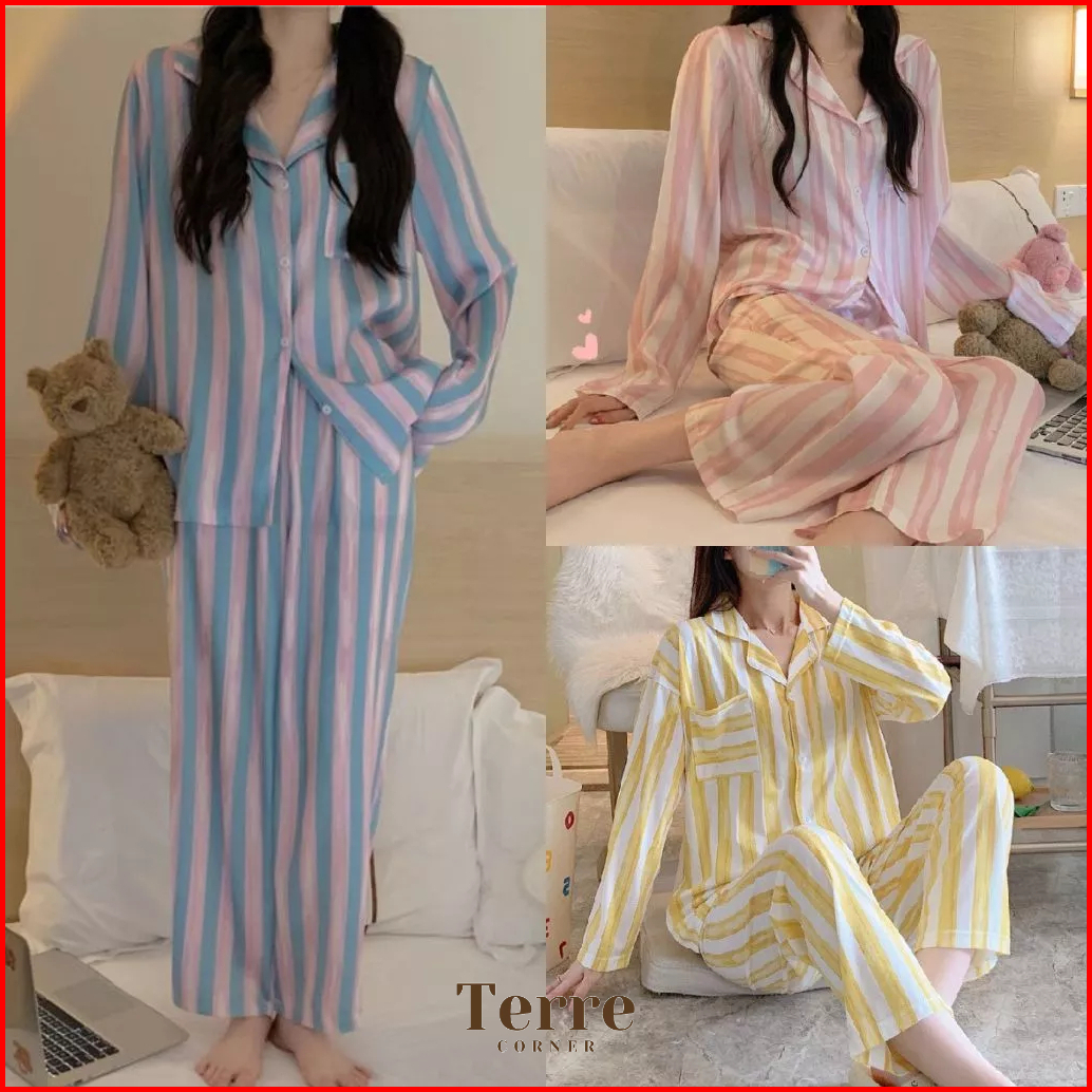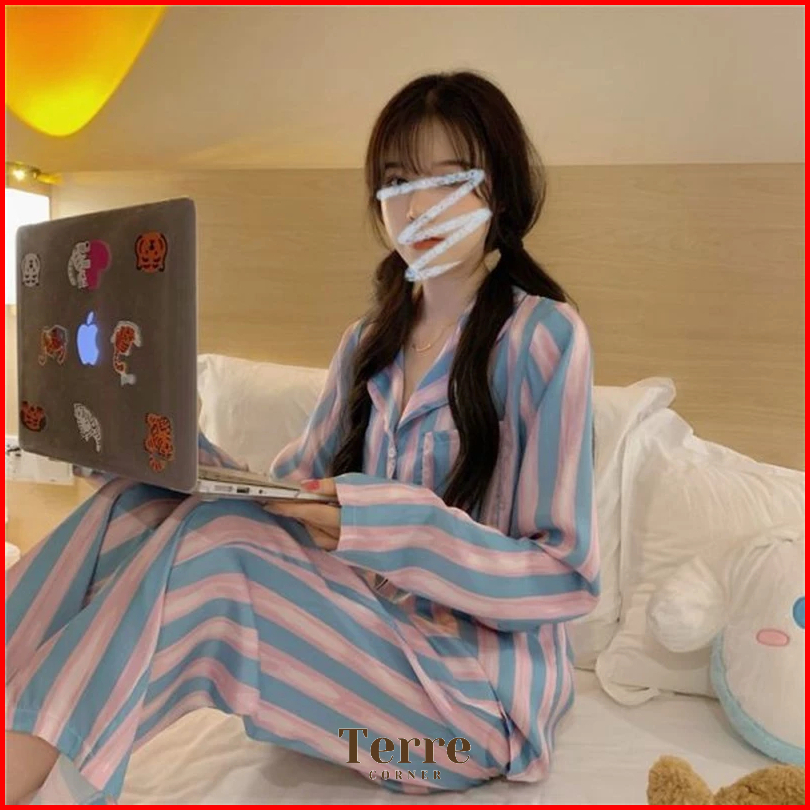 Joo Mi Piyama Baju Tidur Korea Wanita Sleepwear Import Lengan Panjang Celana Panjang Motif Garis