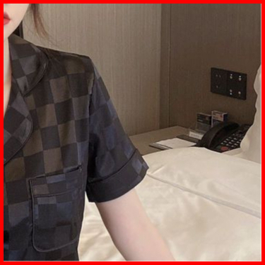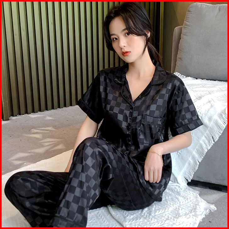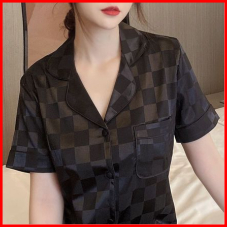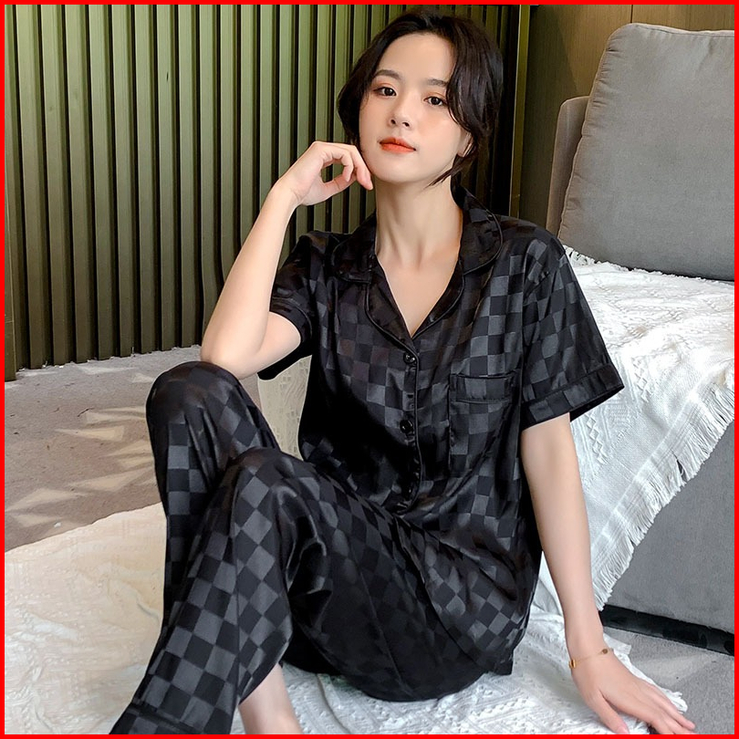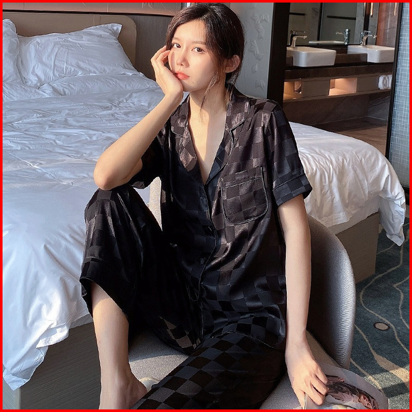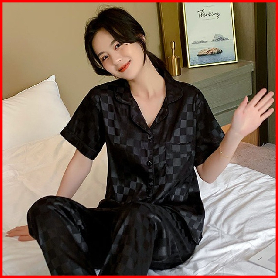 Stelan Piyama Baju Tidur Sleepwear Import Korean Look Premium Ice Silk Wanita Dewasa Lengan Pendek Deep Kerah Button Kan
