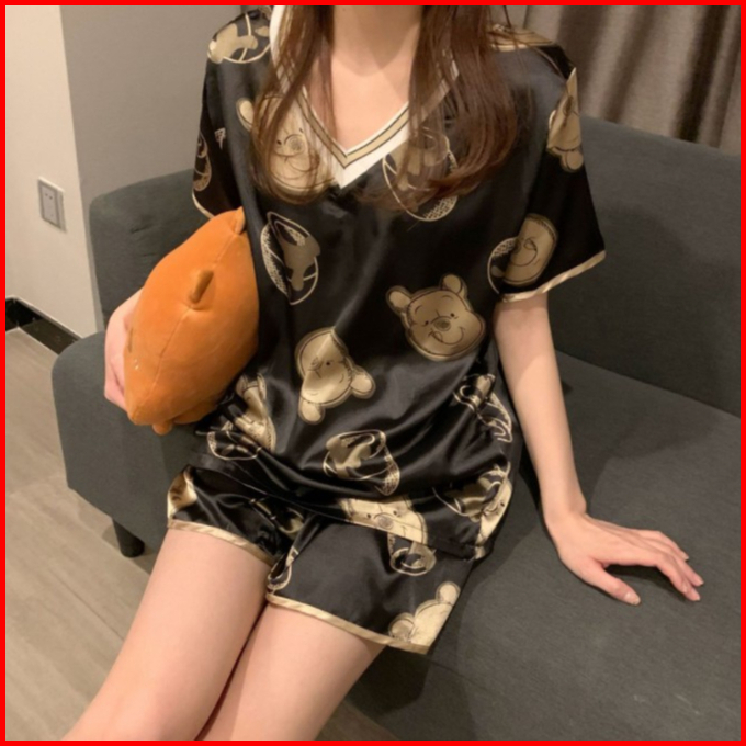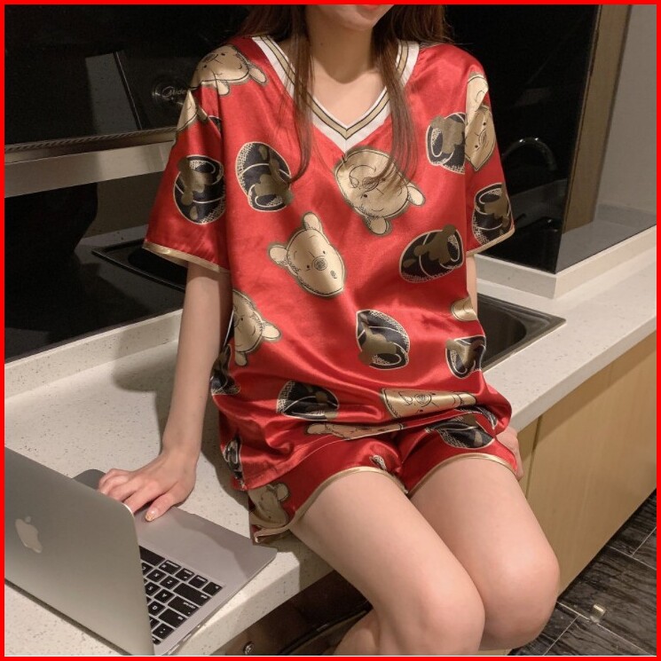Toyou Shop M42 Set Baju Tidur Satin Baju Tidur Wanita V-neck Satin Piyama Satin