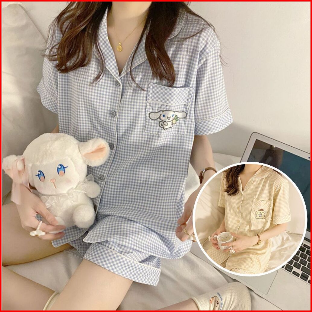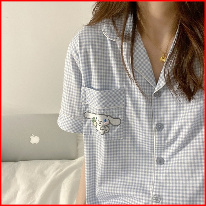 Zuyee Sleepwear Piyama Korea Baju Tidur Wanita Kancing Lengan Pendek Celana Pendek Motif Kotak Karakter