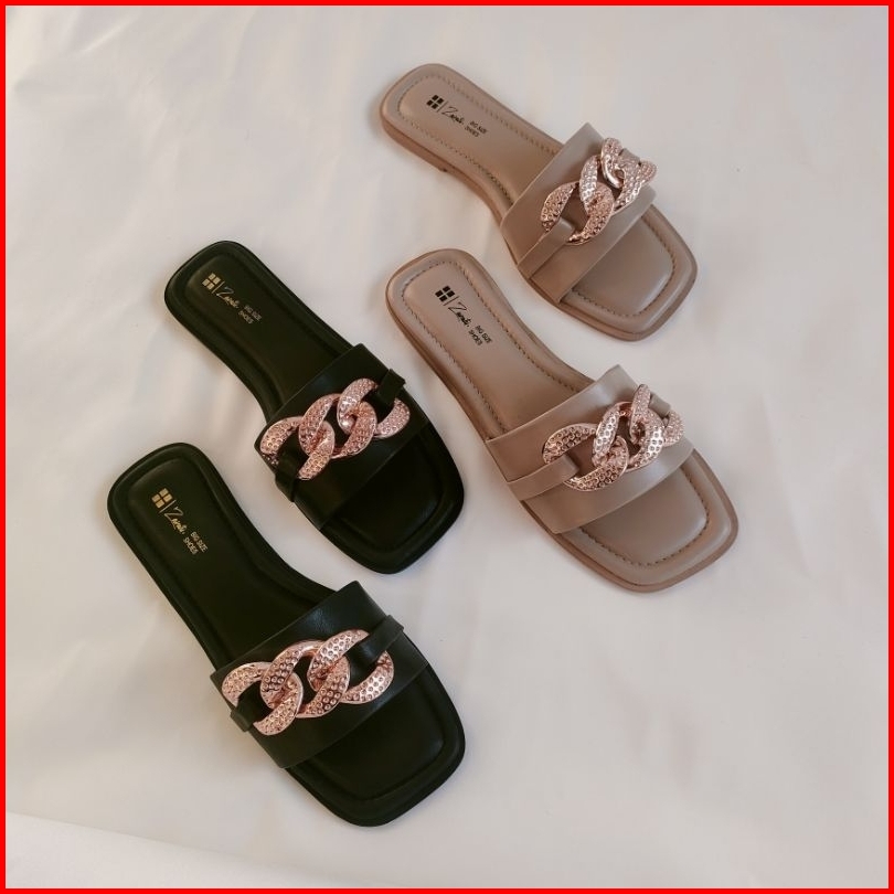 Zavatu - Sandal Teplek Flat Slop Wanita Ban Satu Gesper Rante Empuk Size Jumbo Ukuran 41-45 Zvt 453