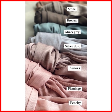 Silver dust, Peachy, Aurora, Stone, Minty grey, Browny, Flamingo, Goldy caramel, Dark grey, Rosy brown, Black, Ash beige, Blush, Misty grey, Grey