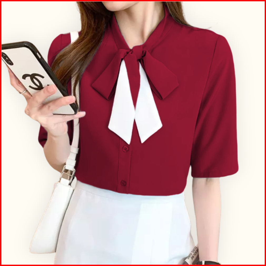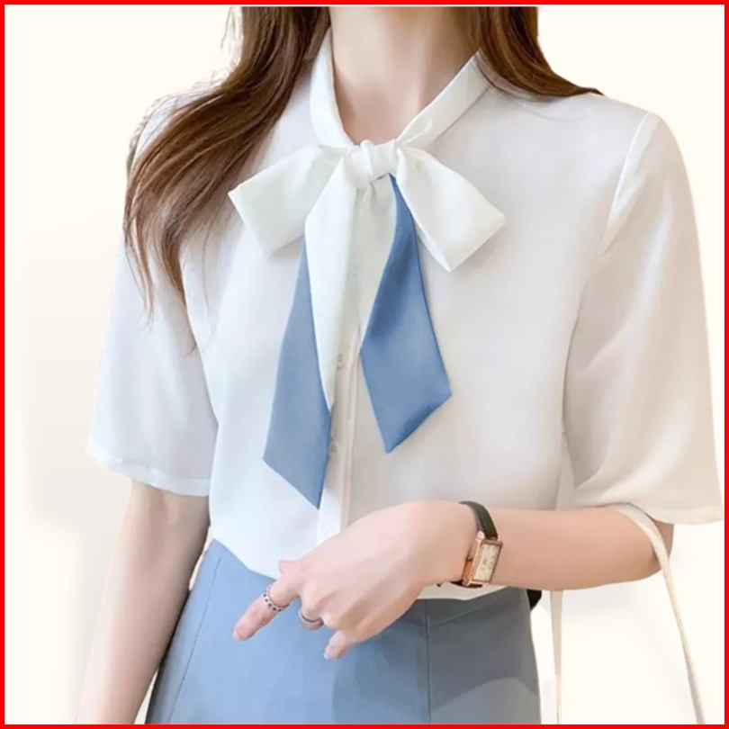 Kemeja Lengan Pendek Wanita Gaya Korea Variasi Pita Model Terbaru - Arshinta