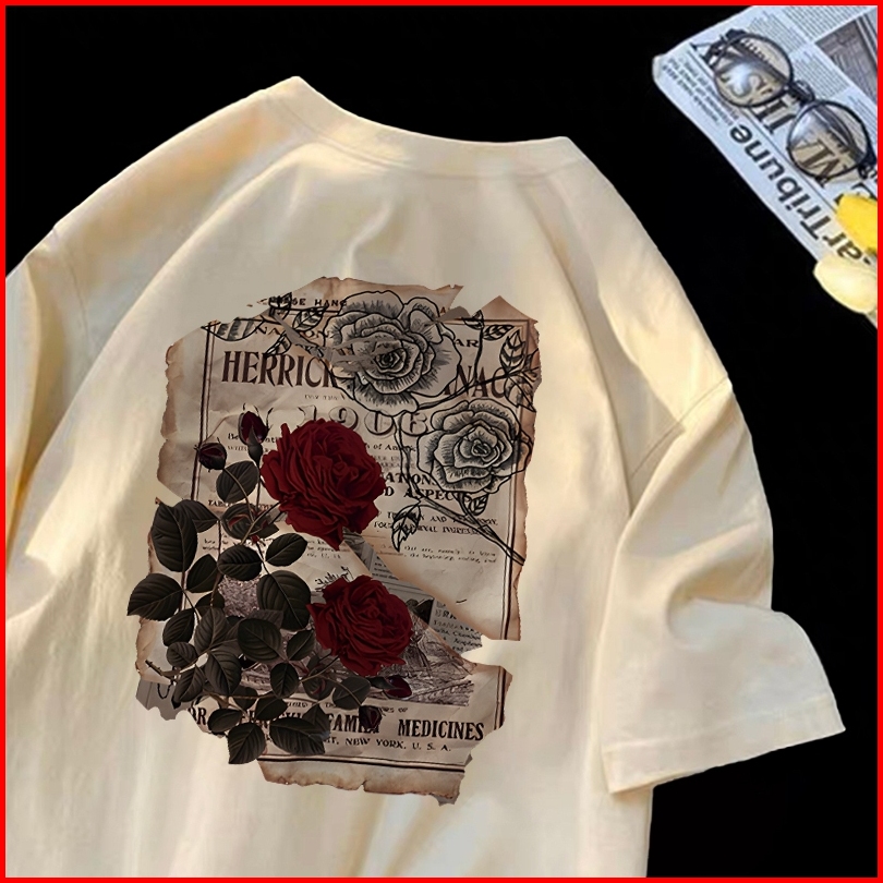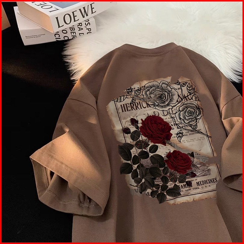 Forteid I0175cetakan Mawar Antik Tshirt Kekinian Korean Style Kaos Oversize Wanita 100 Cotton