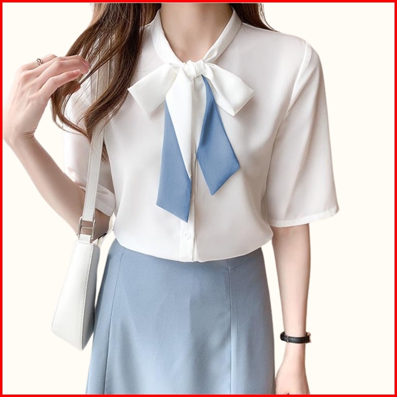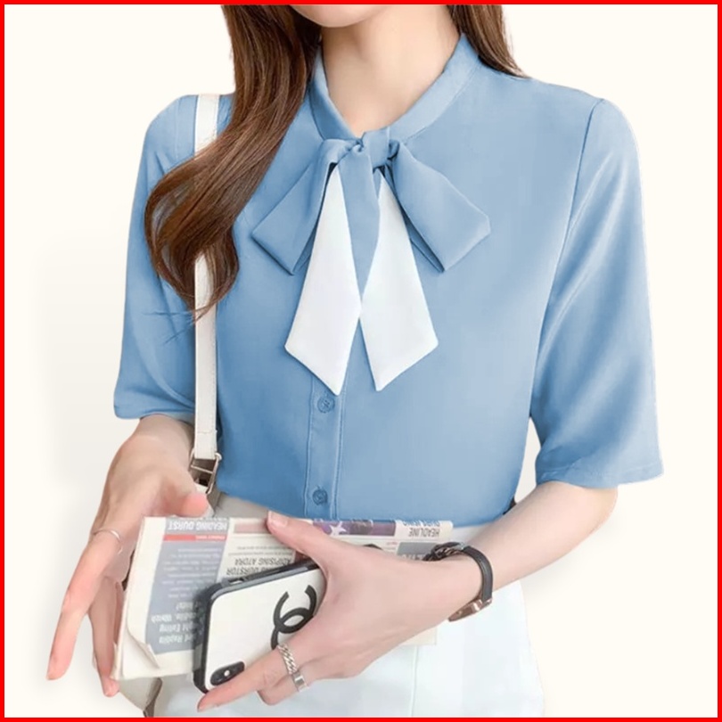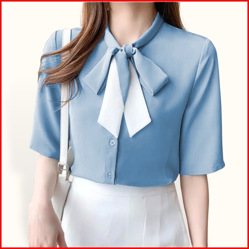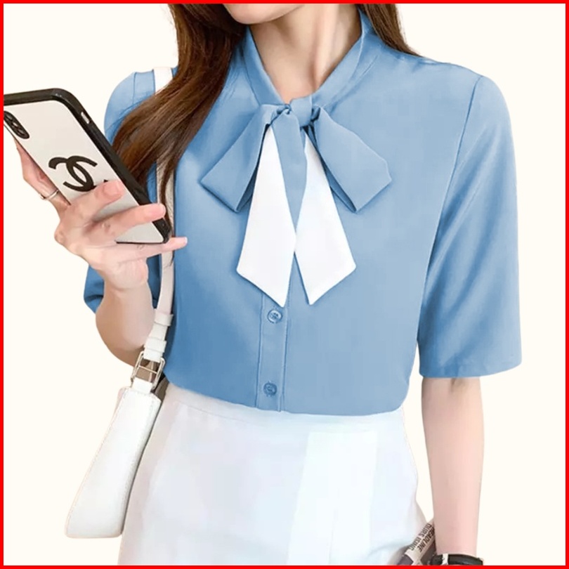 Kemeja Lengan Pendek Wanita Gaya Korea Variasi Pita Model Terbaru - Xshop Arshinta