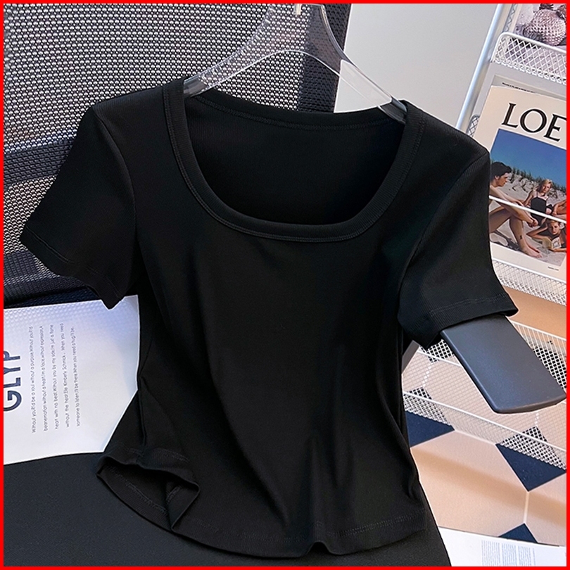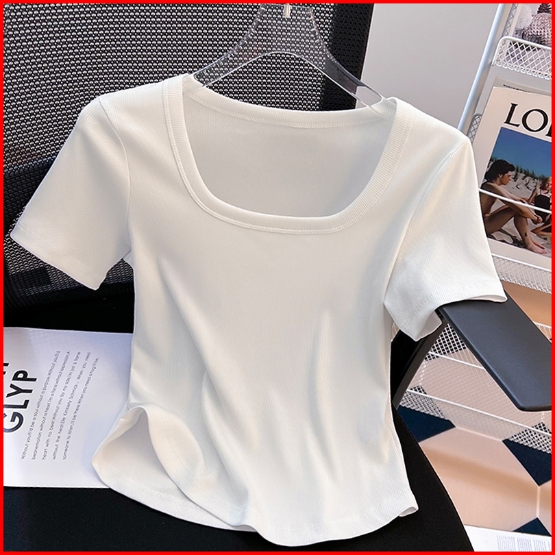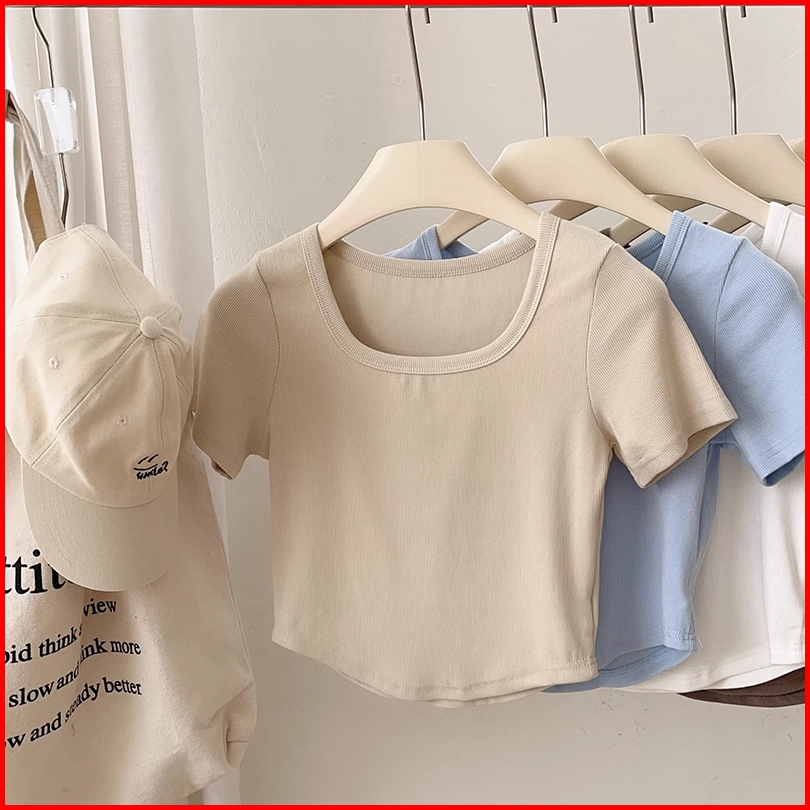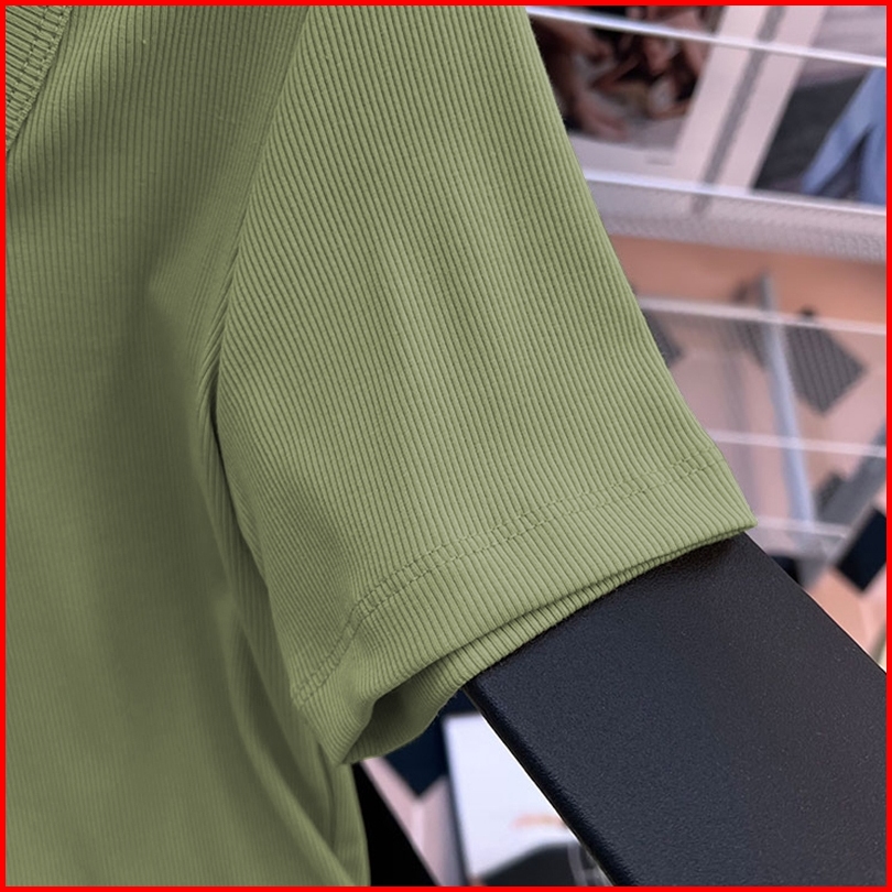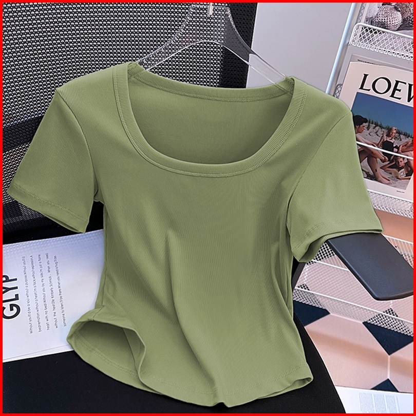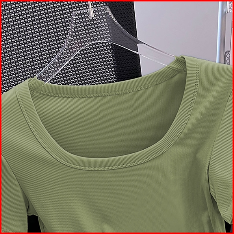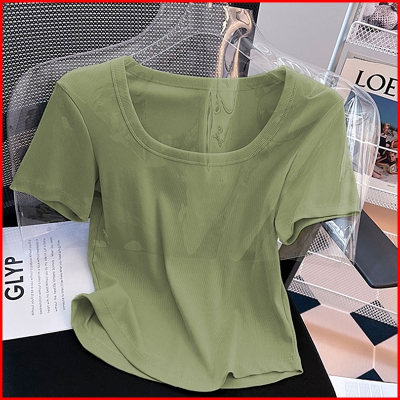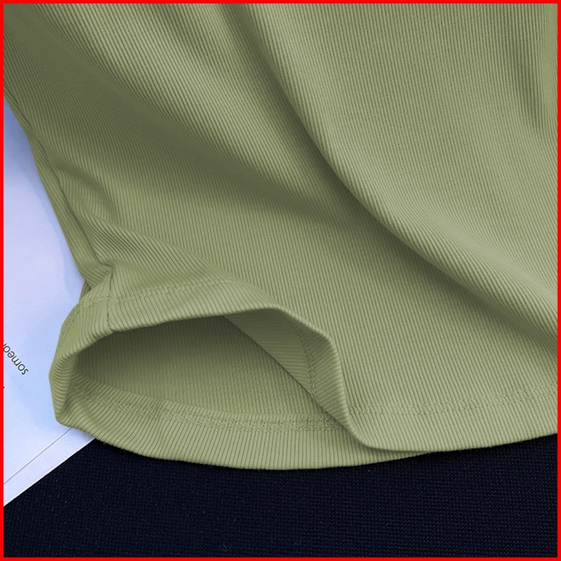 Kaos Scoop Neck Berusuk Premium Kaos Crop Wanita Korea Atasan Kaus Ketat Melar Tidak Teratur Berwarna Hijau Baru