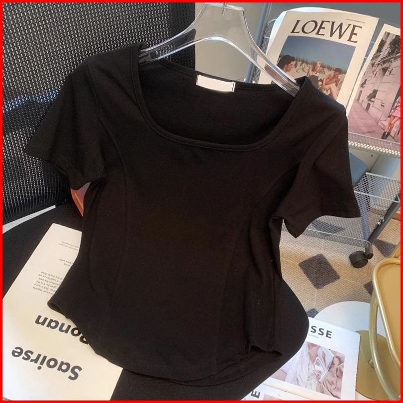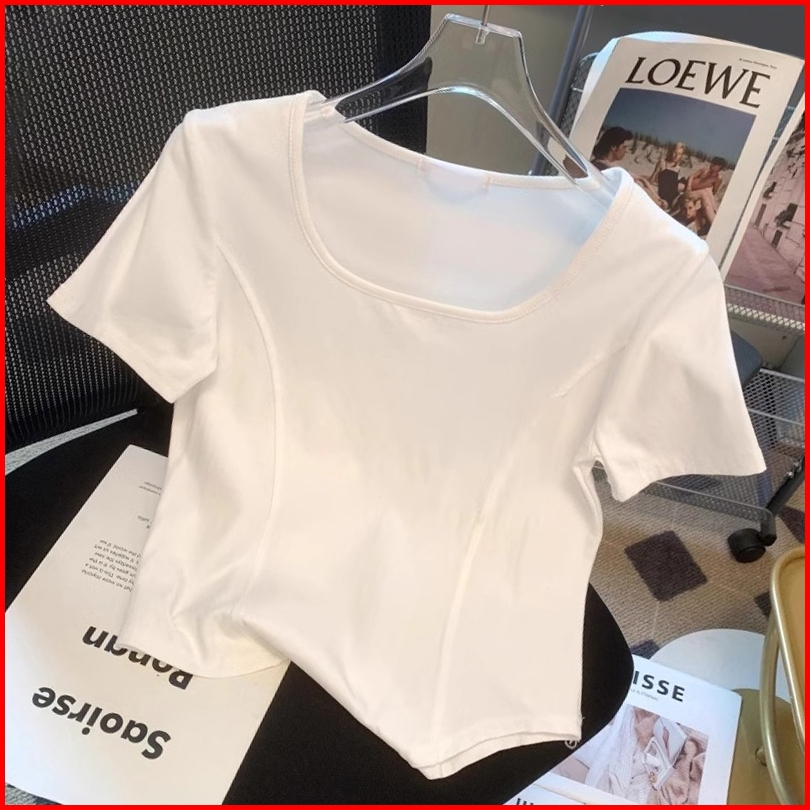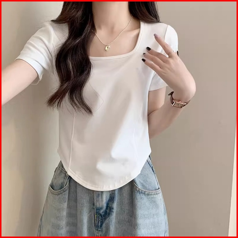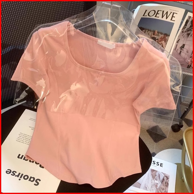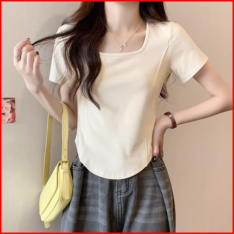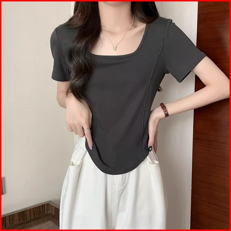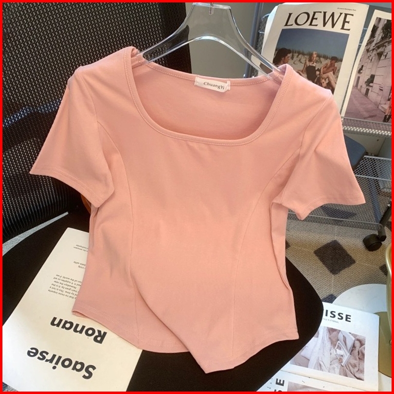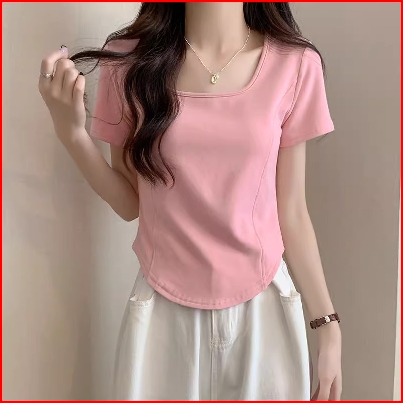 Kaos Ceop Top Wanita Kaos Leher Persegi Warna Pink Terbaru Kaos Crop Wanita Korea Kaos Melar Yang Ketat