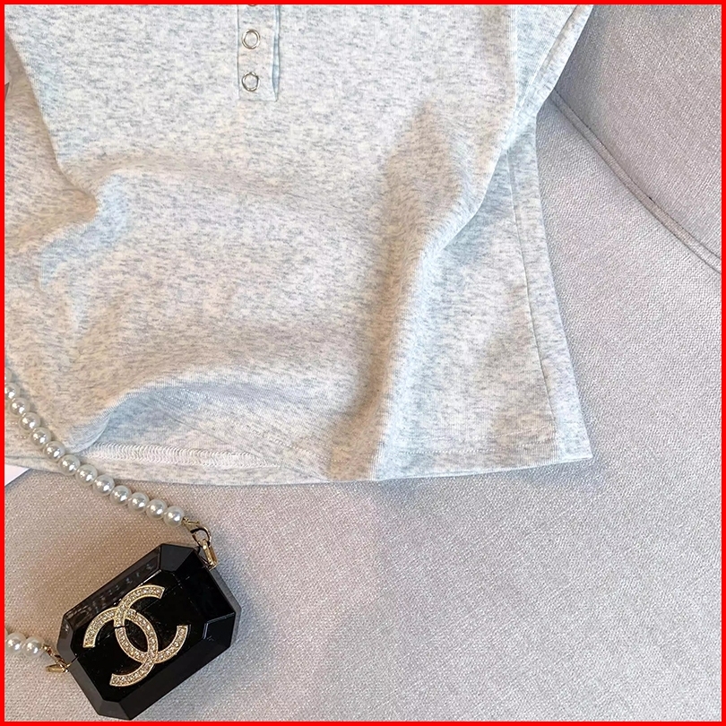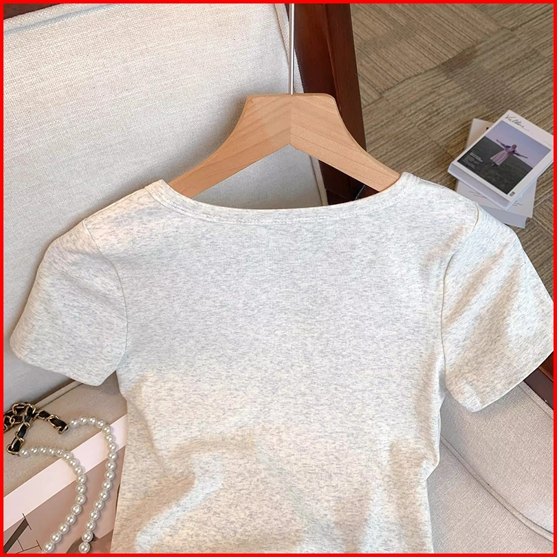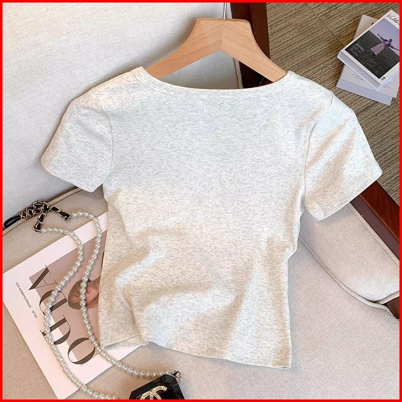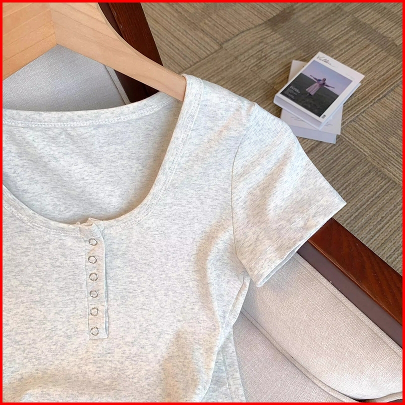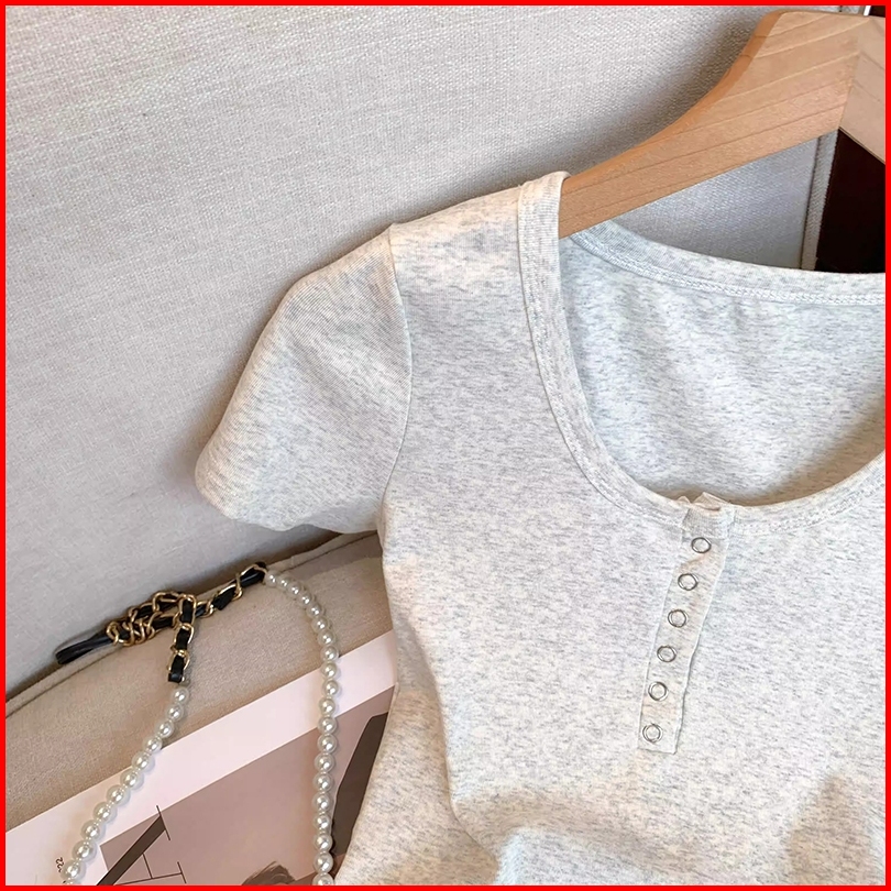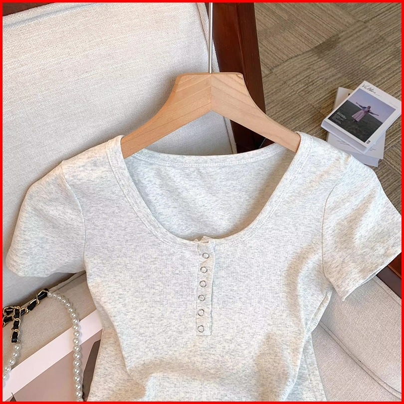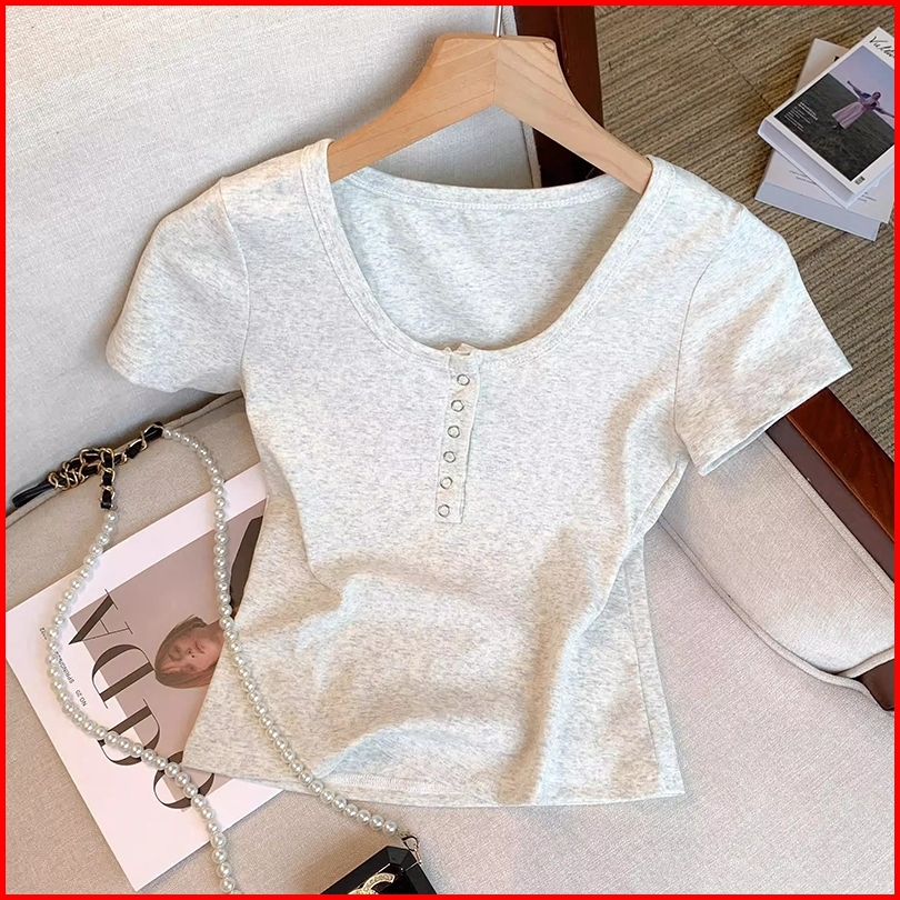 Kaos U-neck Kancing Abu Muda Kaos Ketat Elastis Fashion Korea Atasan Wanita Terbaru
