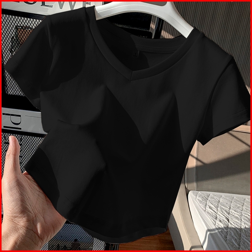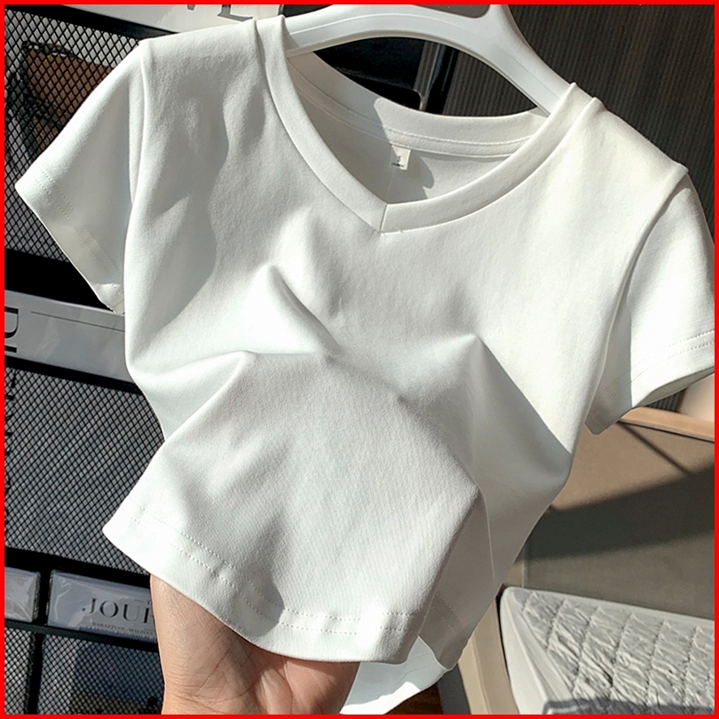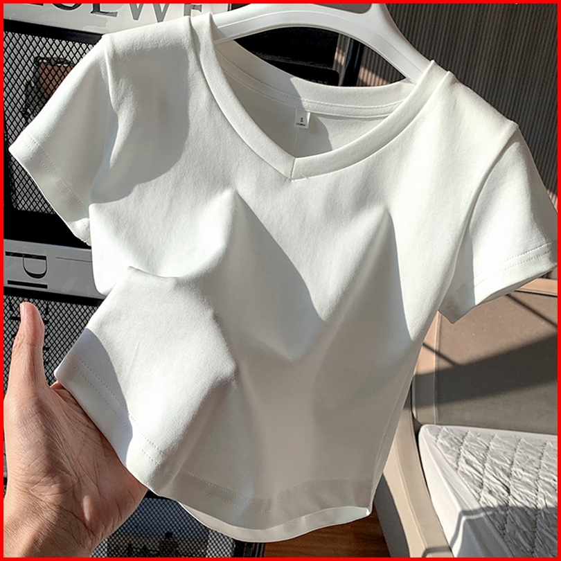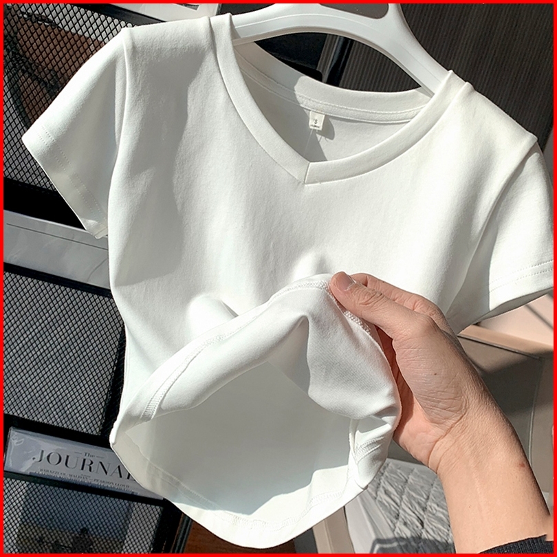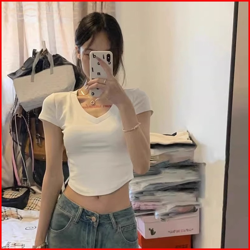 Kaos Pendek Kerah V Bergaris Putih Atasan Kaos Seksi Ketat Wanita Fashion Gaya Korea