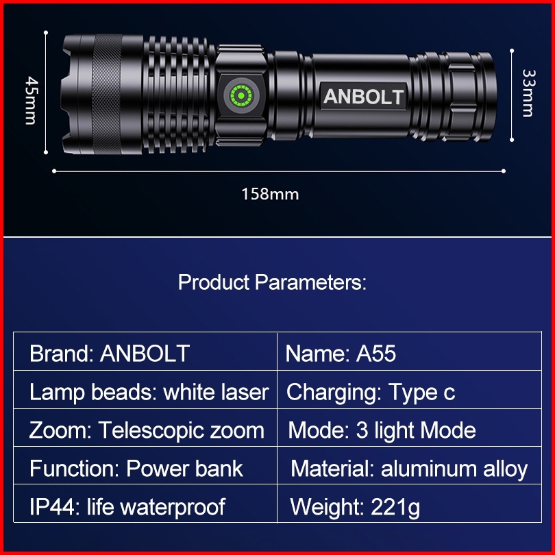 Anbolt A55 Senter Led Super Terang 90000 Lumens Usb C Rechargeable Senter Anti Air Zoomable Flashlight 3 Light Mode Sent