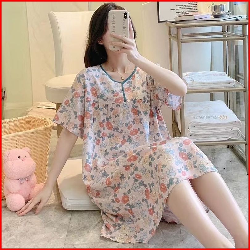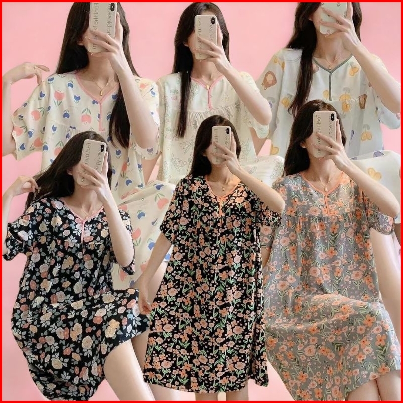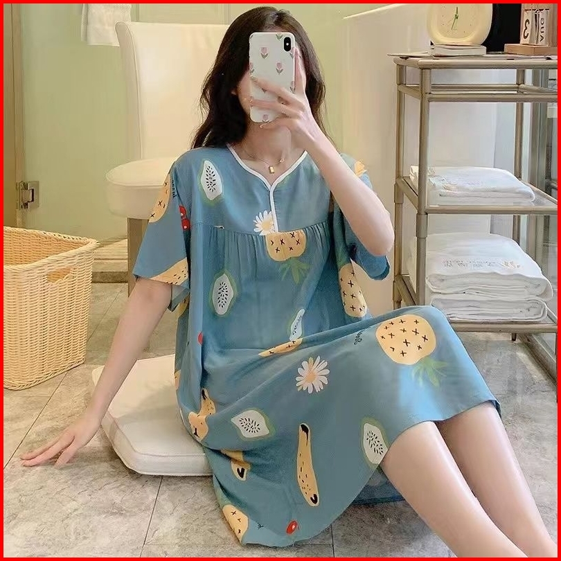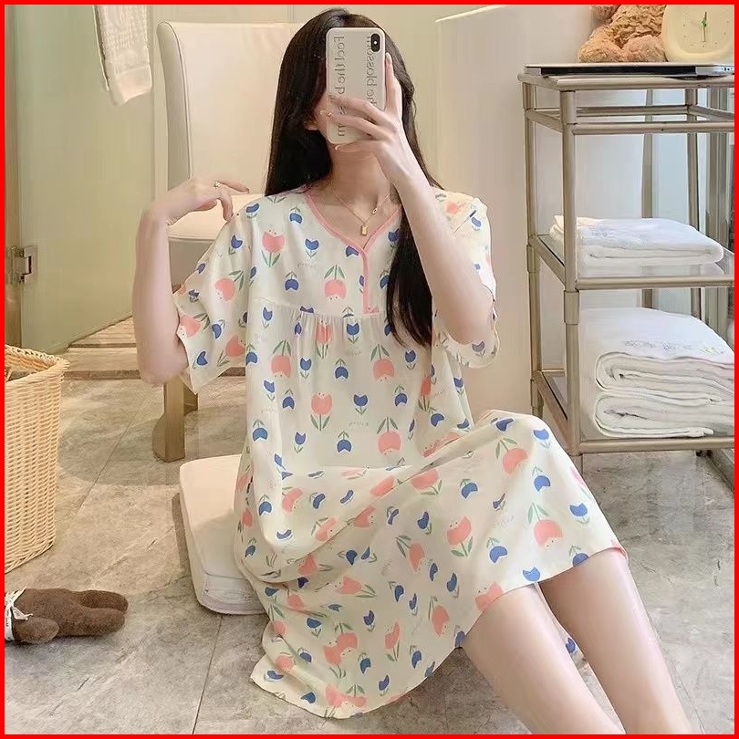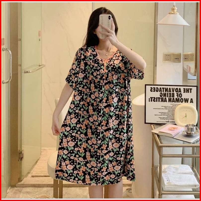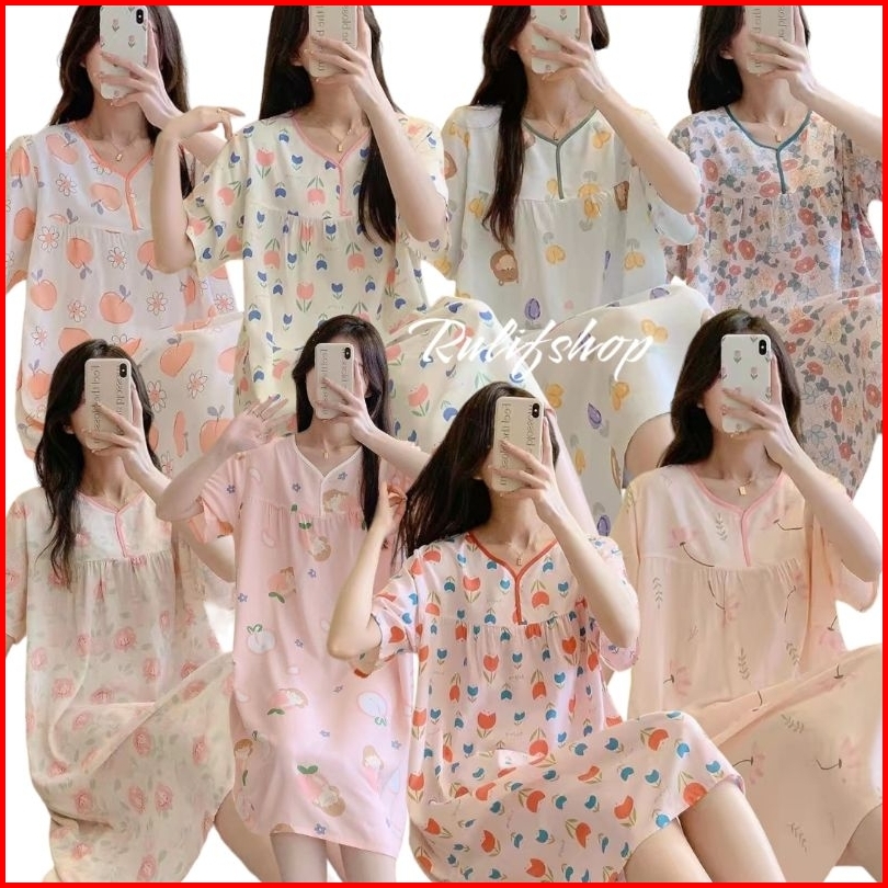 Rulif Daster Lengan Pendek Piyama Wanita Import Rayon Oversize Dress Katun Impor Premium V-neck