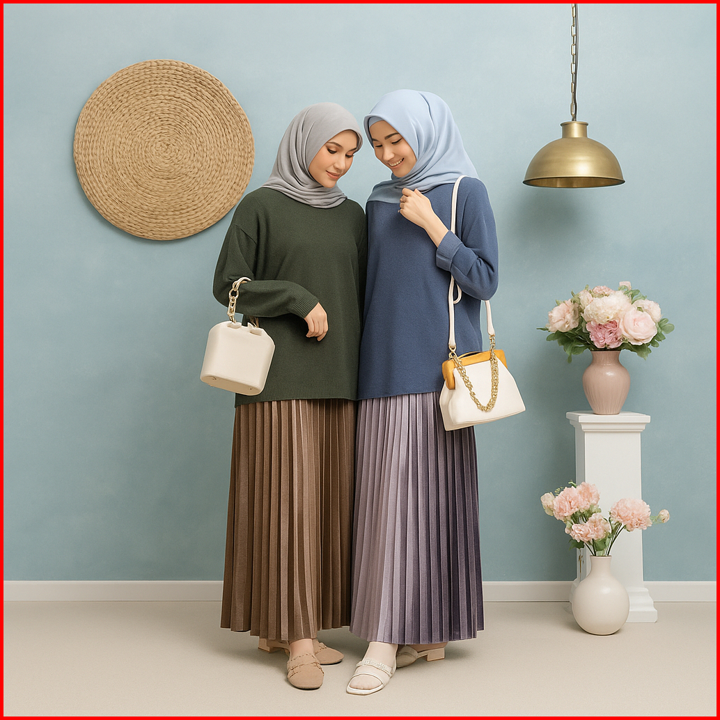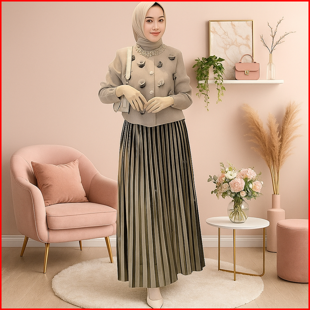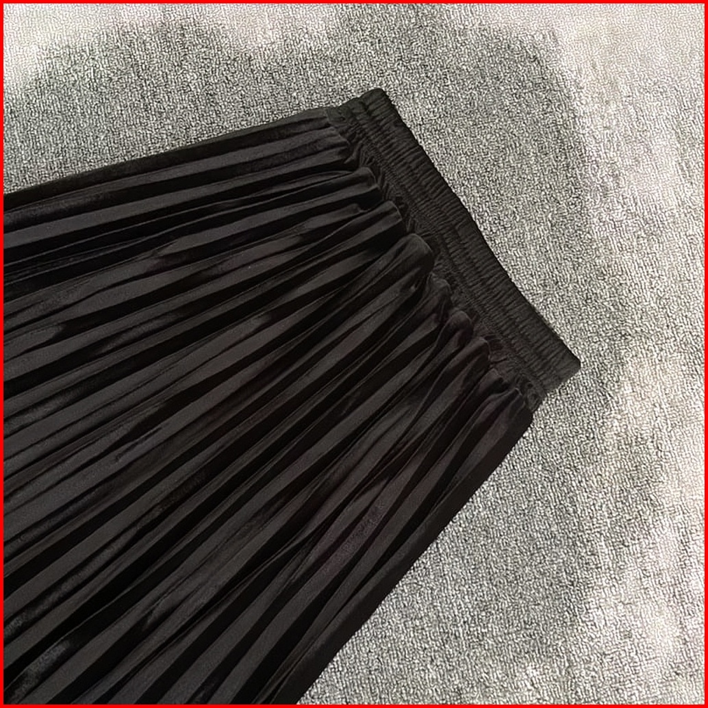 Soufit Rok Plisket Bludru Panjang - Velvet Premium High Waist - Hijab Friendly Elegan - Hitam Krem