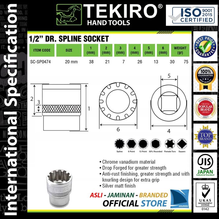 Kunci Mata Soket SPLINE 8 ~ 32 mm 1/2" inch DR / Socket / Spline Sock Spanner TEKIRO