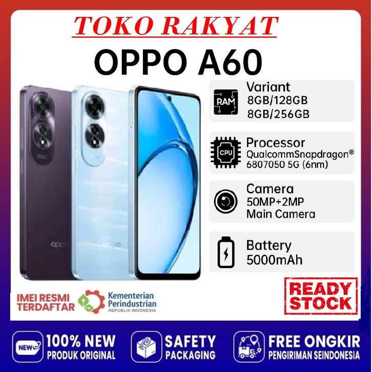 (BEBAS ONGKIR) Hp OPPO A60 NFC RAM 8+256GB | Snapdragon 680 | Camera 50MP | Batery 5000mAh