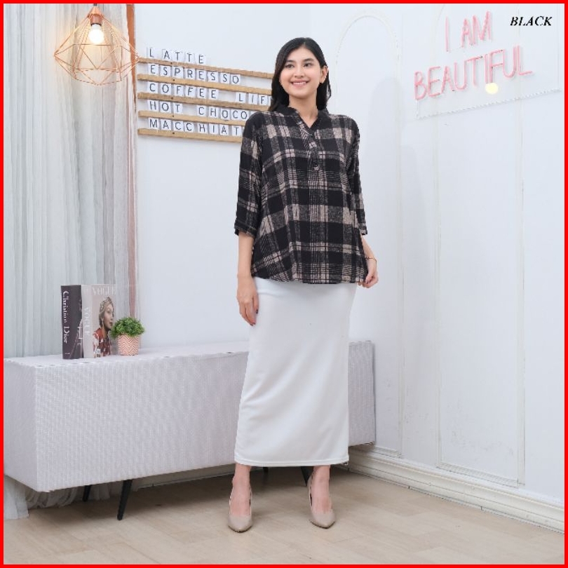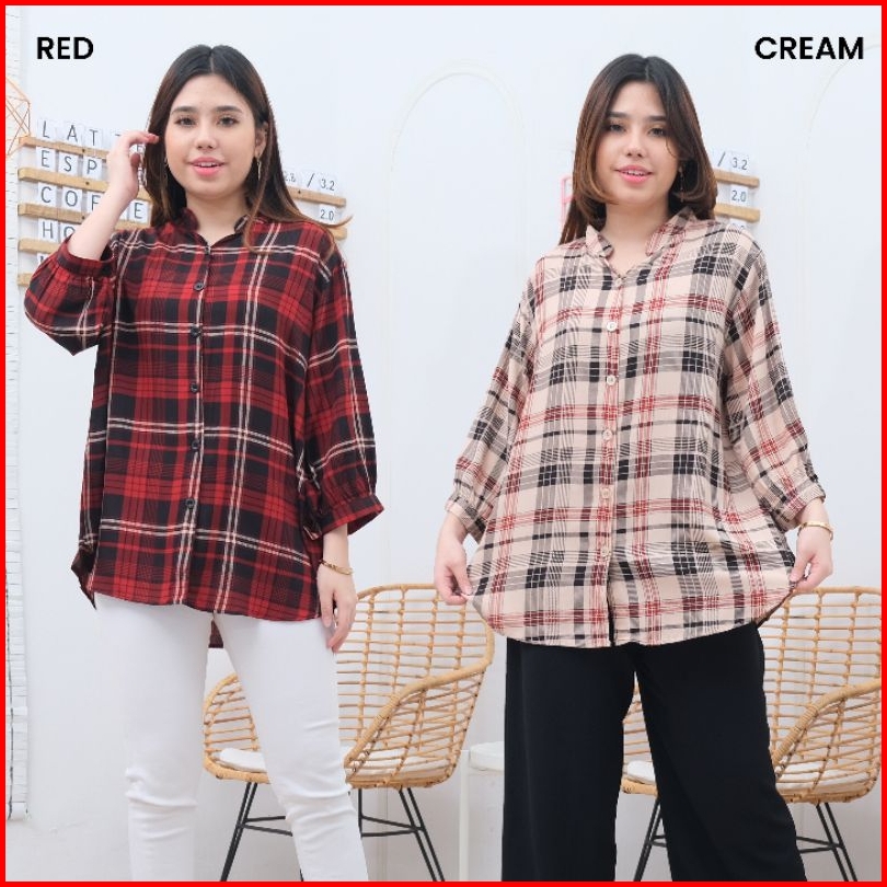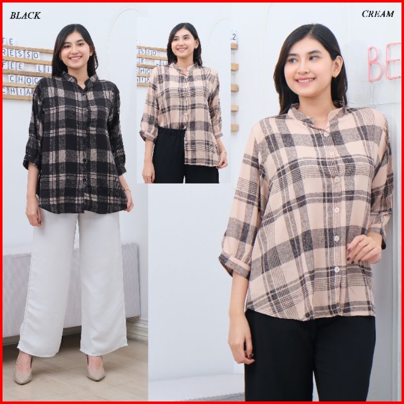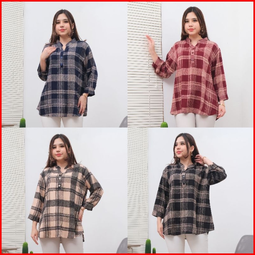 Kemeja Blouse Wanita Kotak Besar Bahan Rayon Premium Kancing Lengan New
