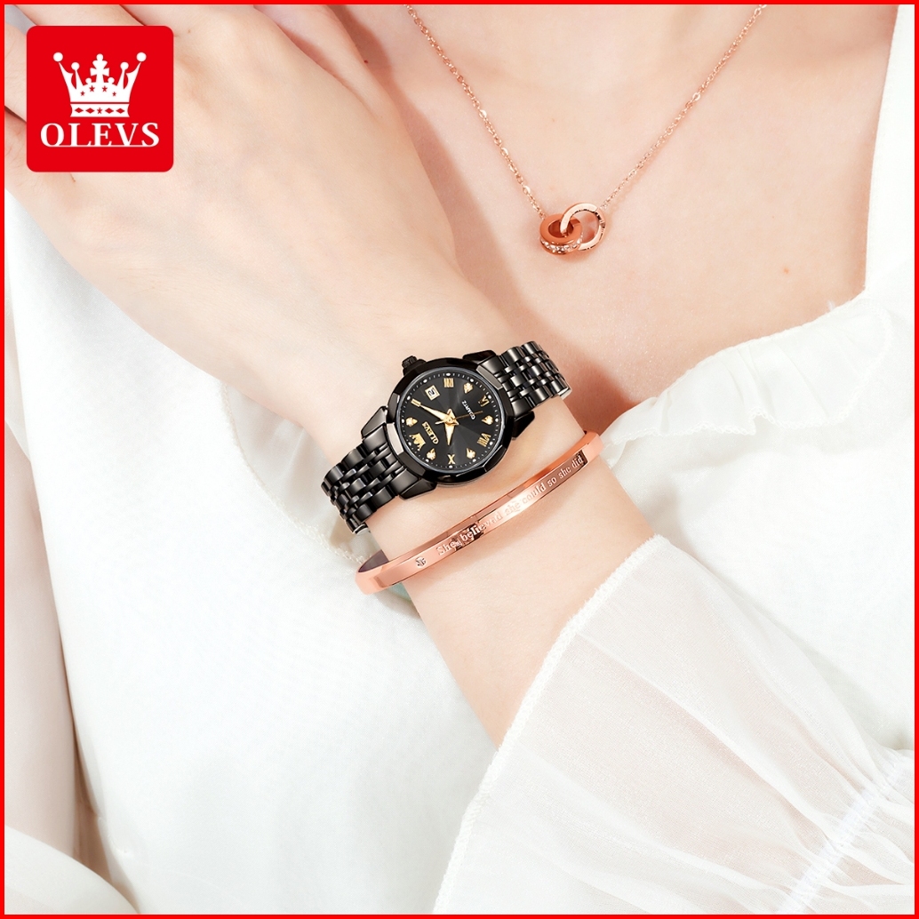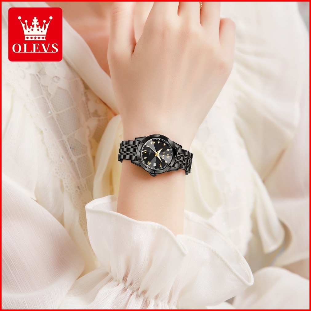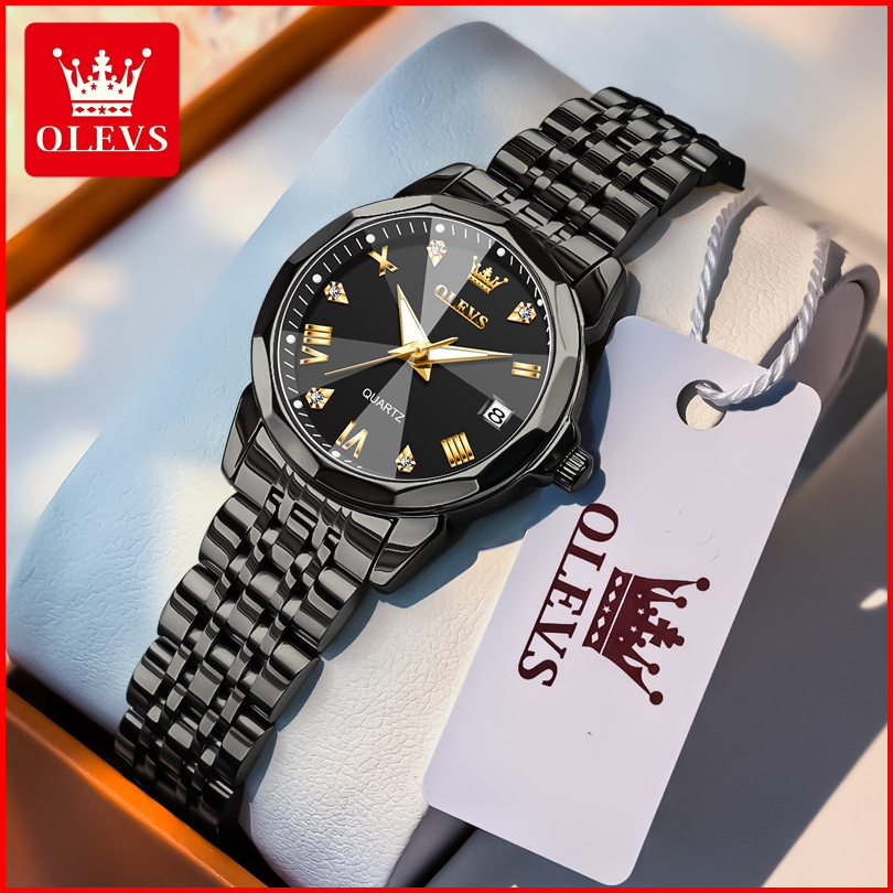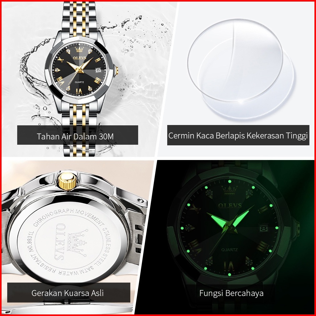 Olevs Jam Tangan Wanita Anti Air Original Luminous Kalender Stainless Steel Cewek Fashion Hitam Biru Putih Women Watch 9