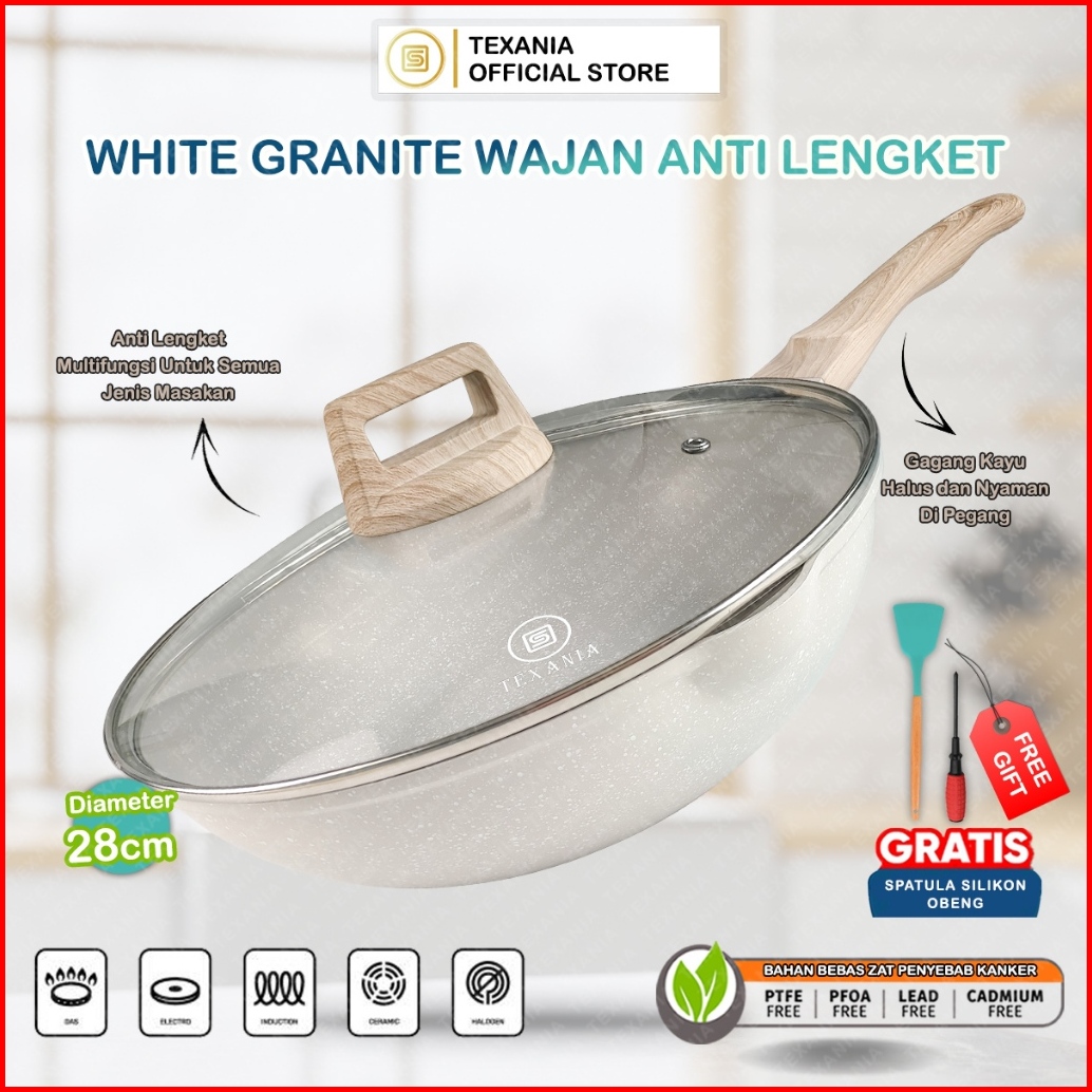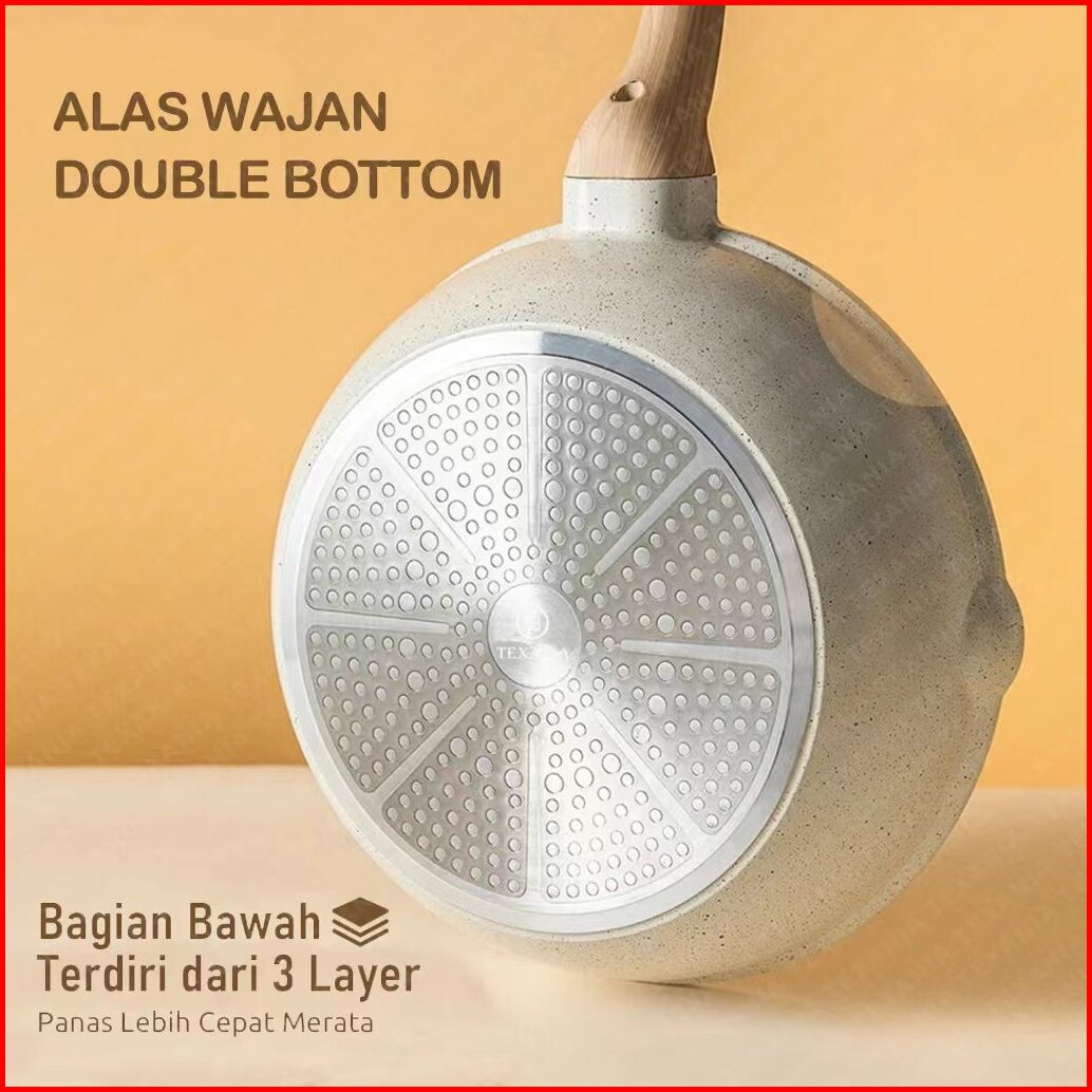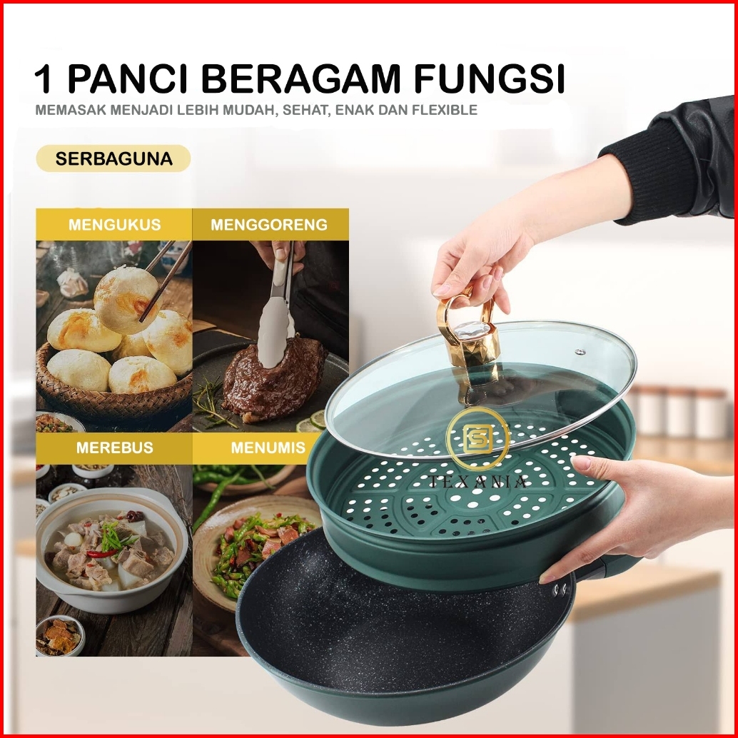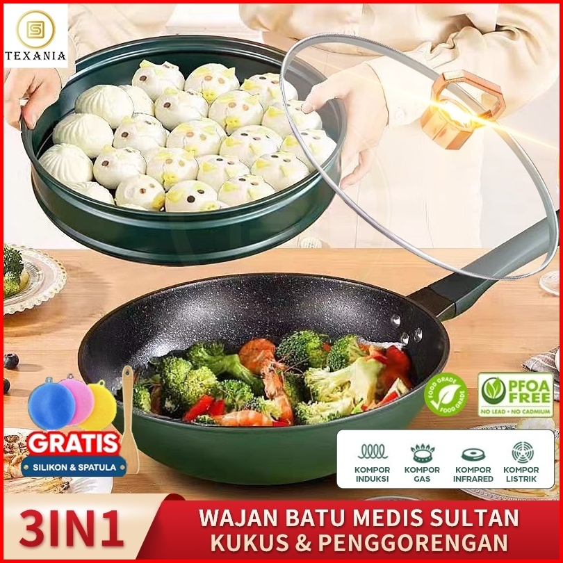 Texania 3in1 Wajan Wokpan Steamer 28 Cm Bahan Batu Medis Anti Lengket Hijau Premium Panci Penggorengan Kukus Serba Guna