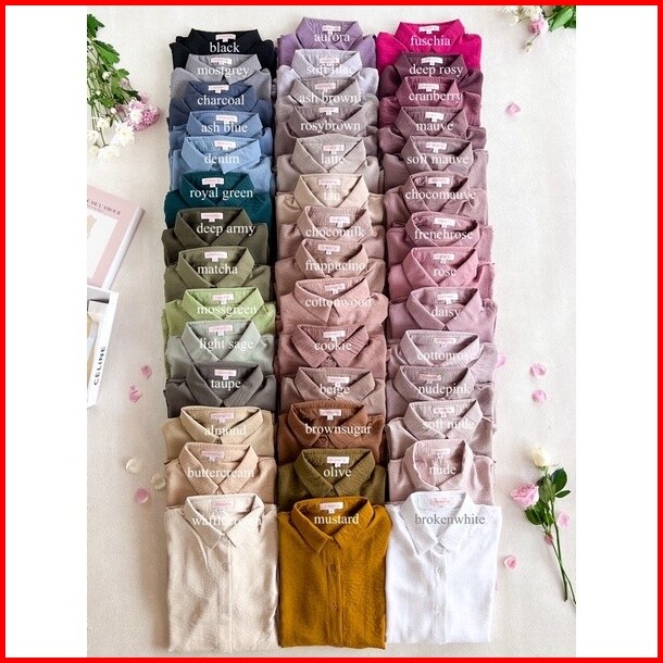 Black, Mostgrey, Charcoal, Ash Blue, Denim, Royalgreen, Deep Army, Light Sage, Mossgreen, Taupe, Almond, Buttercream, Wafflecream, Aurora, Softlilac, Ash Brown, Rosybrown, Latte, Tan, Chocomilk, Frappuccino, Cottonwood, Cookie, Beige, Brownsugar, Olive, Mustard, Fuschia, Deeprosy, Cranberry, Mauve, Softmauve, Chocomauve, French Rose, Rose, Daisy, Cottonrose, Nudepink, Softnude, Nude, Brokenwhite, Blush, Magenta, Emerald, Stone, Ash Grey, Matcha