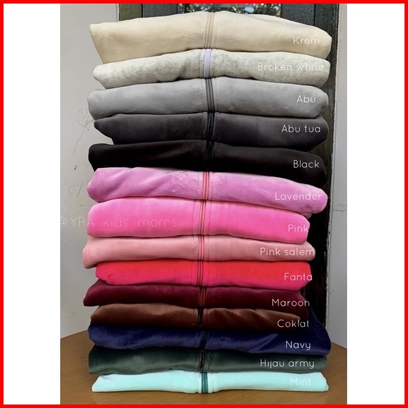 Pink Salem, Pink, Lavender, Fanta, Merah, Dusty peach, Ungu terong, Ungu Tua, Ungu muda, Biru toska, Hijau botol, Kacang hijau, Mint, Navy, Broken white, Krem, Deep peony, Maroon, Abu muda, Abu Tua, Hitam, Oranye, Kuning, Biru bca