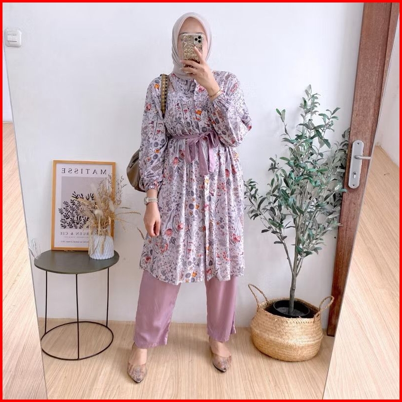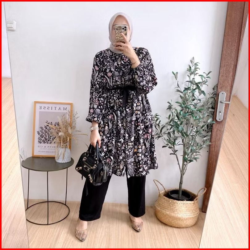 Setelan Wanita Novela Oneset Long Tunik Bahan Rayon Diamond Motif Bunga Mix Crinkle By Annaja