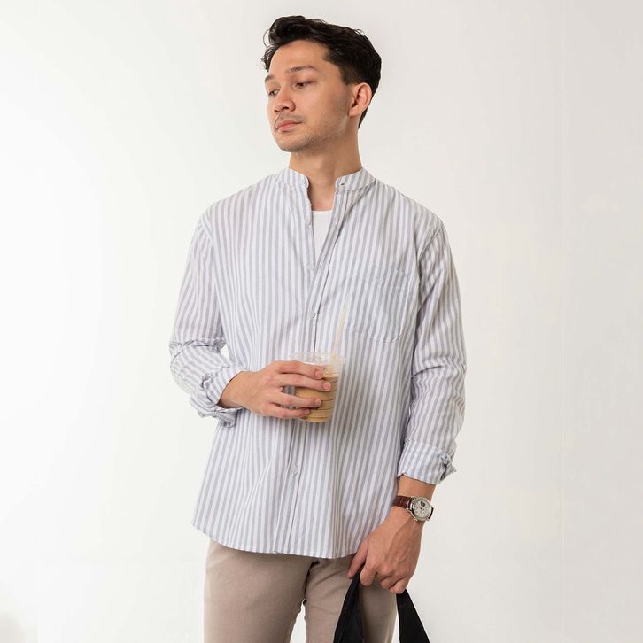 Kemeja Pria Garis WOODCUTTER Collarless Butcher Stripe - Light9rey Lengan Panjang