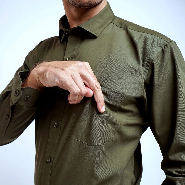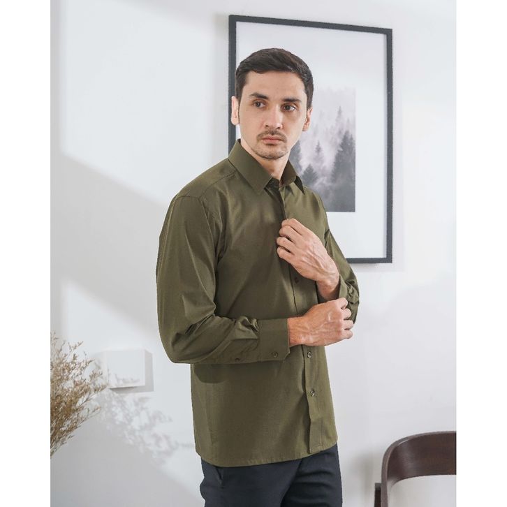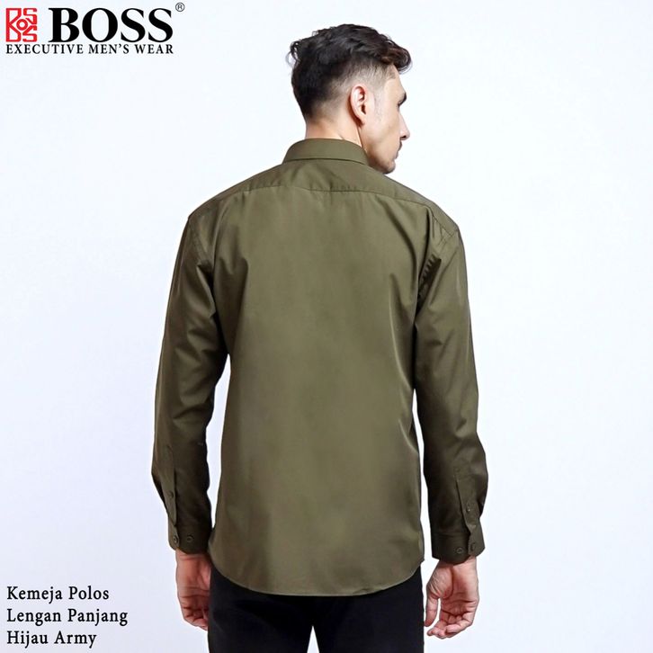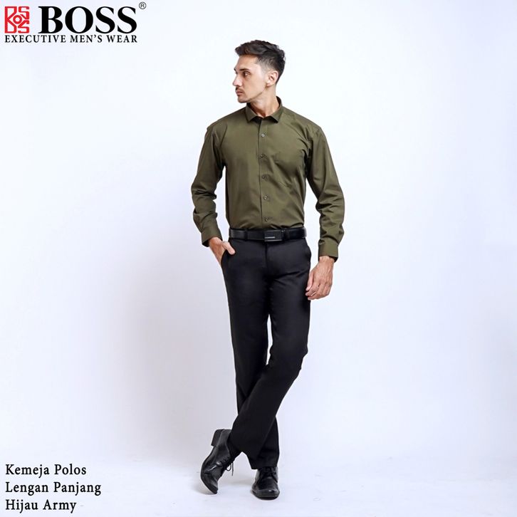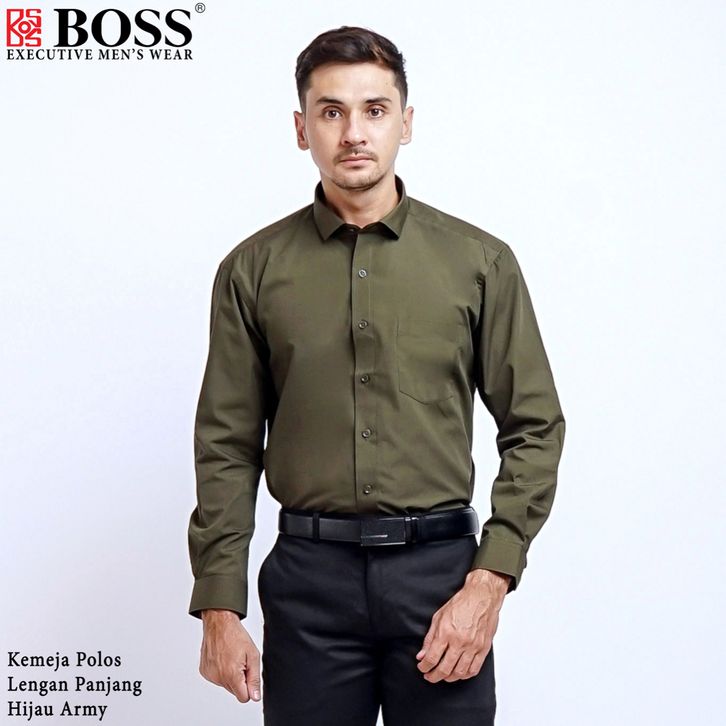 BOSS Kemeja Polos Pria Lengan Panjang Hijau Army