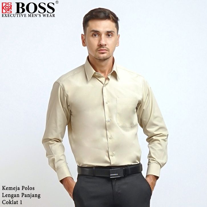 BOSS Kemeja Polos Pria Lengan Panjang Regular Fit Coklat