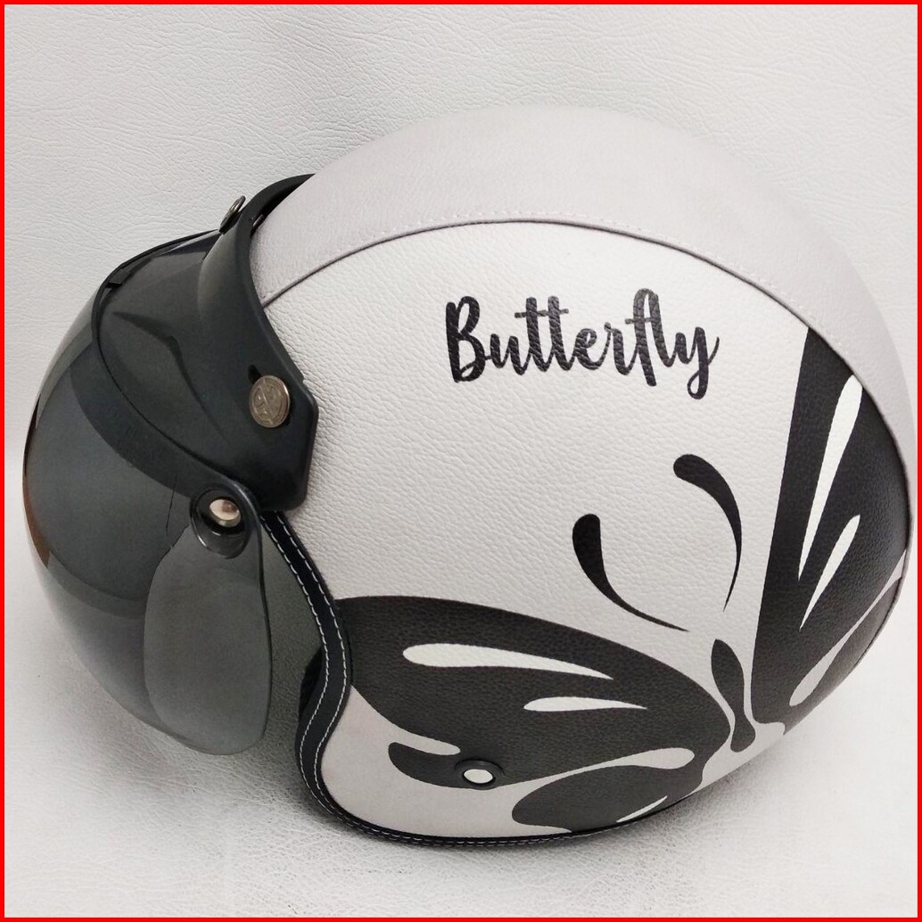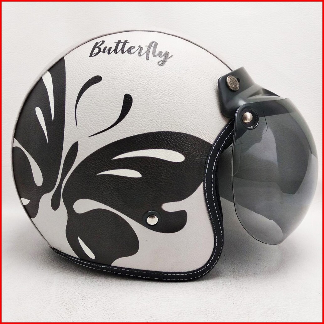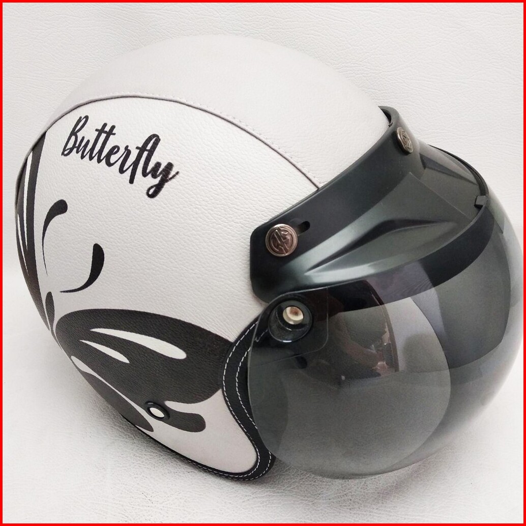 Helm Retro Bogo Kulit Motif Black Butterfly Klasik Kaca Bubble Halfface