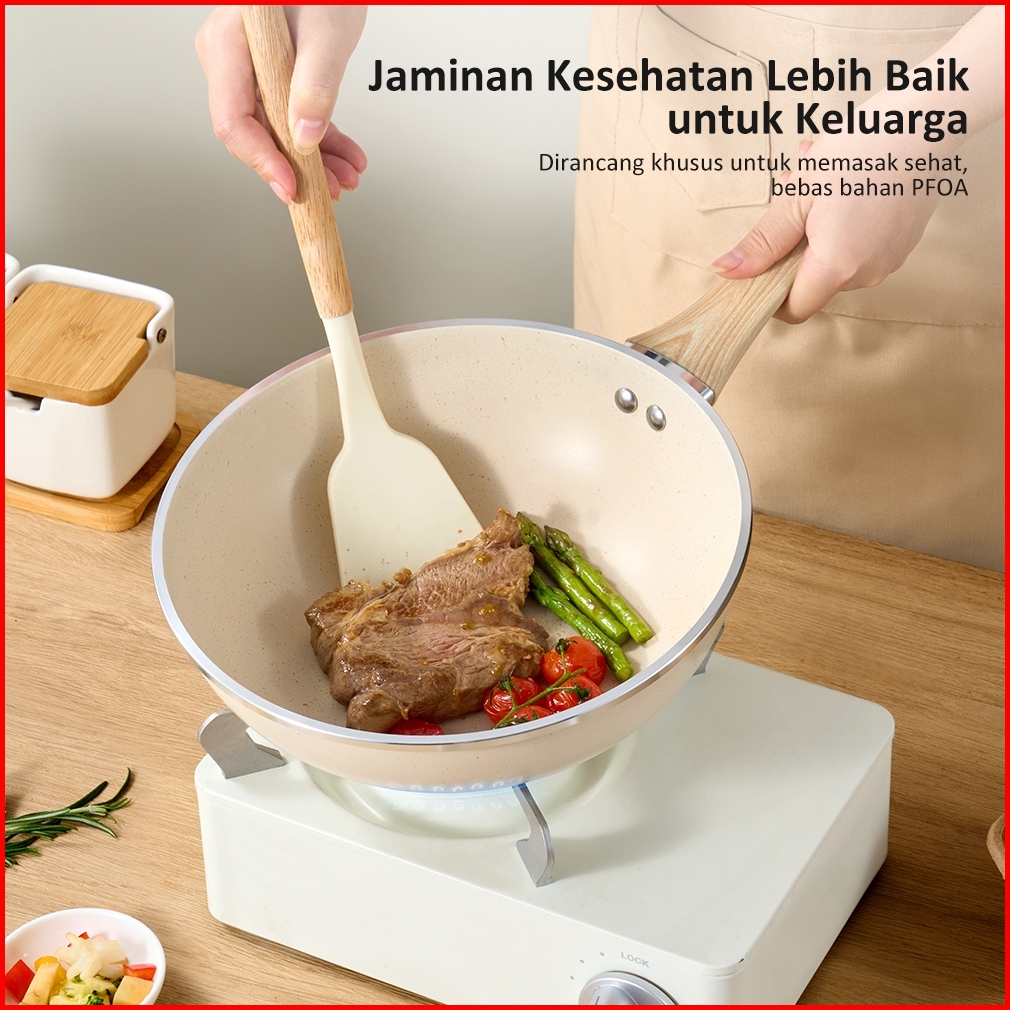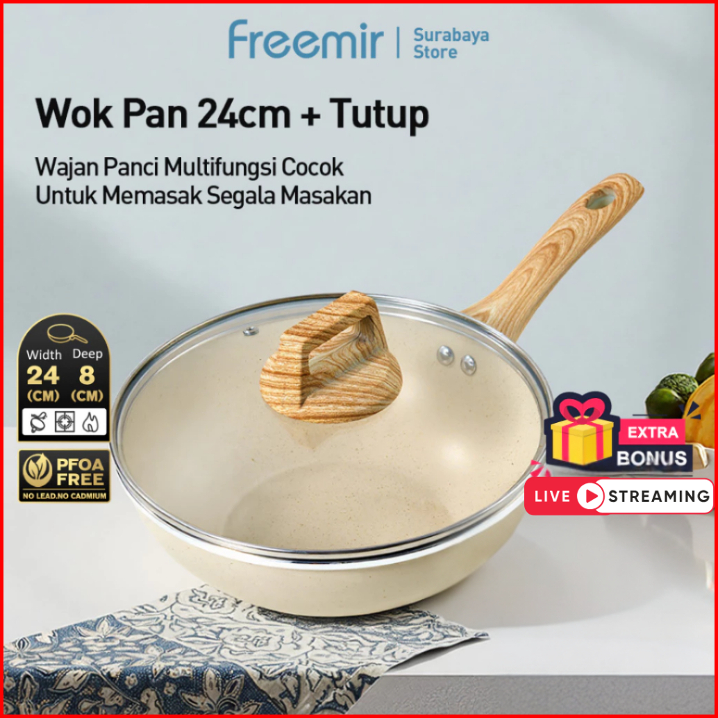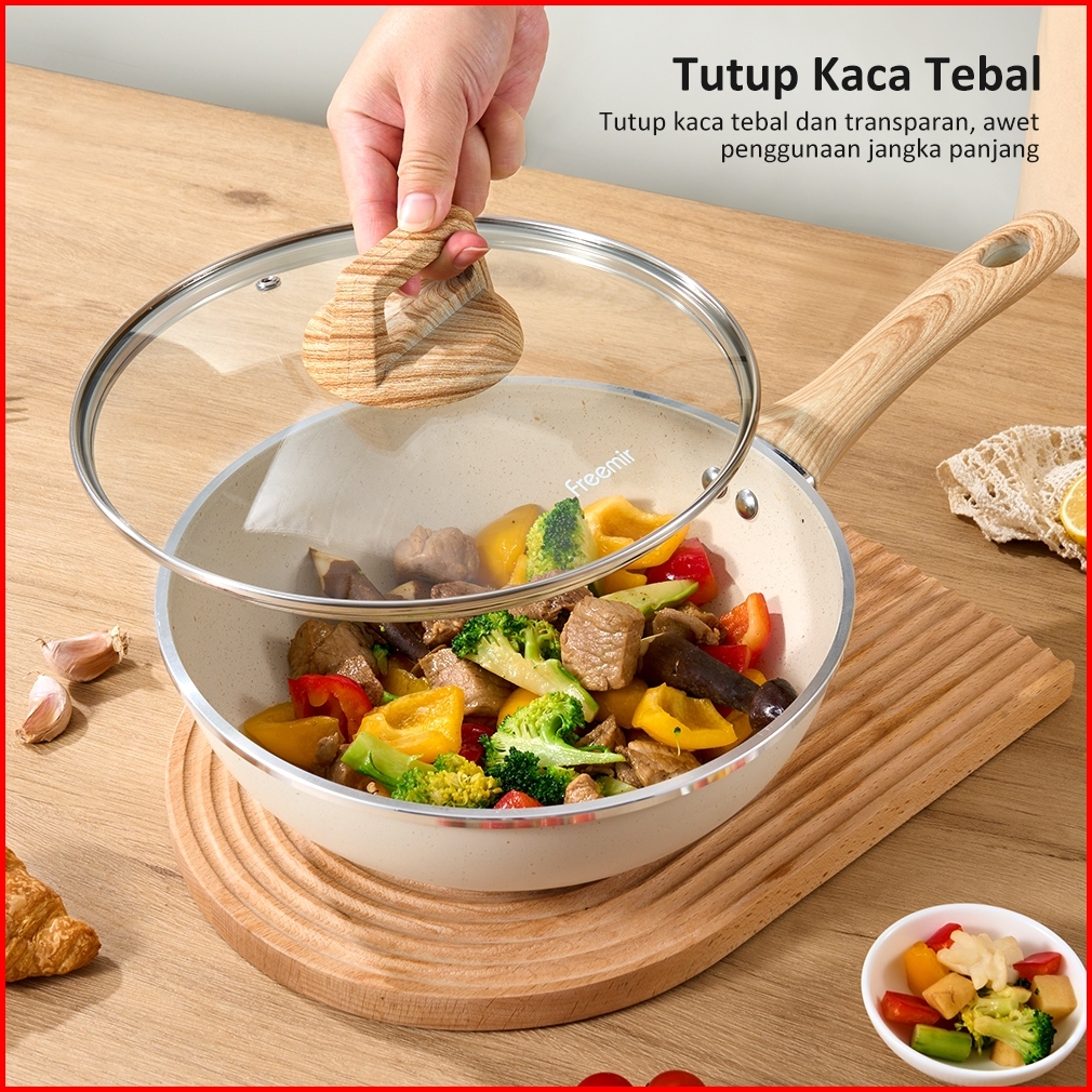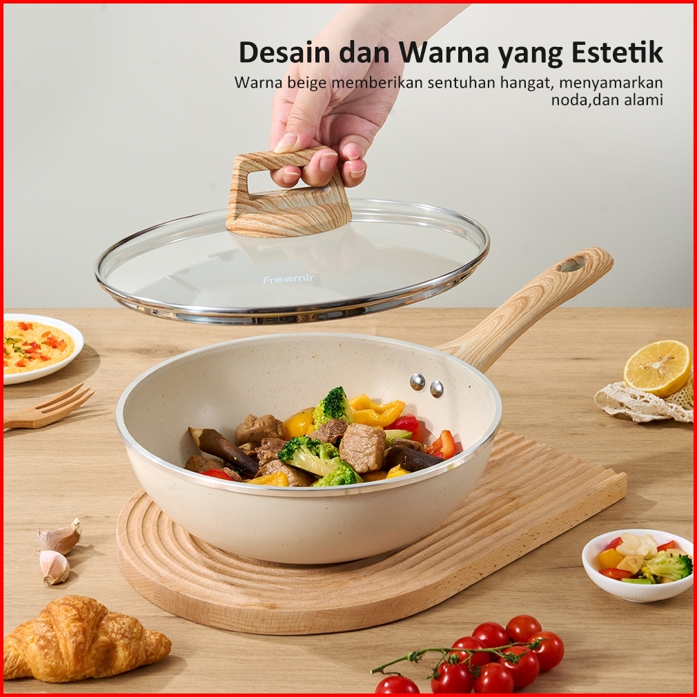 Exclusive Freemir Wokpan Panci Beige Granite 24cm Gagang Kayu Anti Lengket Tanpa Minyak