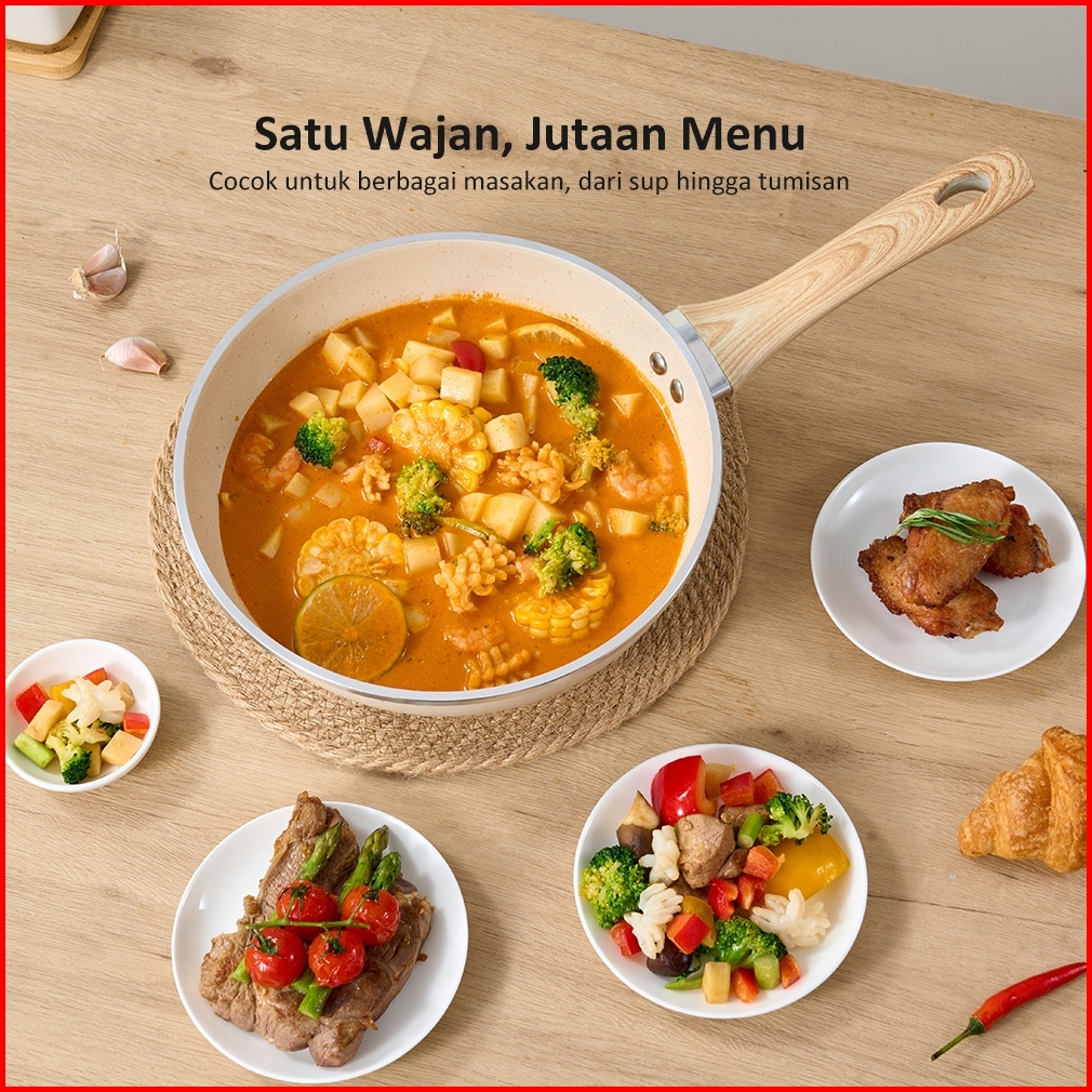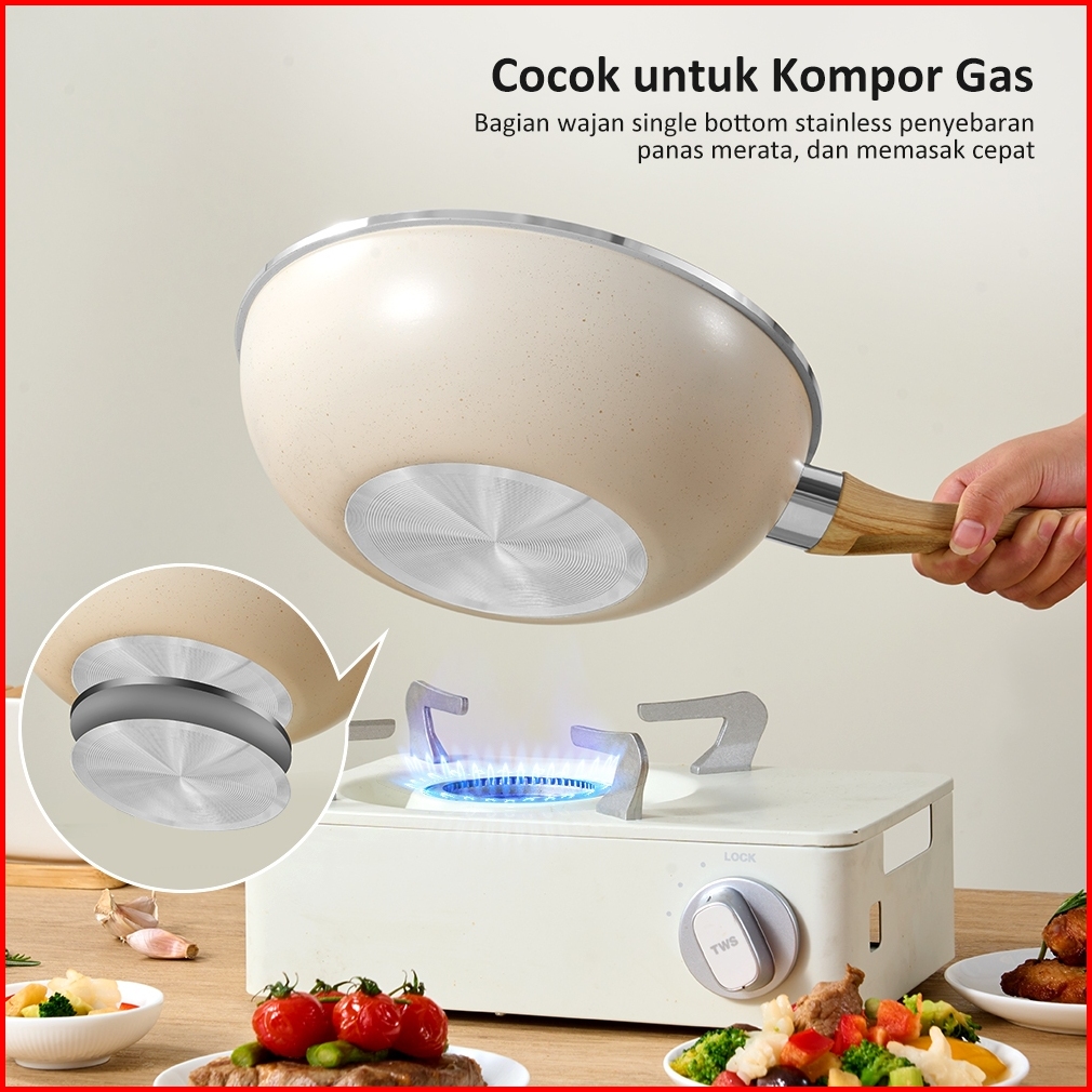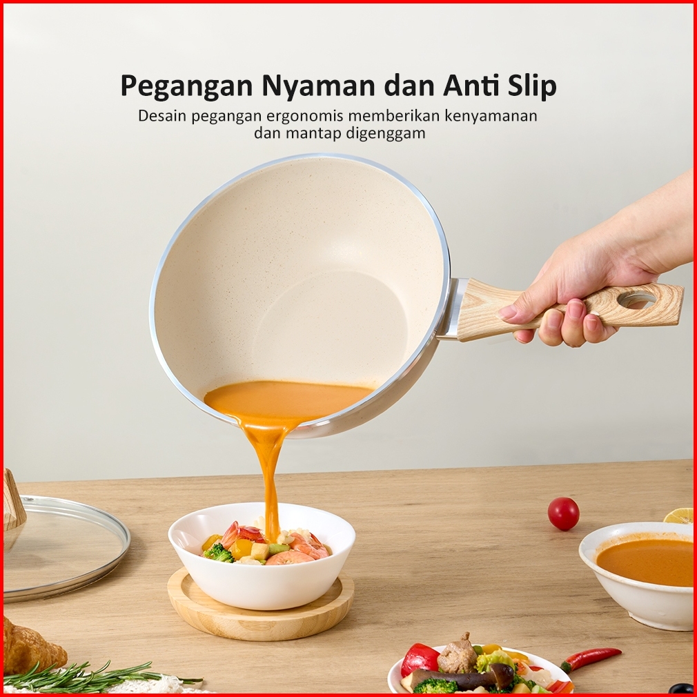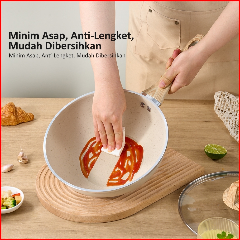 Exclusive Freemir Wokpan Panci Beige Granite 24cm Gagang Kayu Anti Lengket Tanpa Minyak