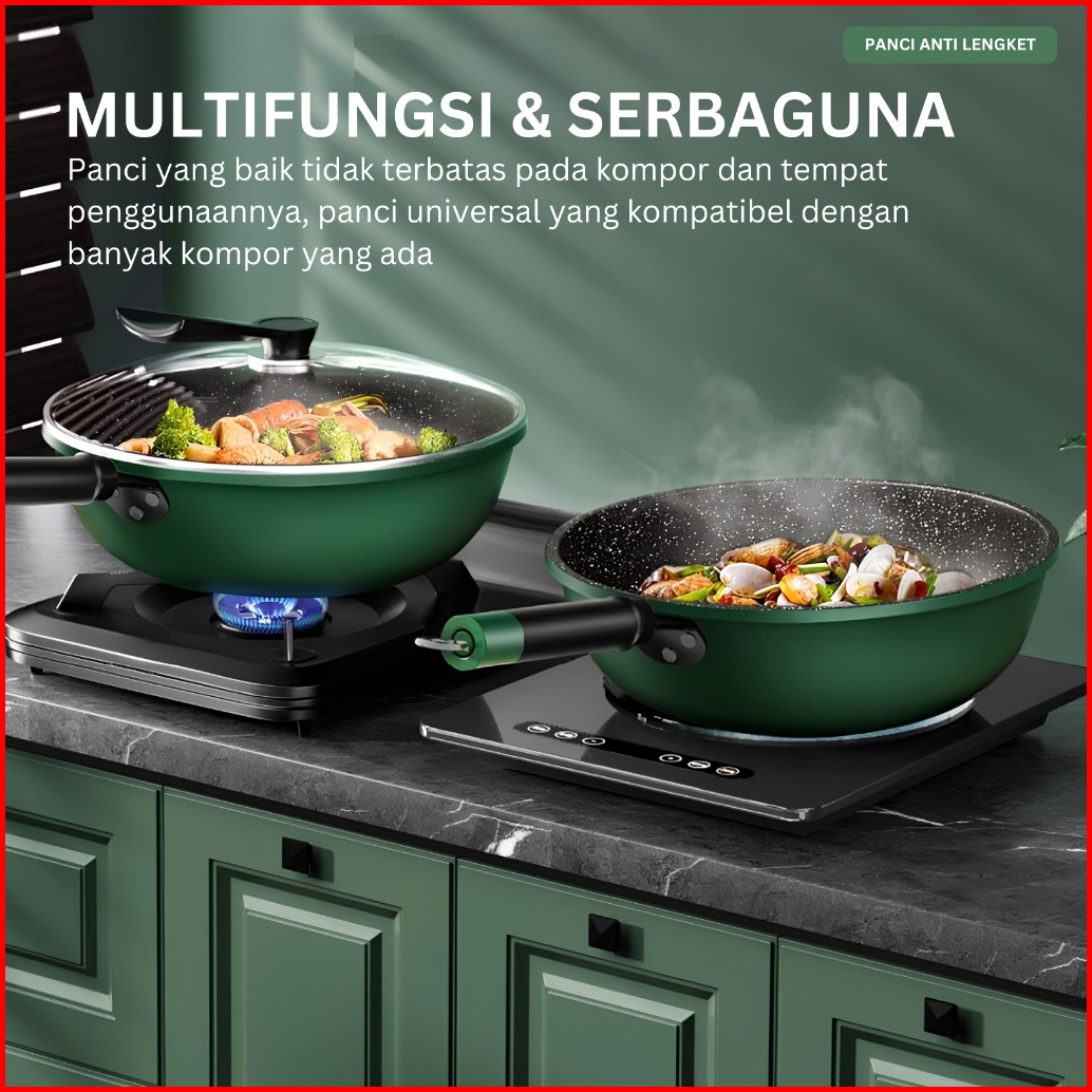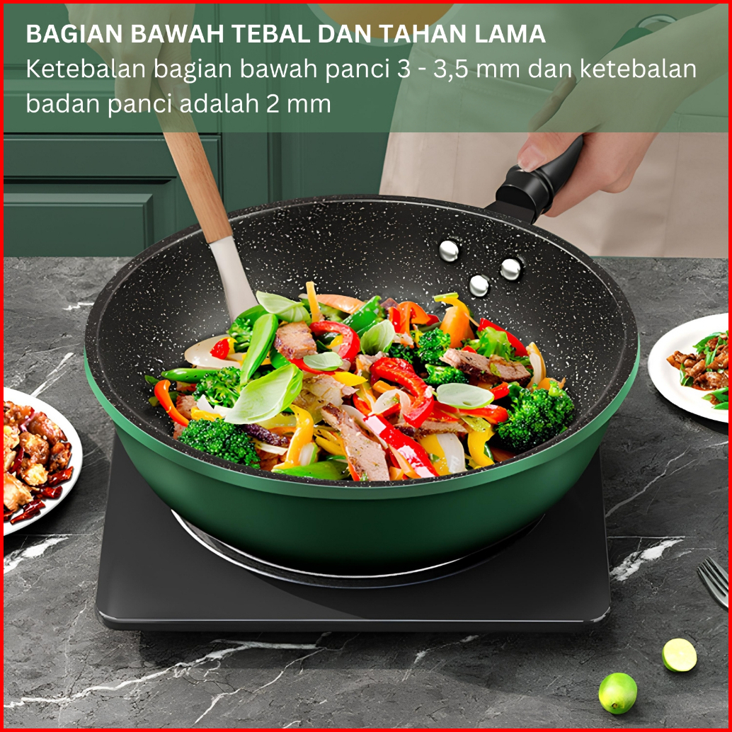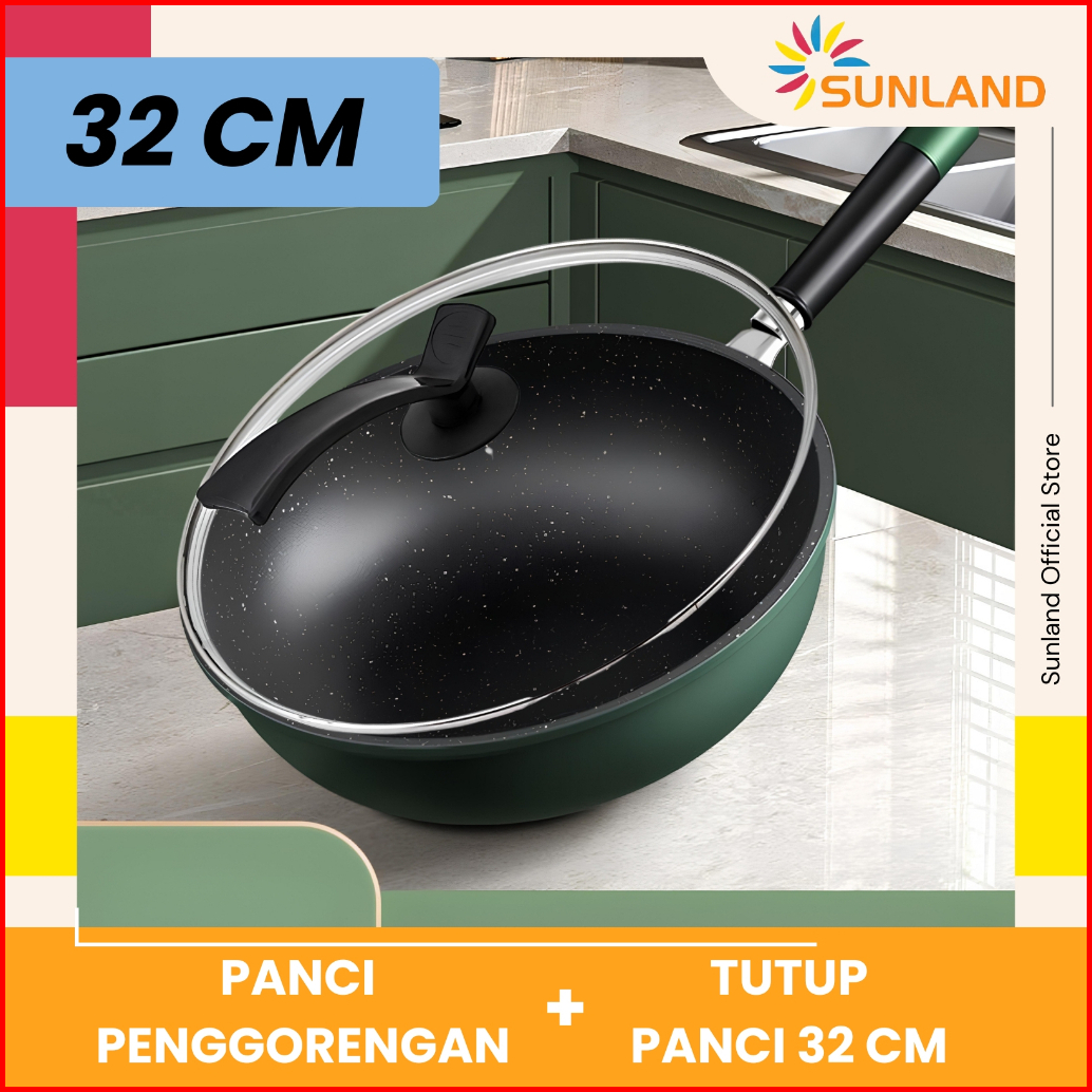 Sunland Panci Wajan Penggorengan Batu Medis Wok Pan Anti Lengket Dengan Tutup Kaca Ukuran 32cm