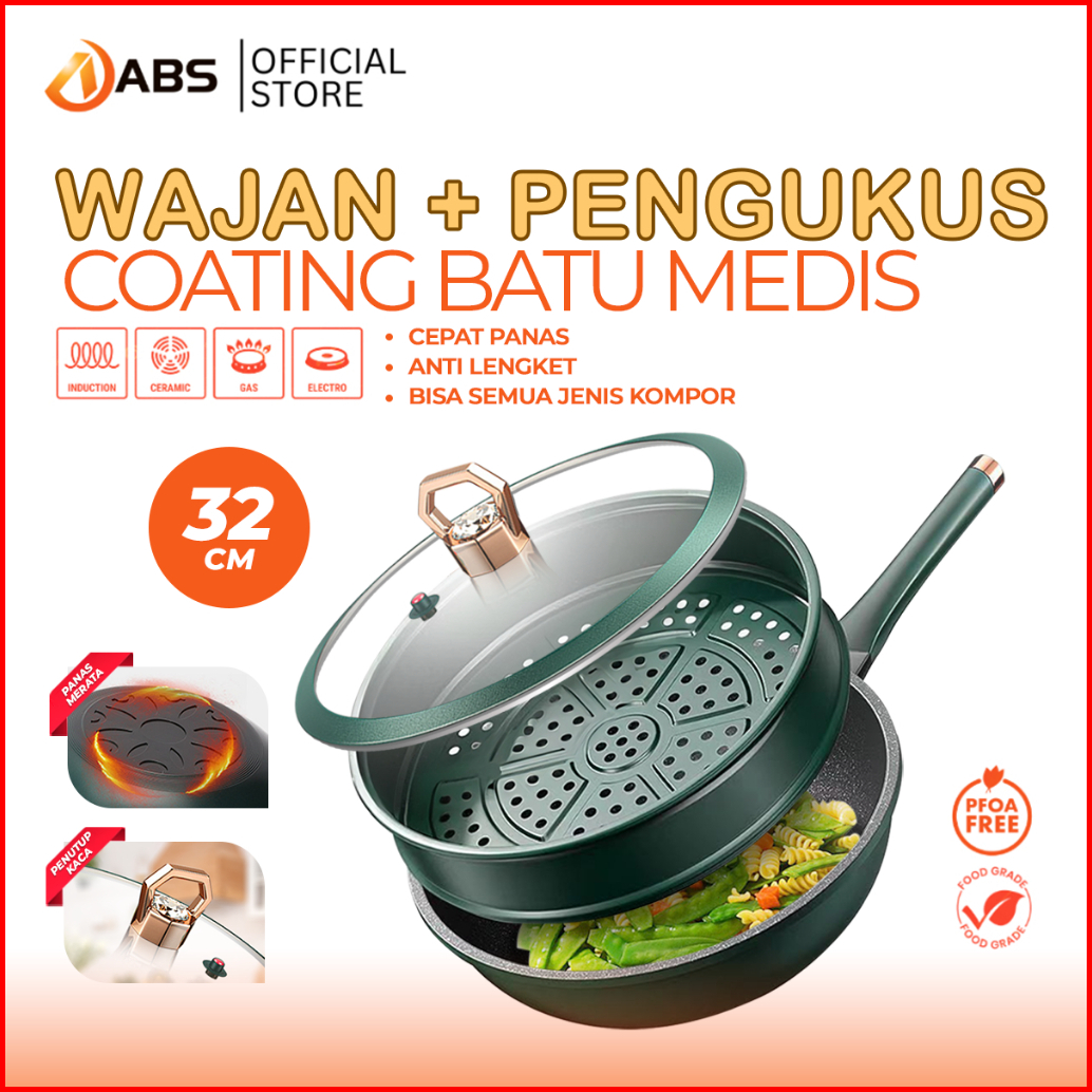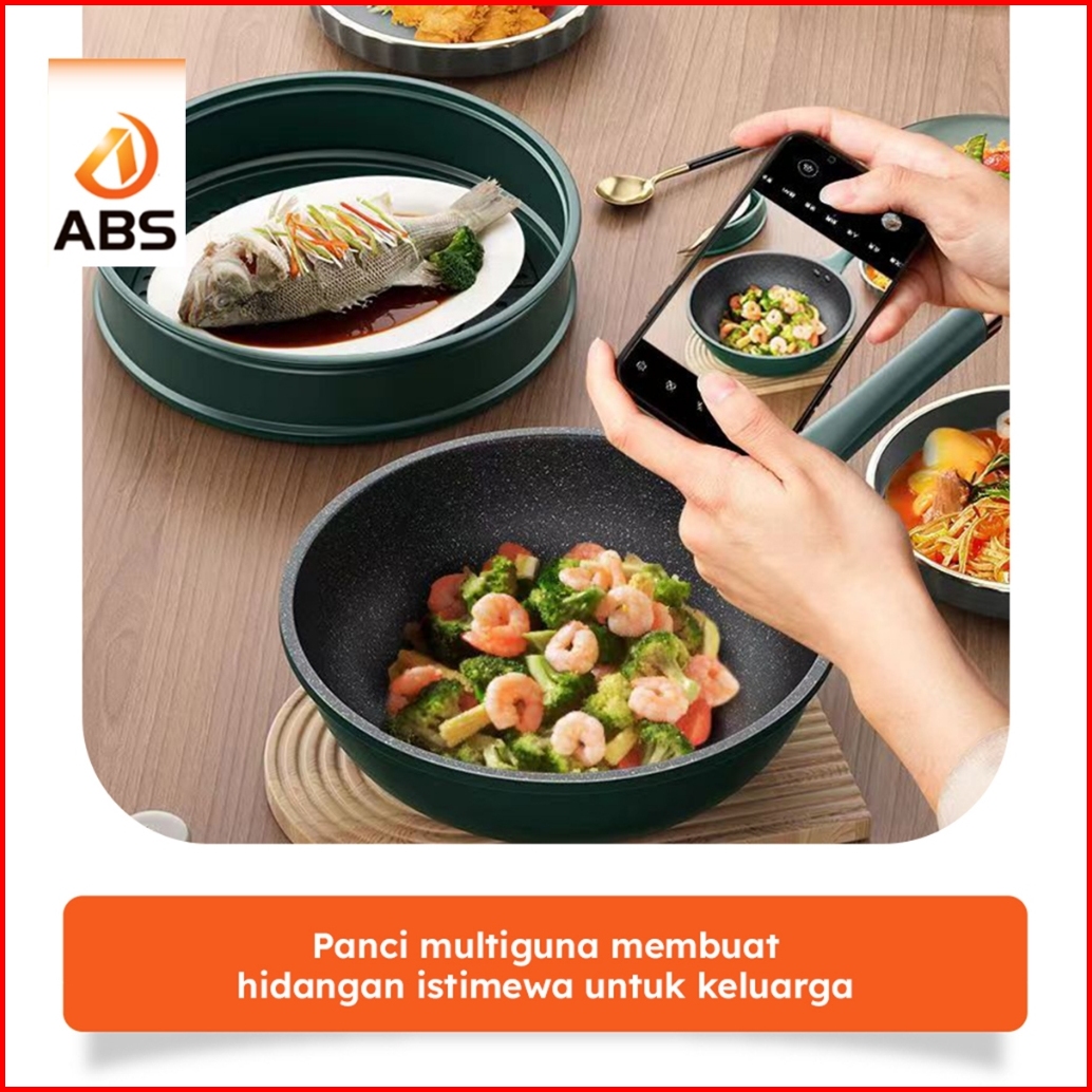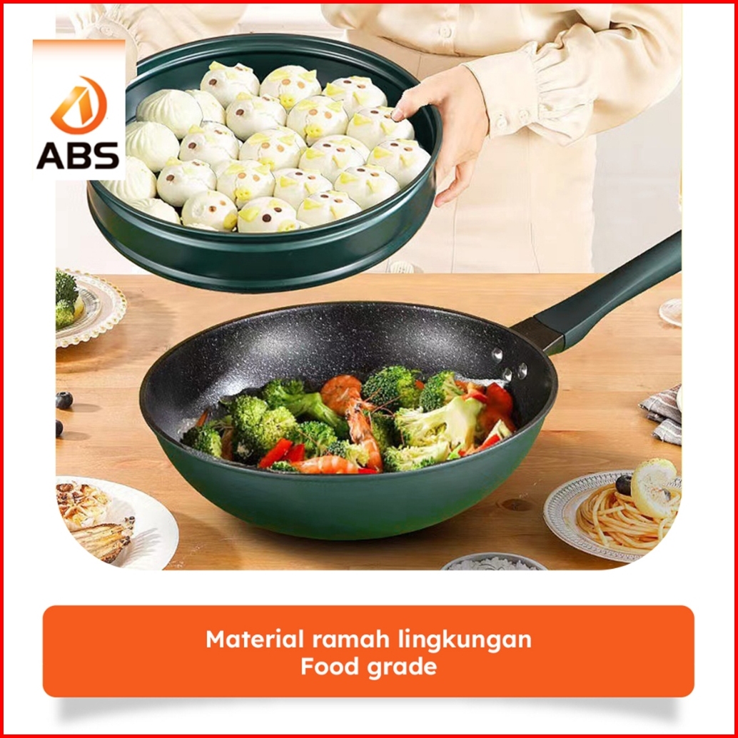 Abs X Tifale 3in1 Wajan Wokpan Steamer 32 Cm Bahan Batu Medis Anti Lengket Hijau Premium Panci Penggorengan Kukus Serba