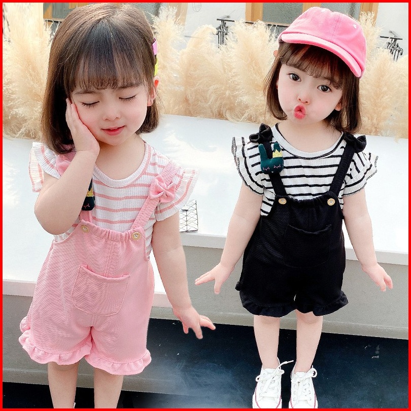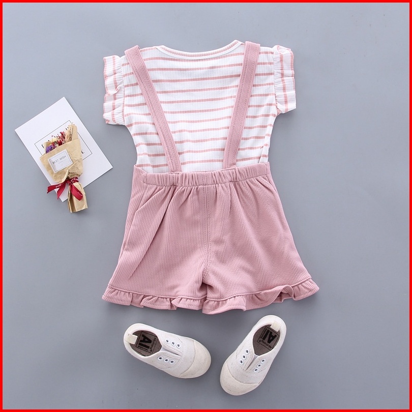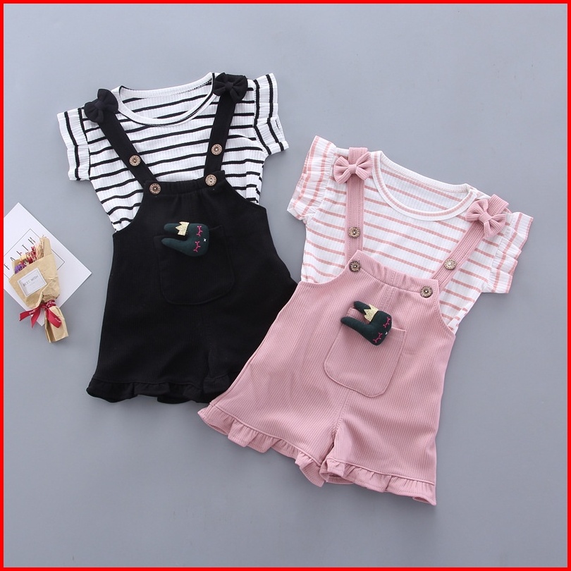 Setelan Set 2in1 Overall Anak Bayi Perempuan Kodok Garis Strip Pendek Import Cewek