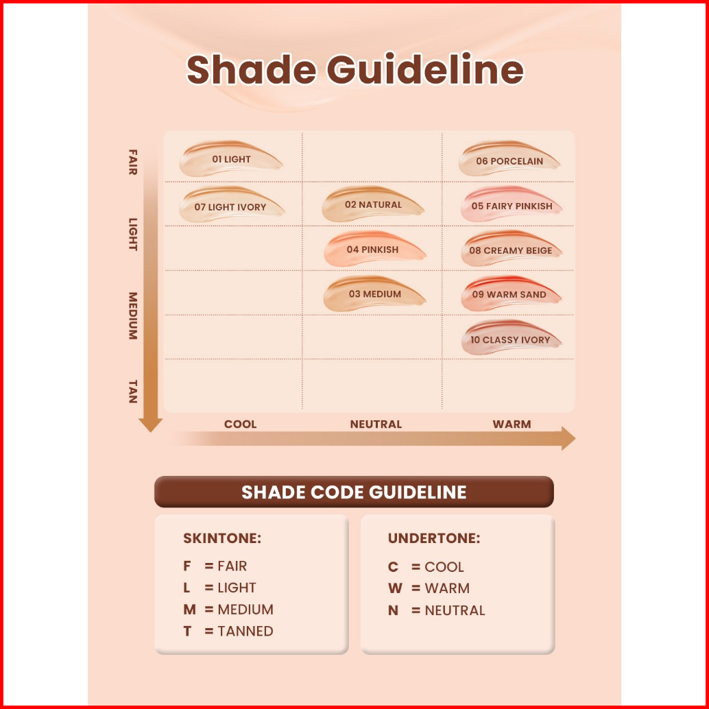 01.LIGHT, 02.NATURAL, 03.MEDIUM, 04.PINKISH, 05.FAIRYPINKISH, 06 PORCELAIN, 07 LIGHT IVORY, 08 CREAMY BEIGE, 09 WARM SAND, 10 CLASIC IVORY