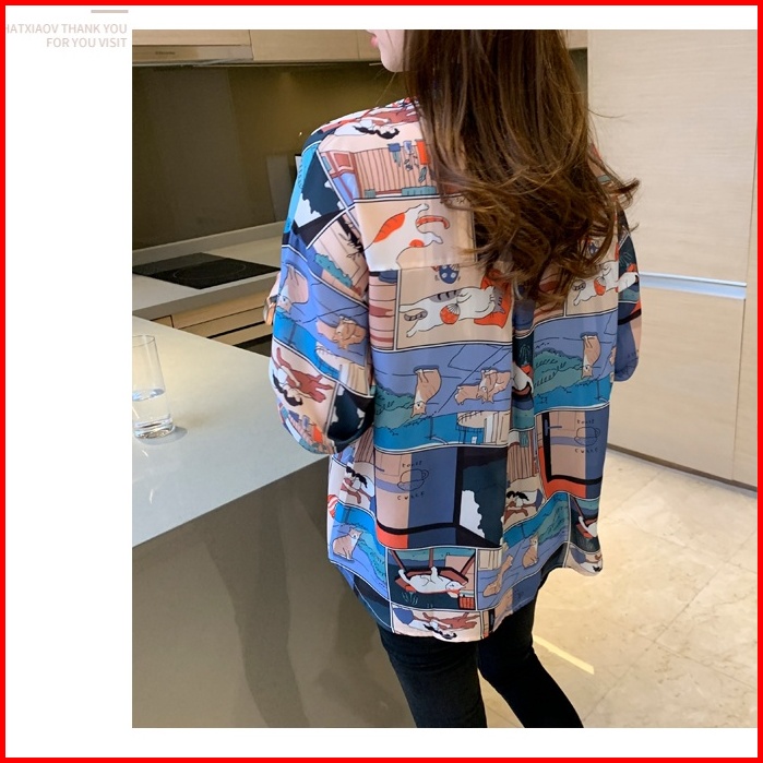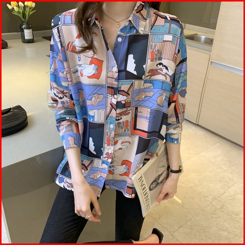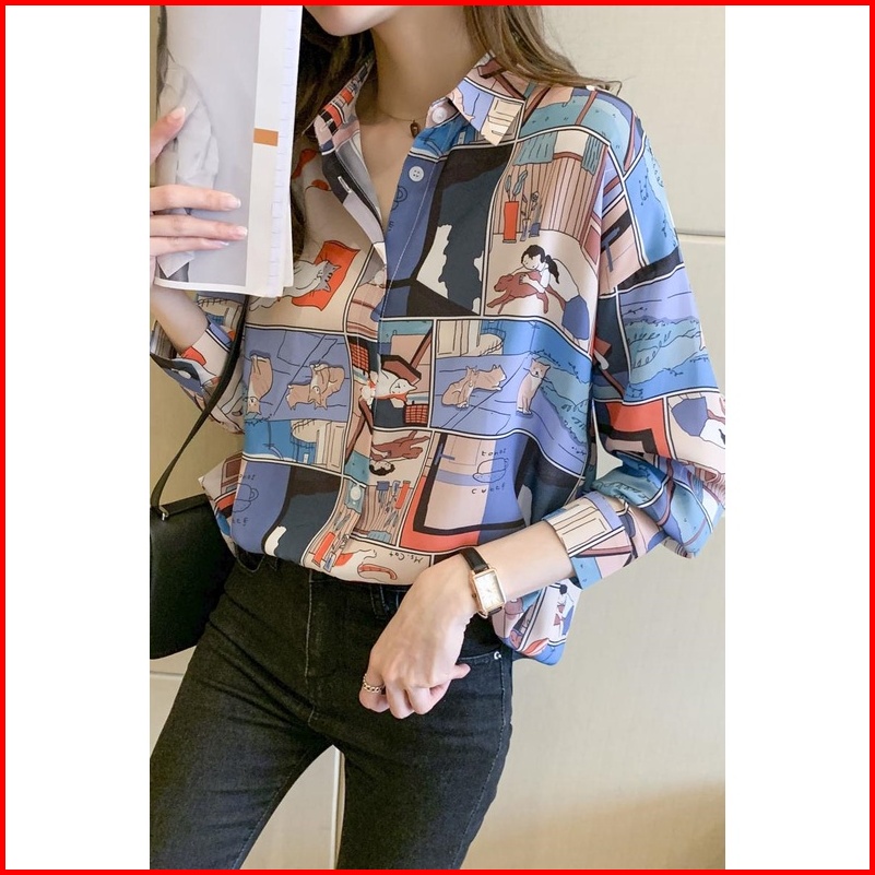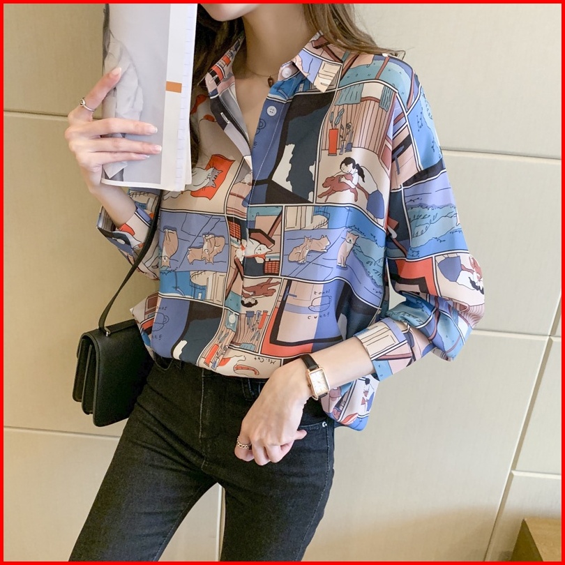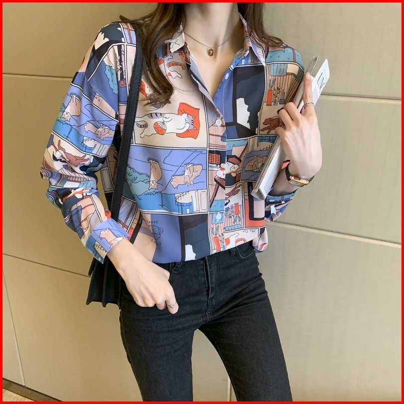 2023 New Fashion Kemeja Wanita Lengan Panjang Motif Kartun Biru Korea Baju Atasan Ol Kerja Santai