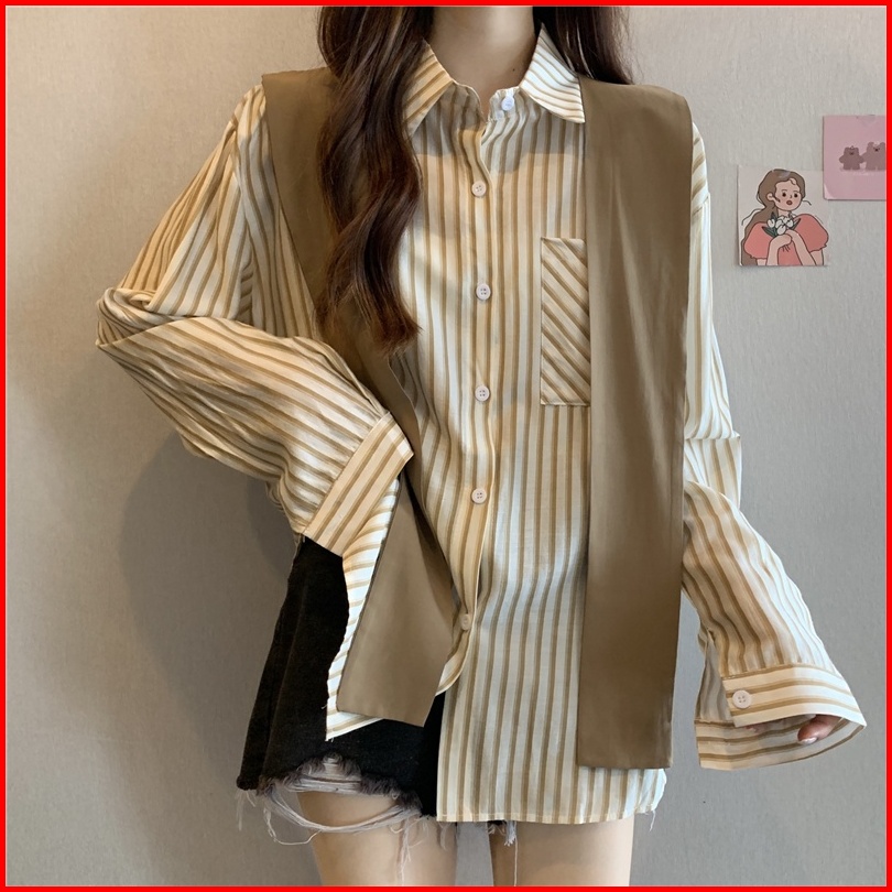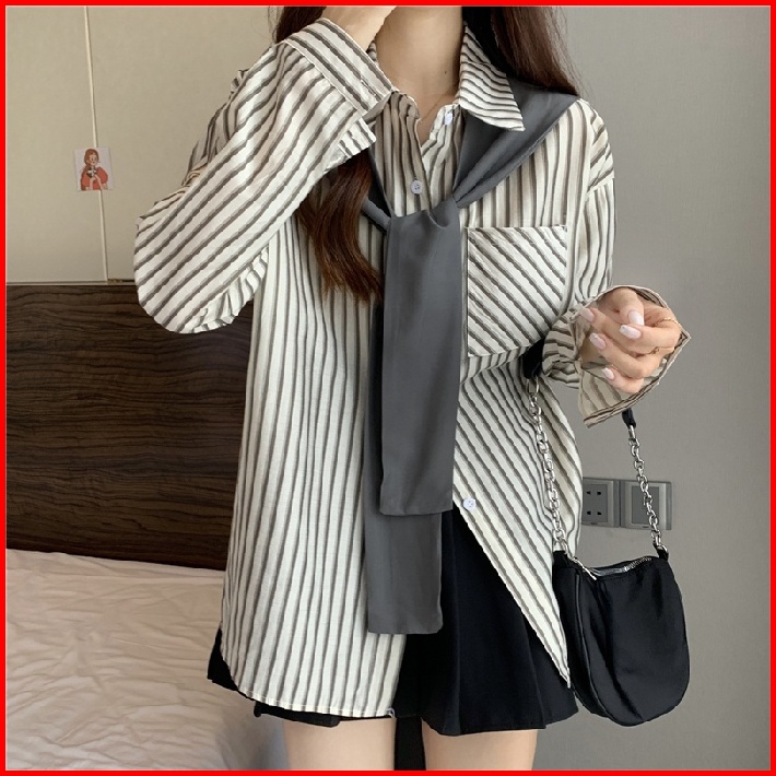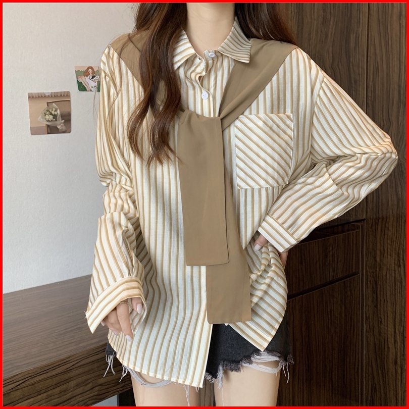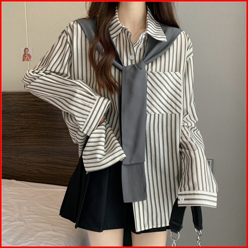 Kemeja Bergaris Lengan Panjang Wanita Gaya Korea Atasan Selendang Berdesain Longgar