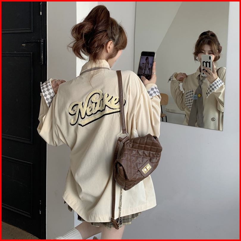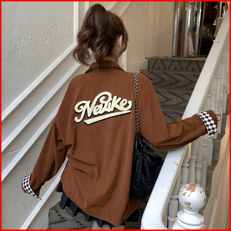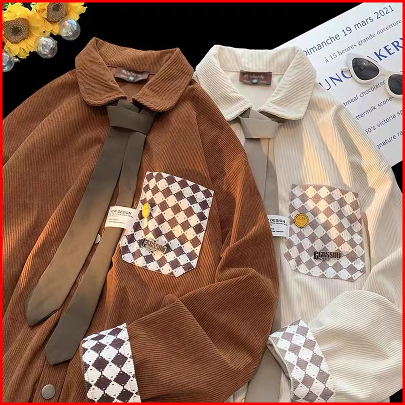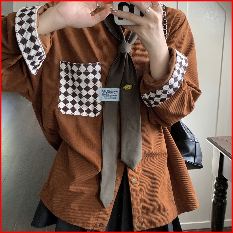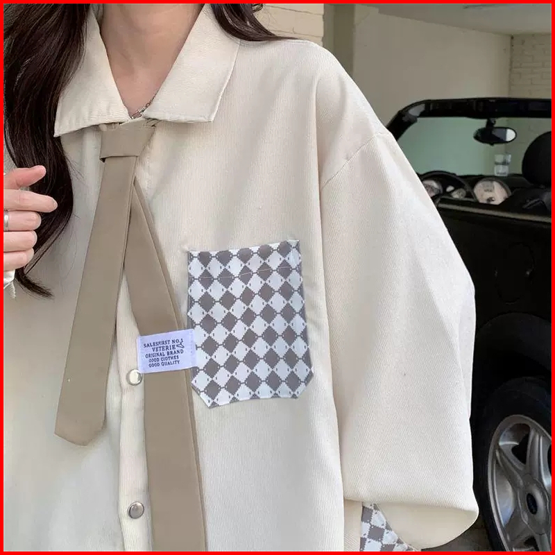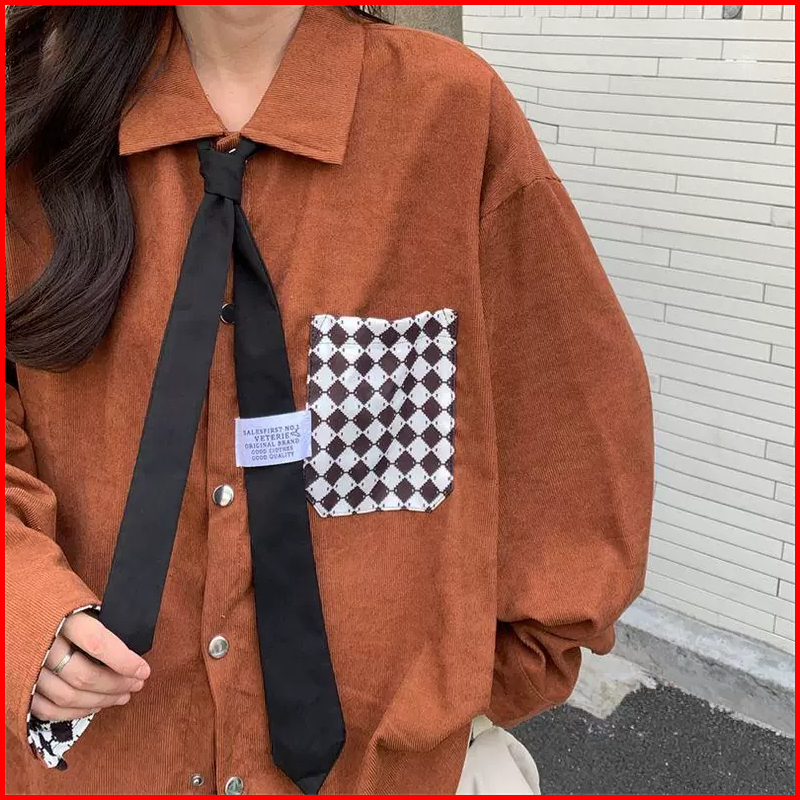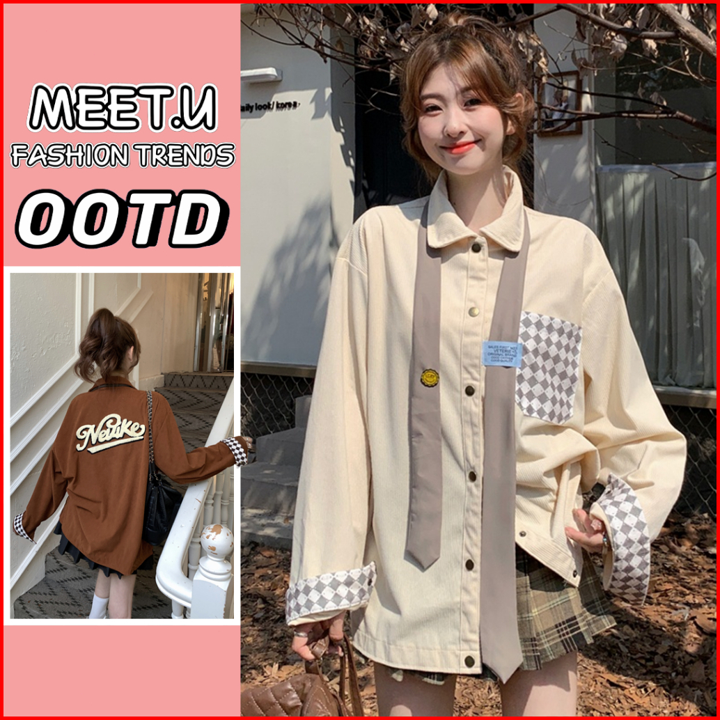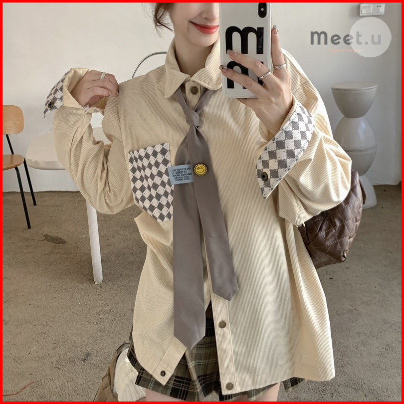Meet.u Kemeja Corduroy Korean Retro Kemeja Wanita Oversize Atasan Lengan Panjang Bonus Dasi Lencana