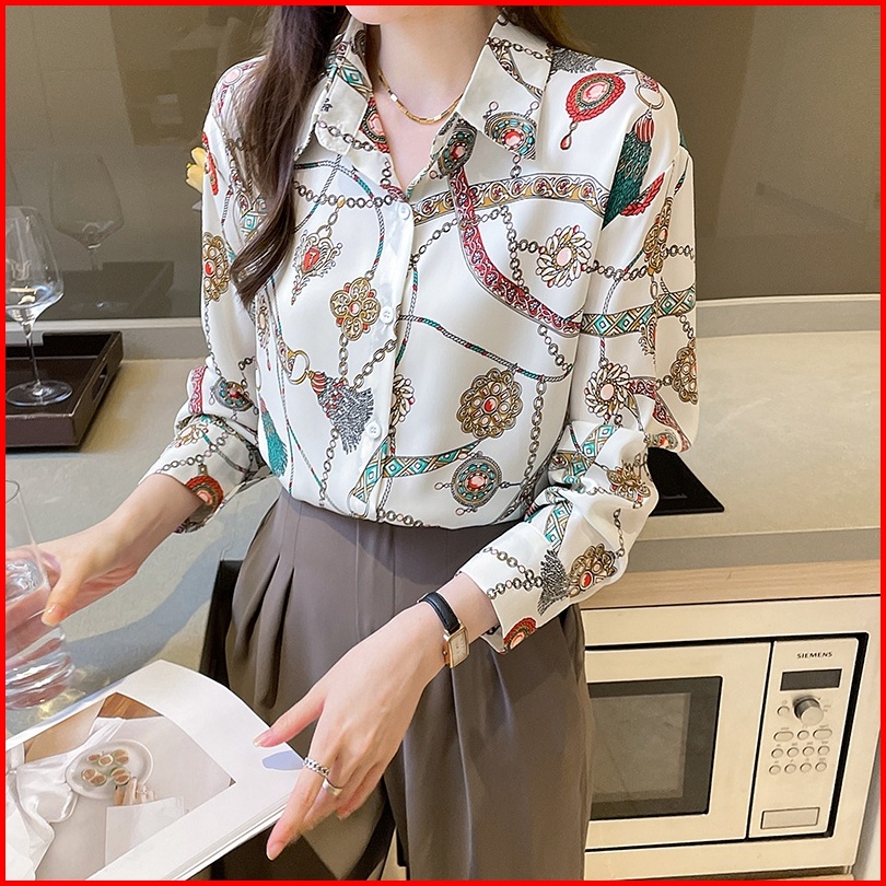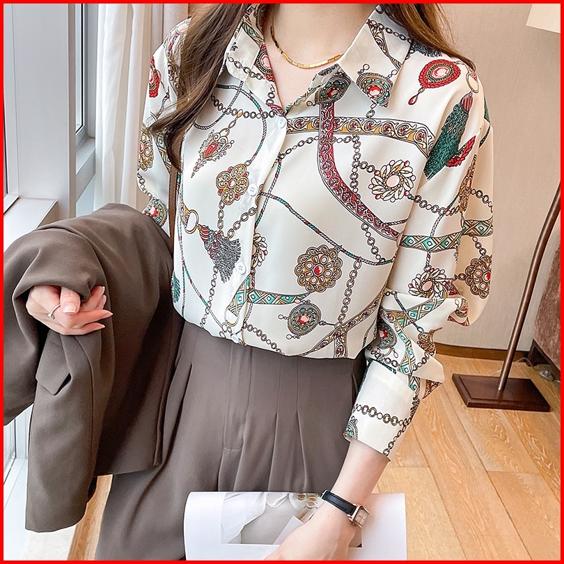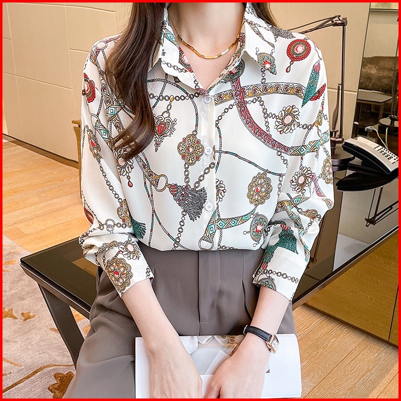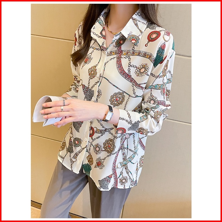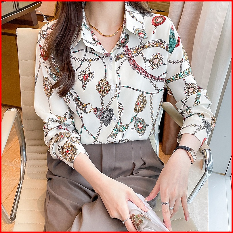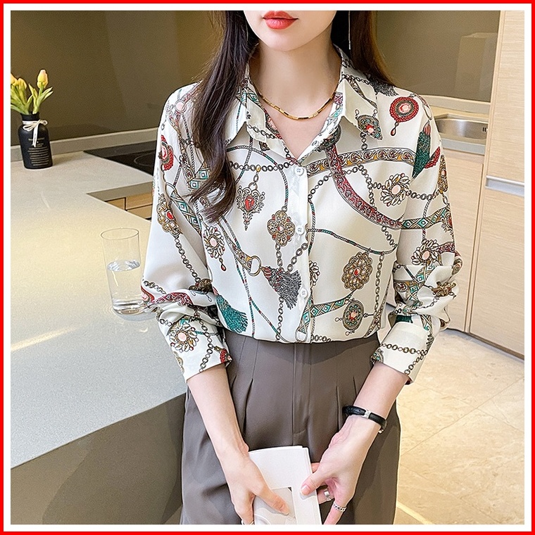 2023 New Fashion Korean Personalized Print Casual Work Long Sleeve Women Shirt Kemeja Wanita Lengan Panjang