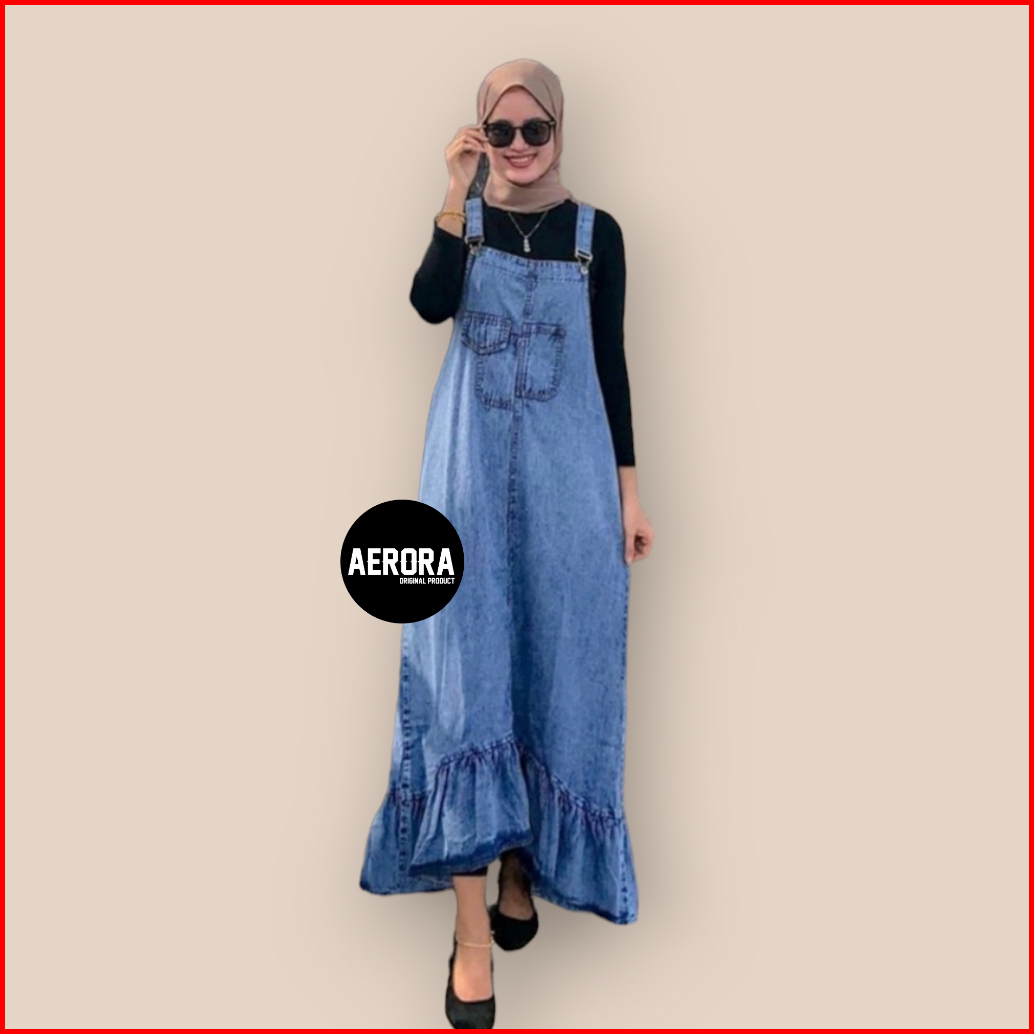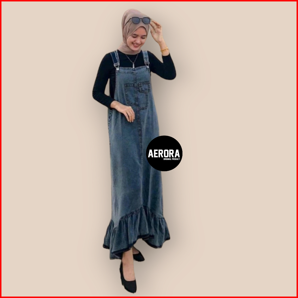 Aerora Baju Kodok Overall Dress Rok Panjang Jeans Wanita Polos Premium Korean Style Janeta Allsize