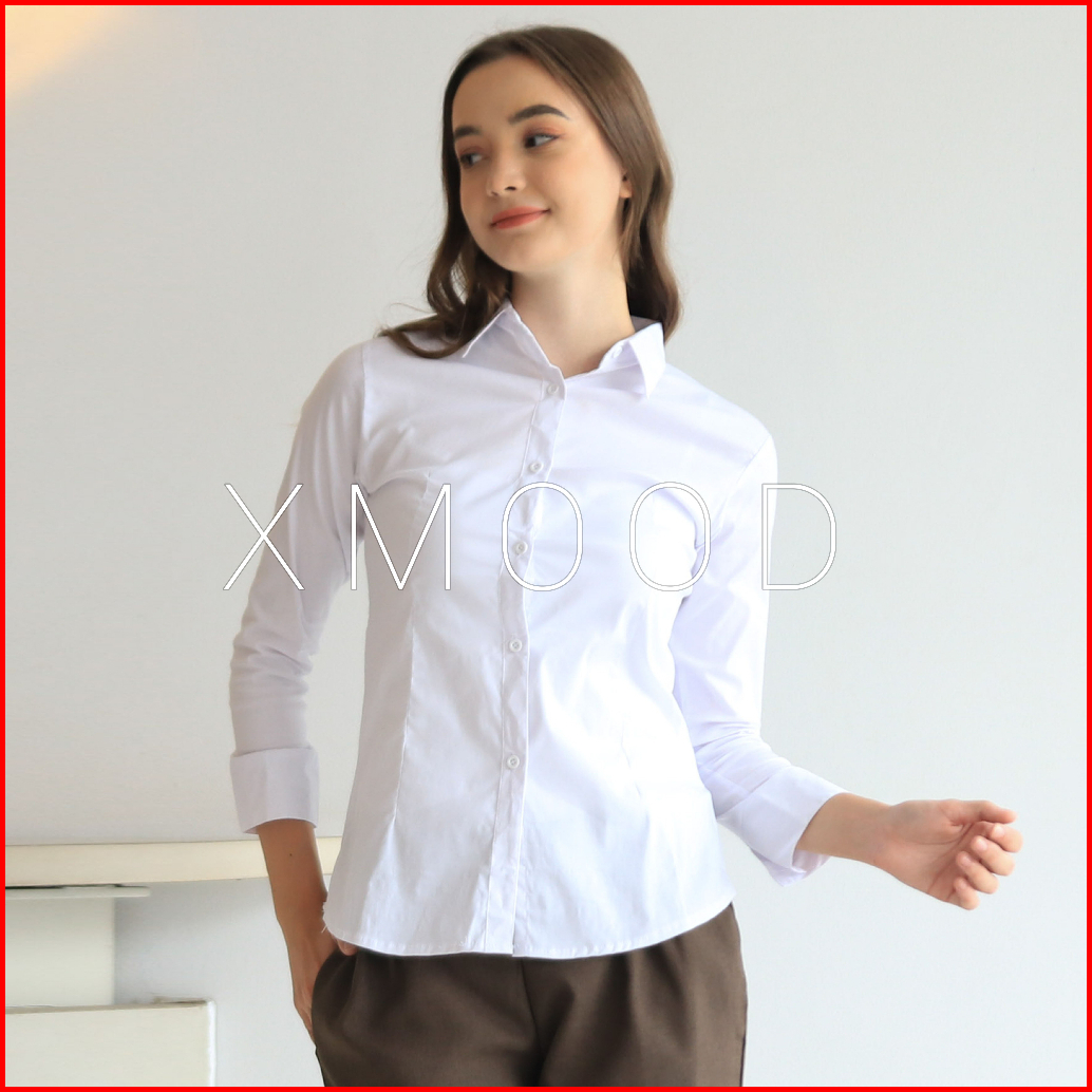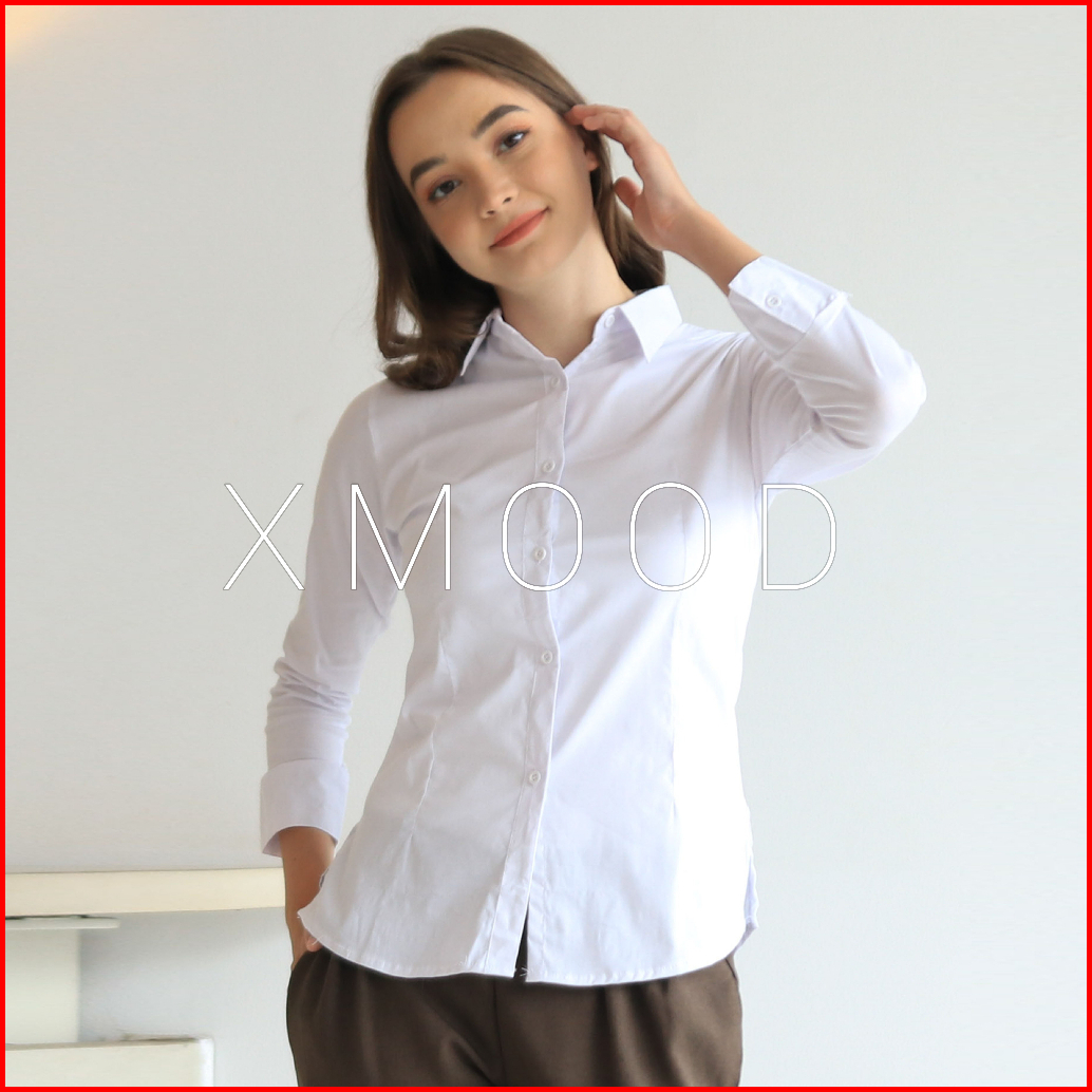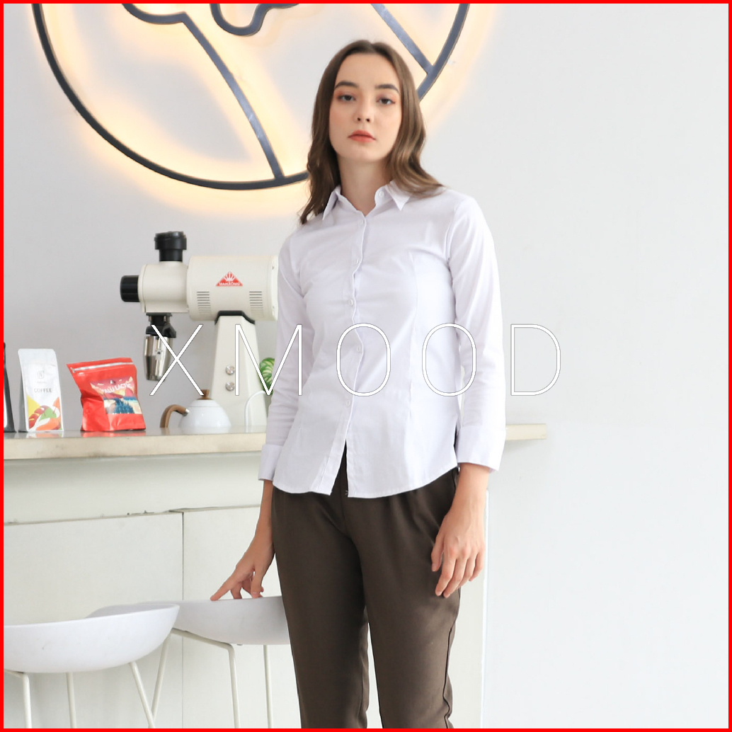 Xmood - Kemeja Polos Wanita Pola Kecil Kemeja Putih Wanita Bahan Katun Stretch