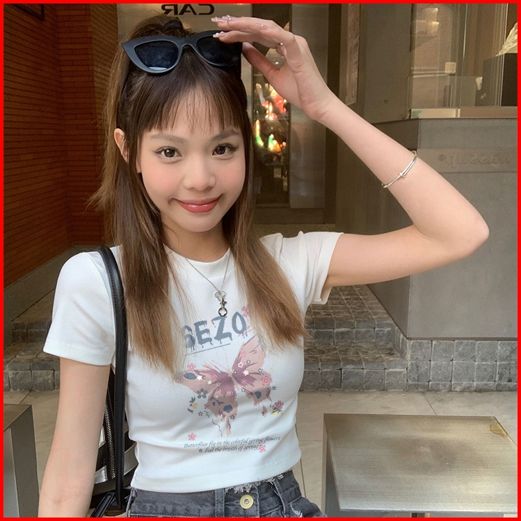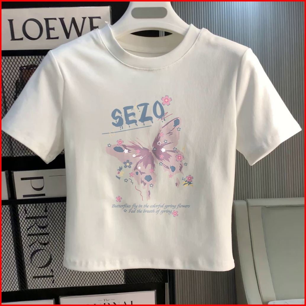 Misco T-shirt Crop Top Lengan Pendek Kaos Wanita Crop Top Simple Pink Butterfly Kaus Crop Wanita Baju Atasan Wanita Terb