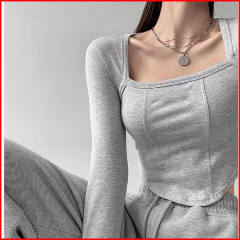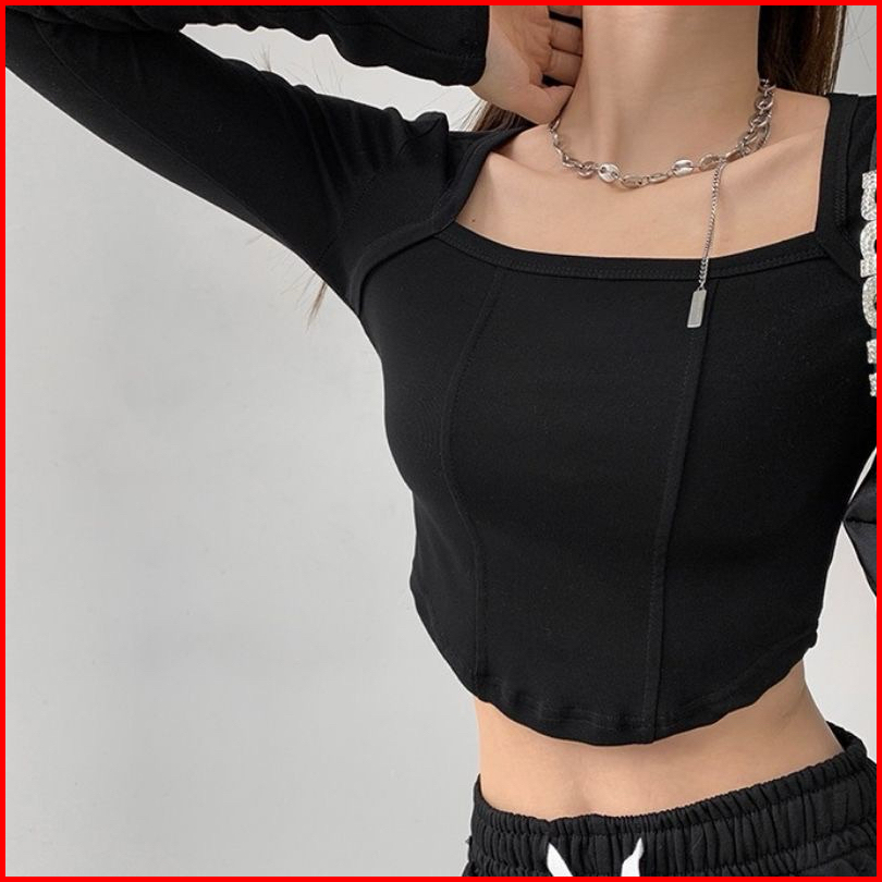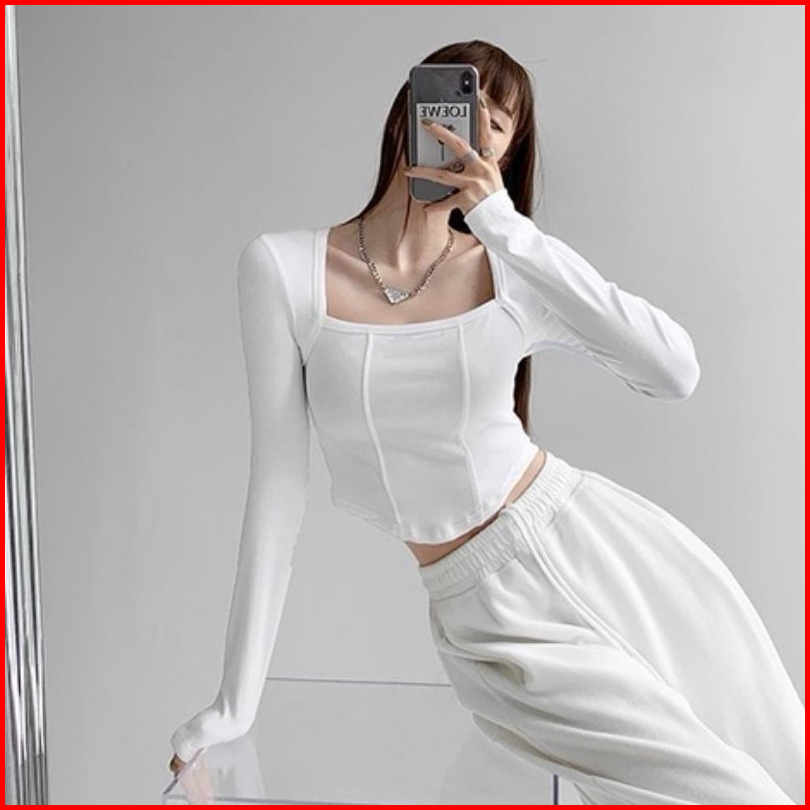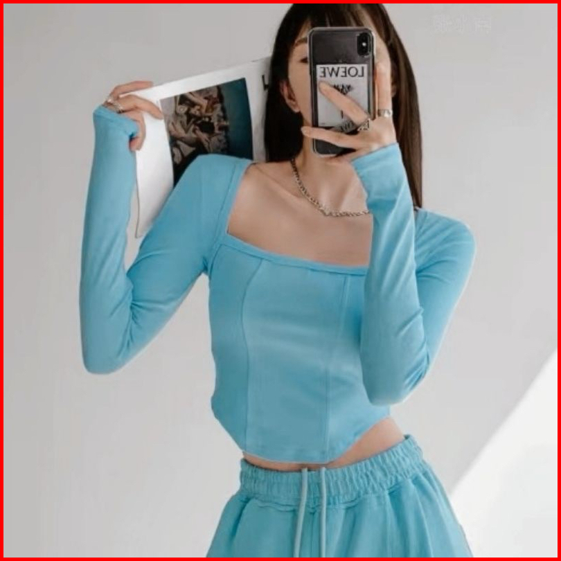 Selver - Square Neck Long Sleeve Crop Top Rib Premium Korean Style S M L Xl