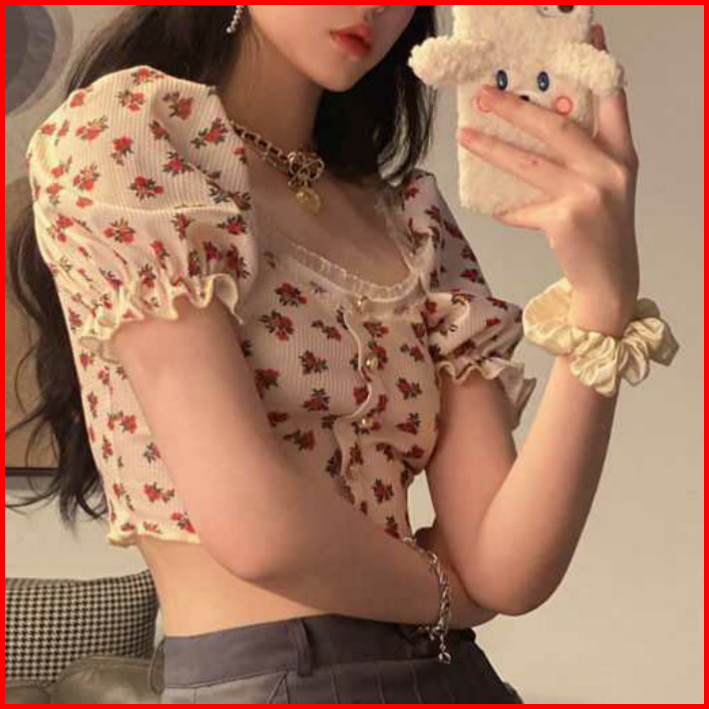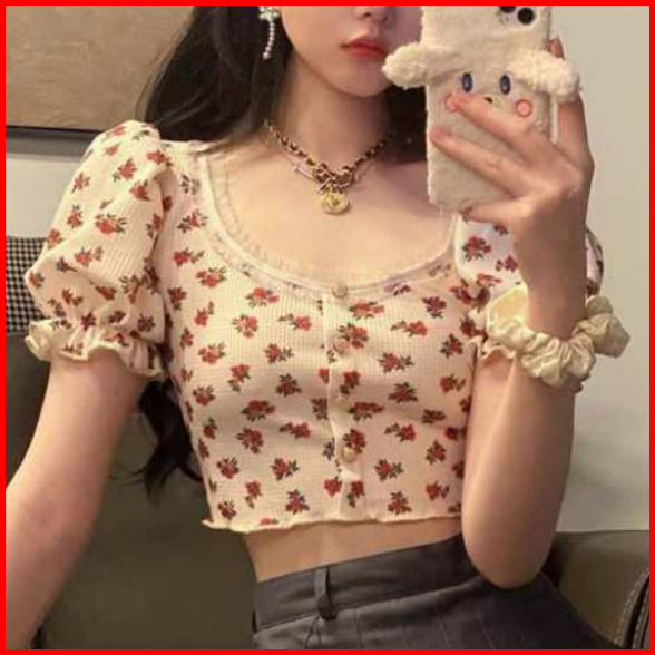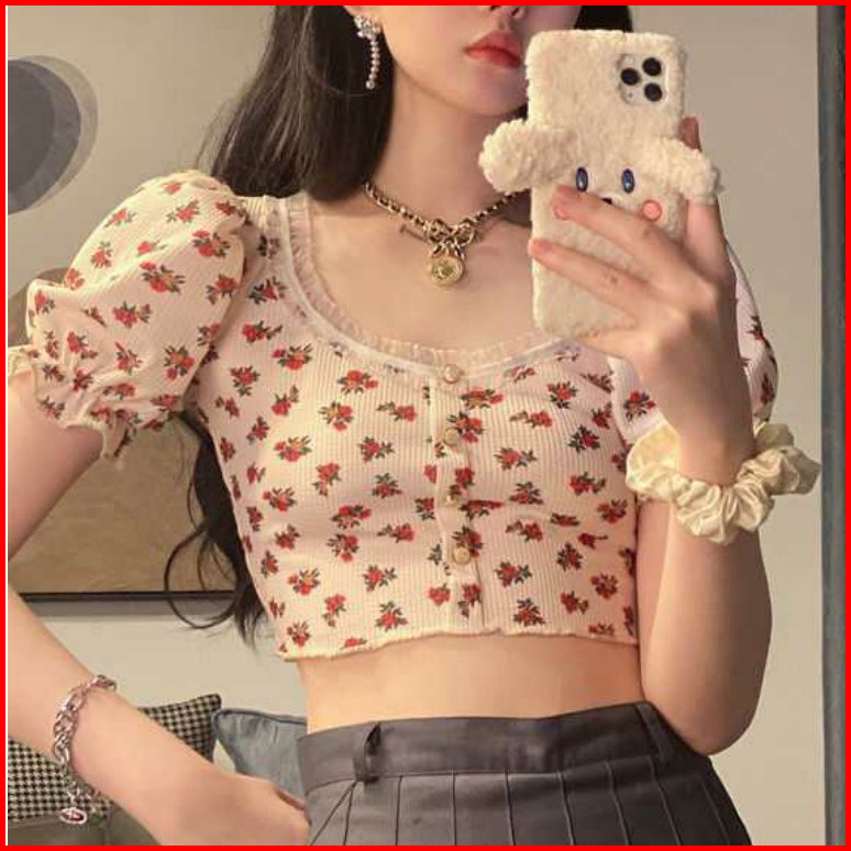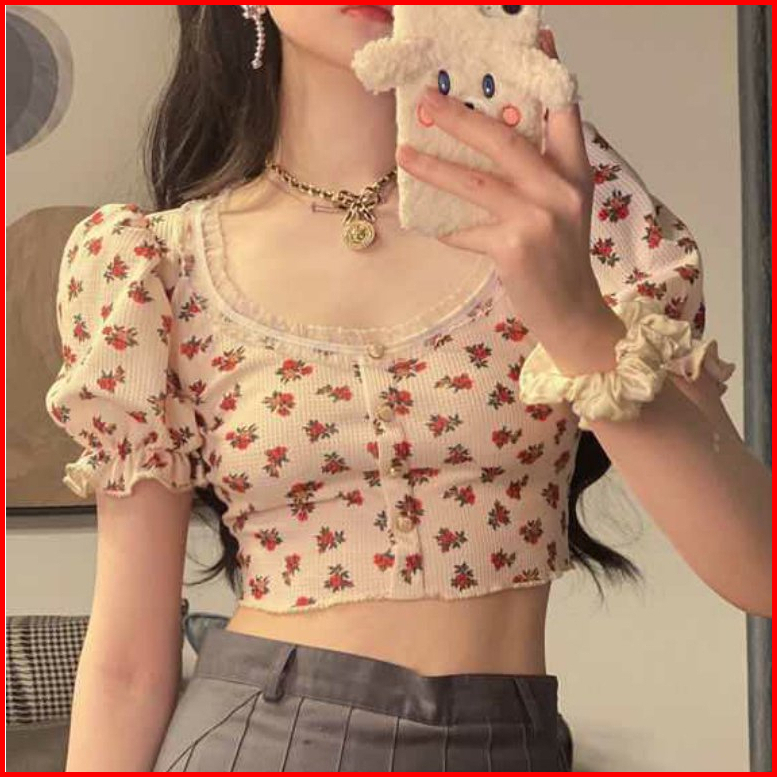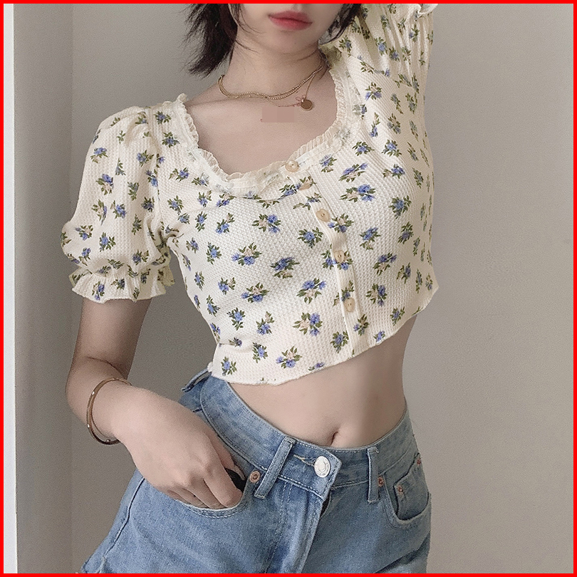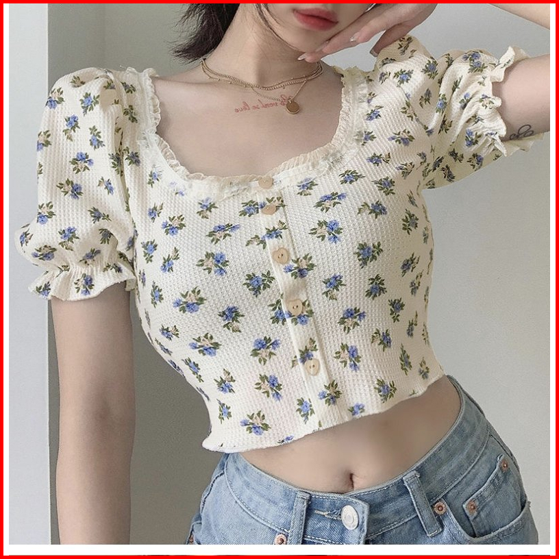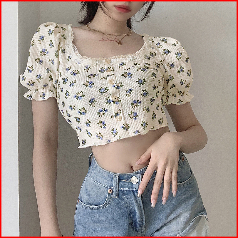 Square Neck Short Puff Sleeve Floral Print Button Down Crop Top 2933 S M L