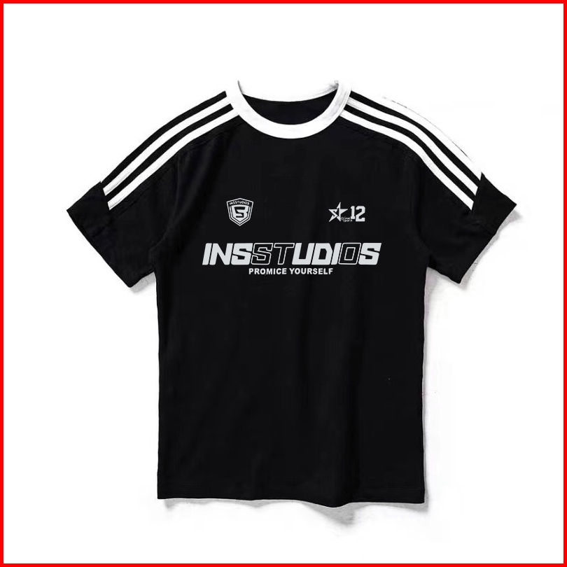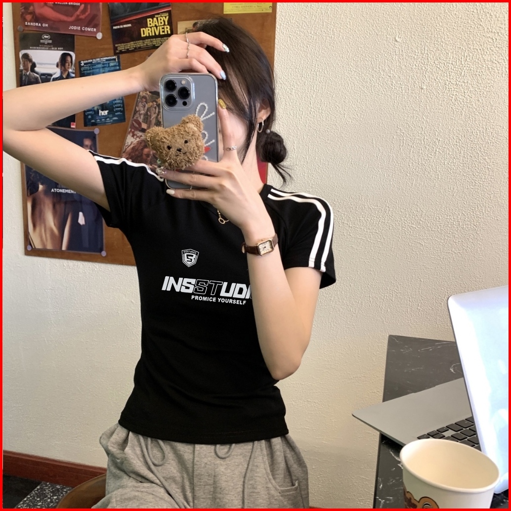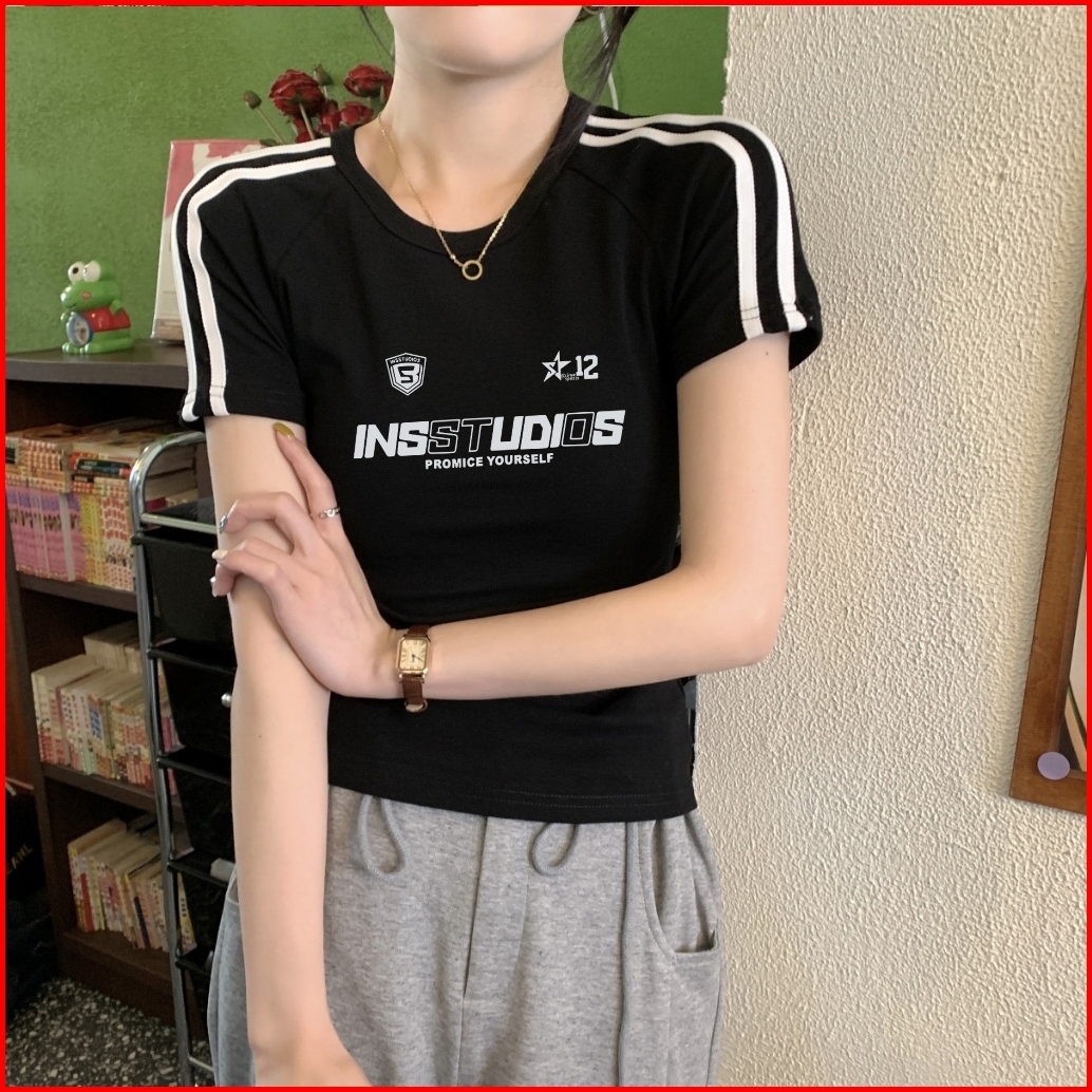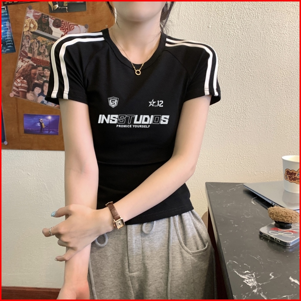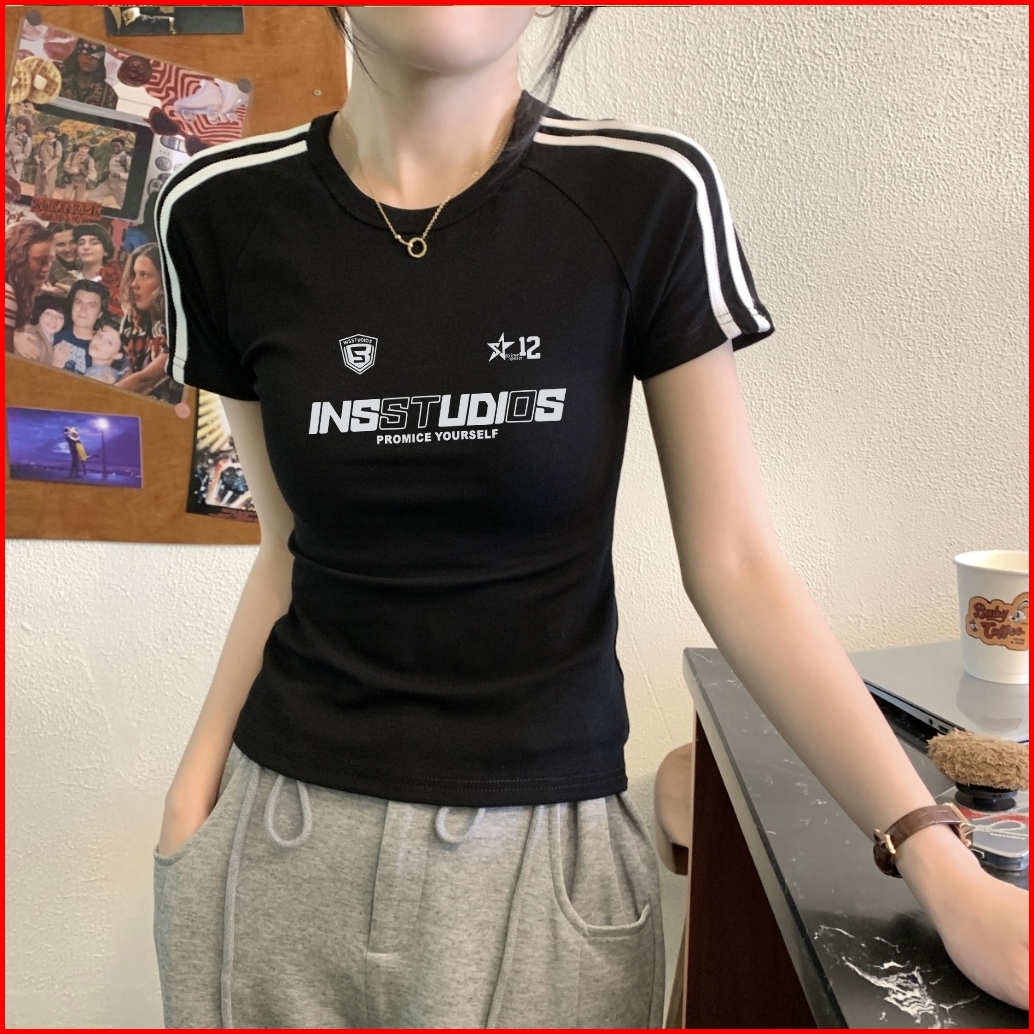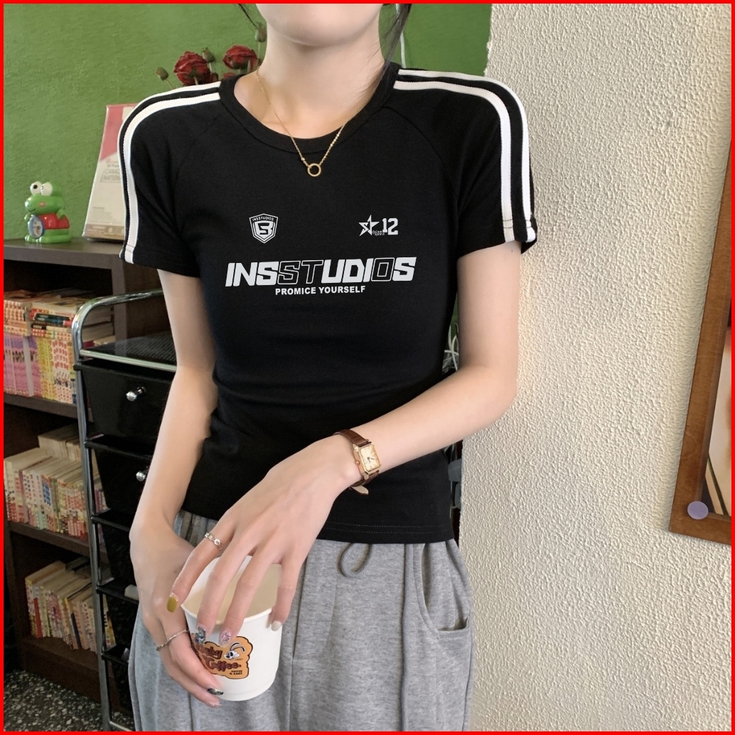 American Vintage Kaos Wanita Lengan Pendek Hitam Stripe Lengan Raglan Causual Oversize Kekinian Premium T-shirt Slim Kao