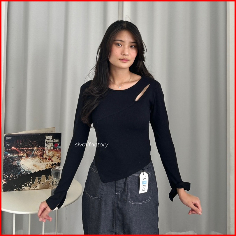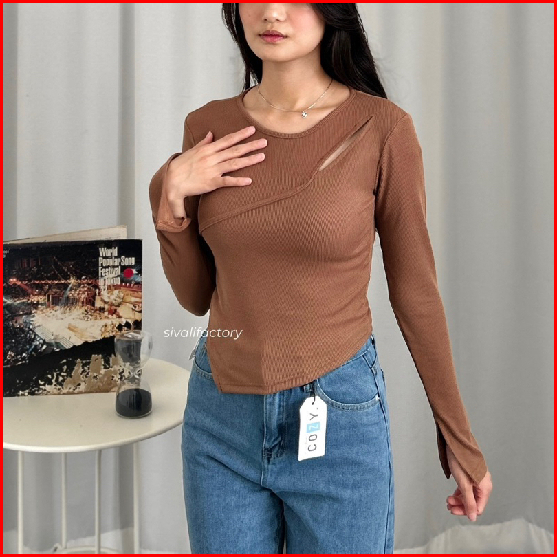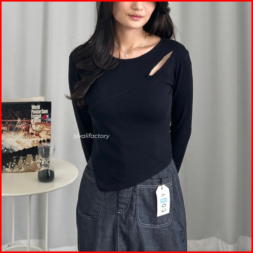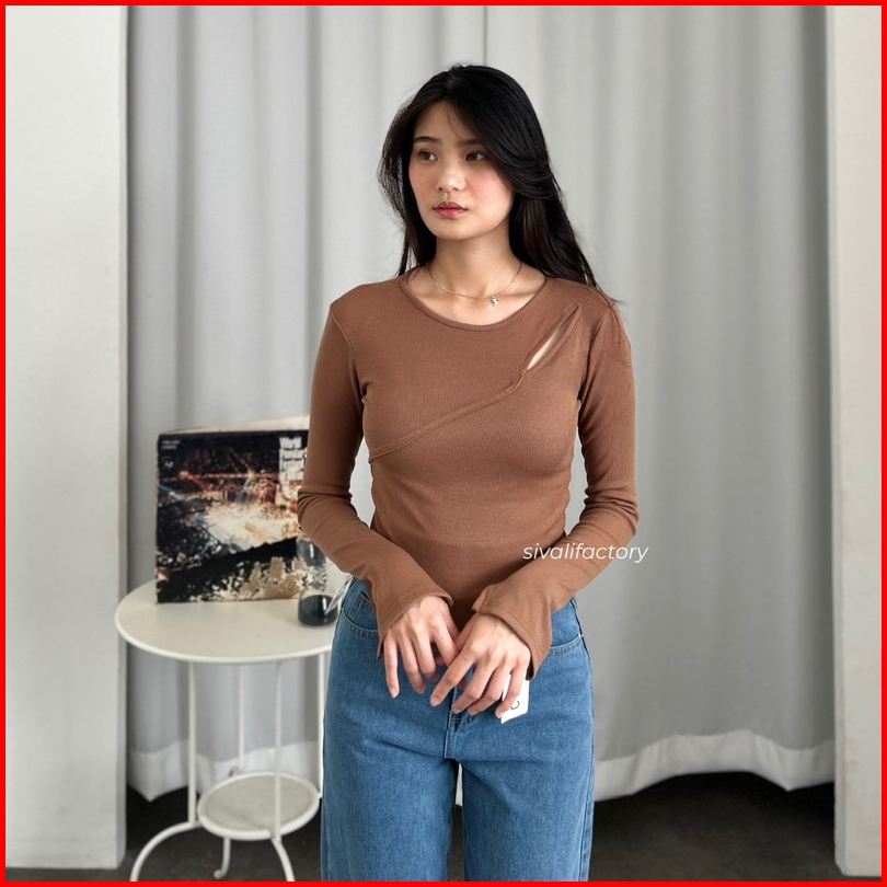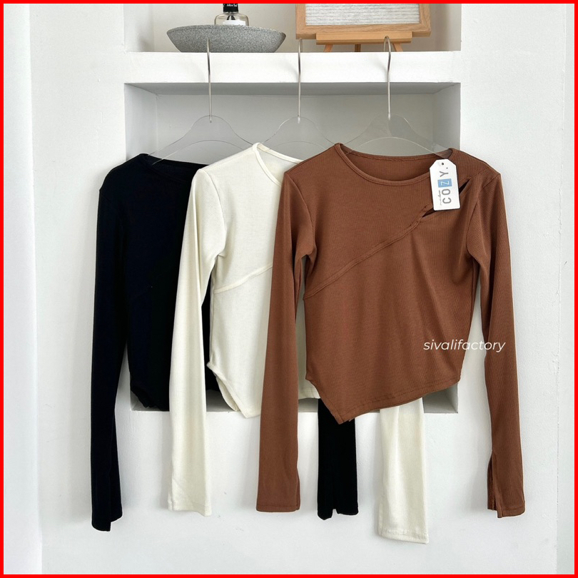 Sivali Haewon Top Atasan Knit Wanita Lengan Panjang Korean Top Cut Out Crop Top