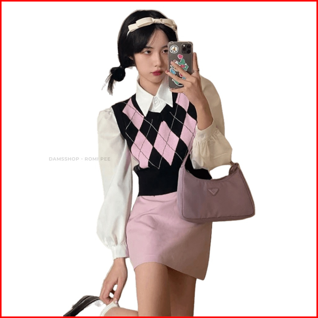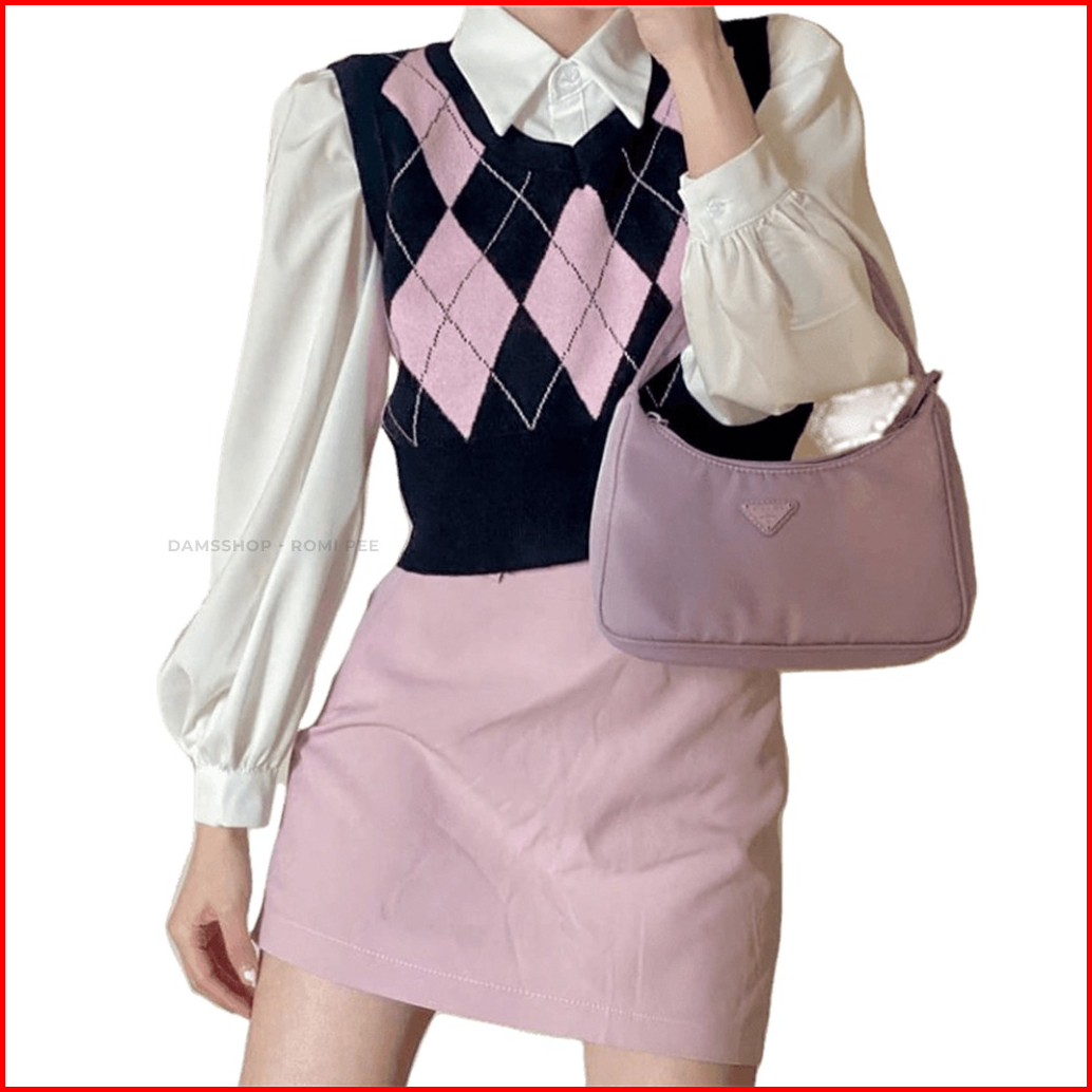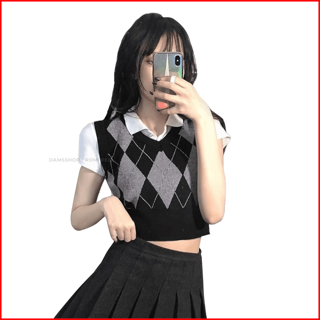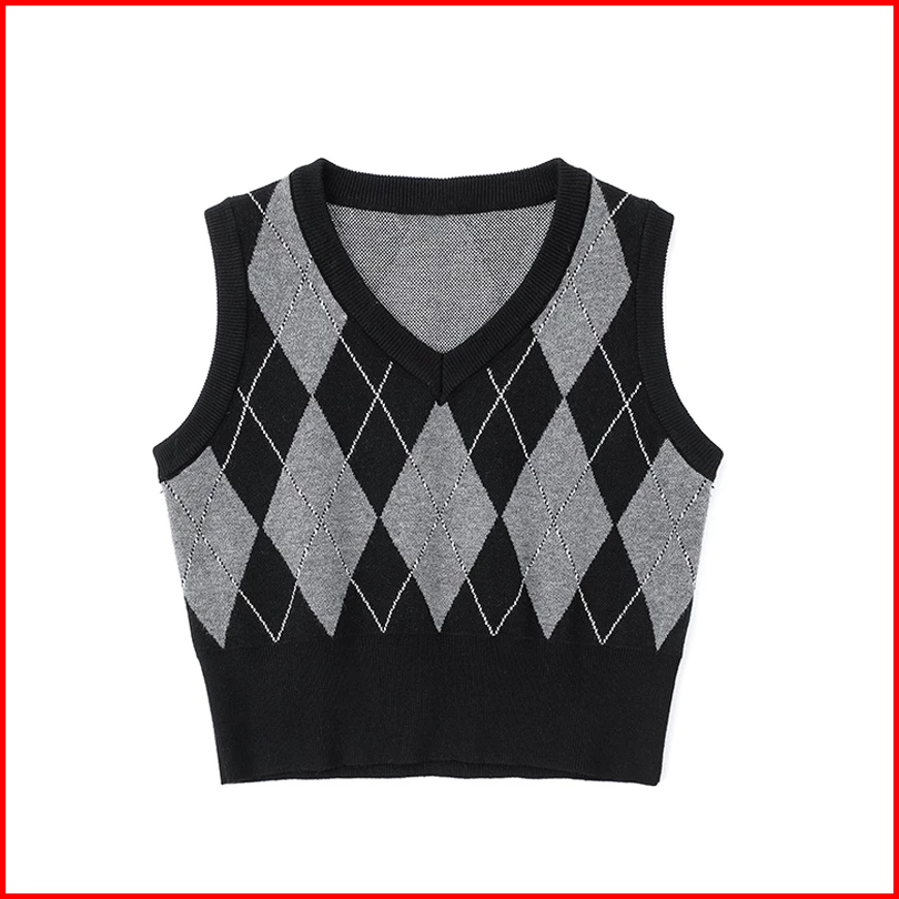 Tempat Rajut Komputer Sweater Vest Rajut Crop Wanita Kotak Silang Styke Korean