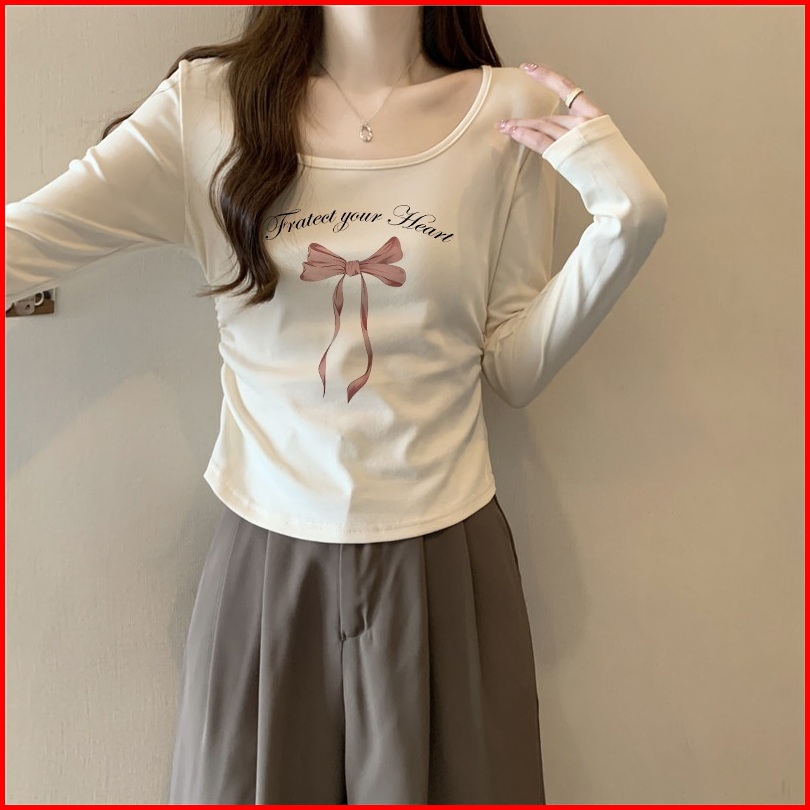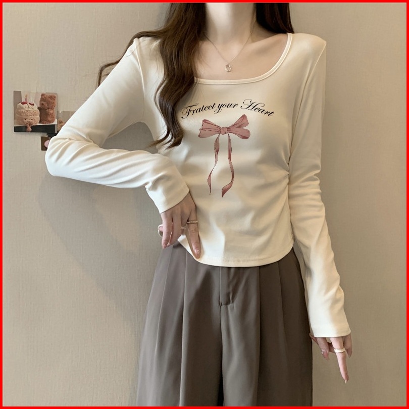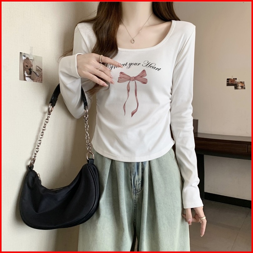 Misco Crop Top Longsleeve Y2k Kaos Busur Sederhana Lengan Panjang Kaos Warna Putih Kaos Crew Neck Dongdaemun Korea Selat